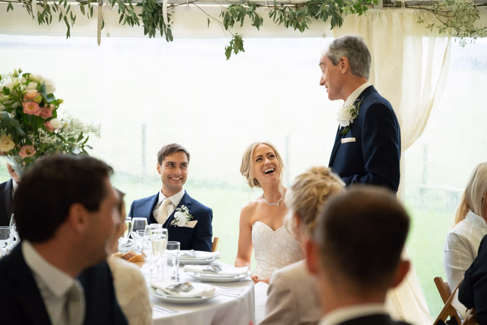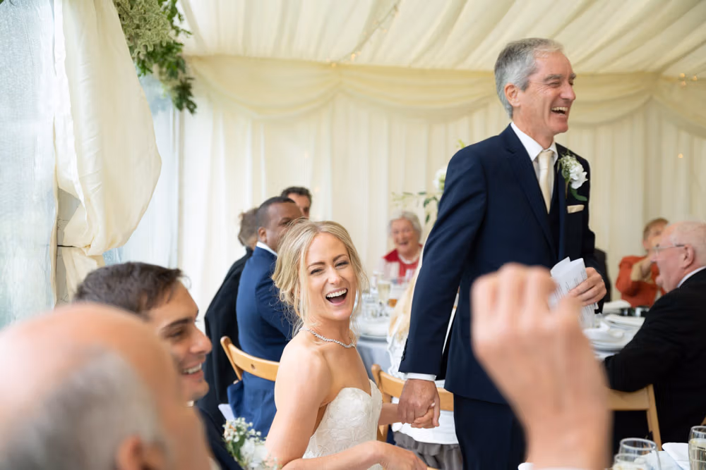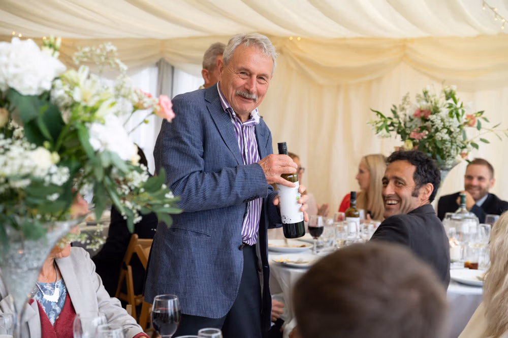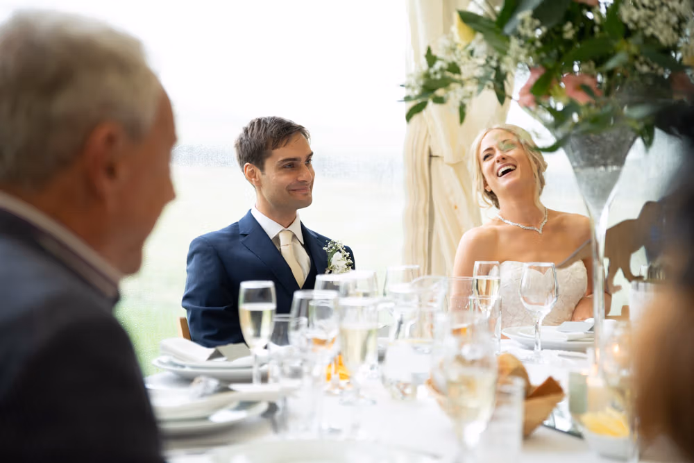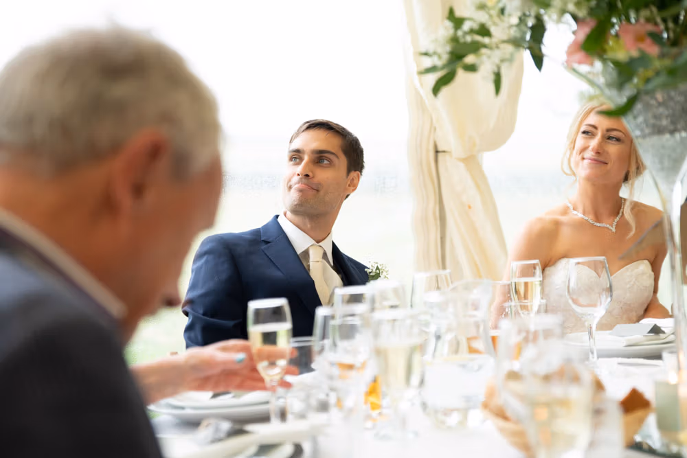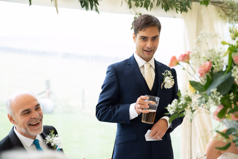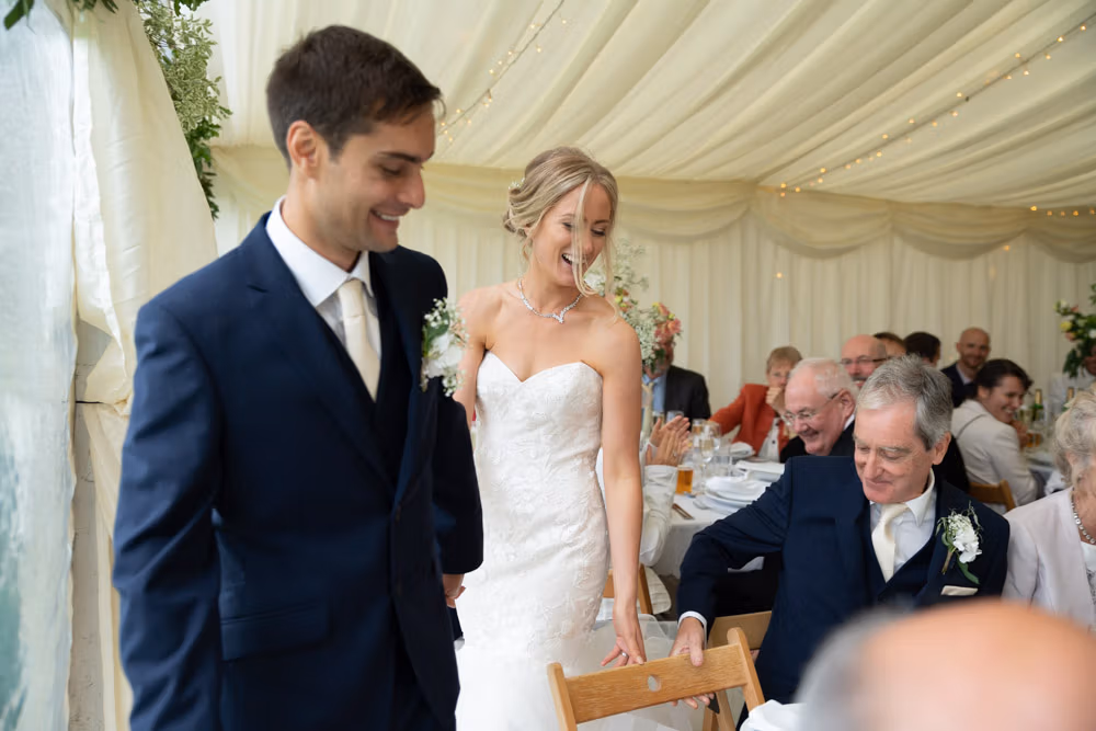 With the marquee set below the barn, the wedding breakfast at The Chilli Barn felt warm, relaxed, and full of atmosphere. Glasses clinked, stories were shared, and the room filled with laughter as friends and family gathered together.