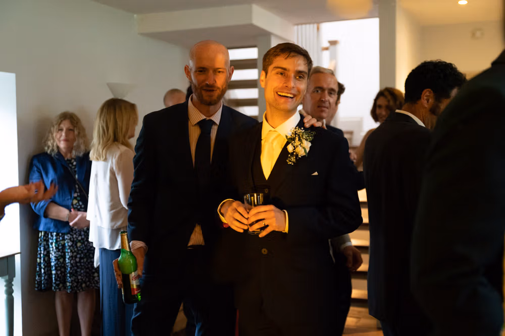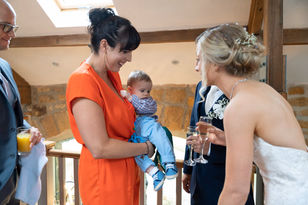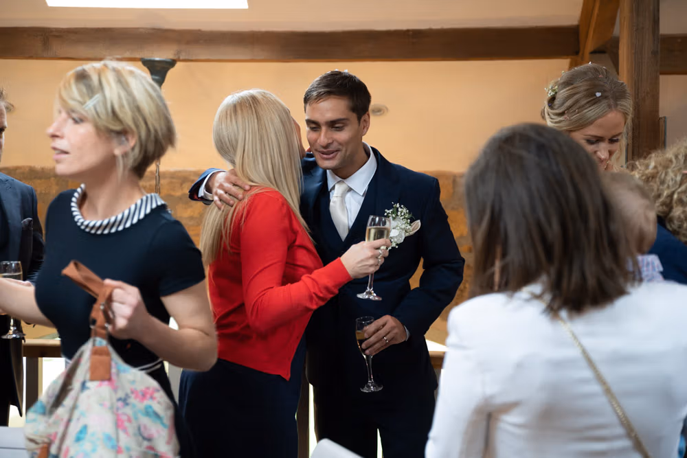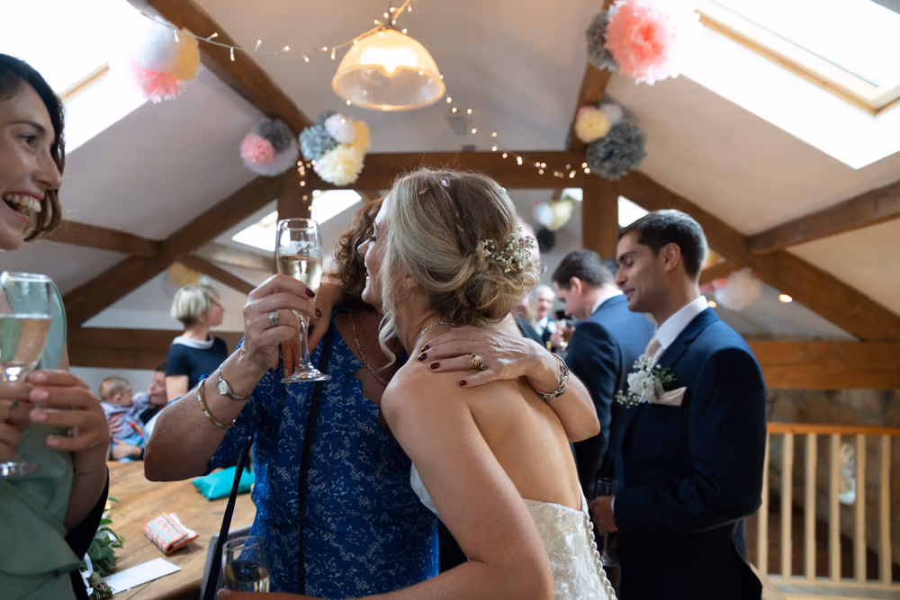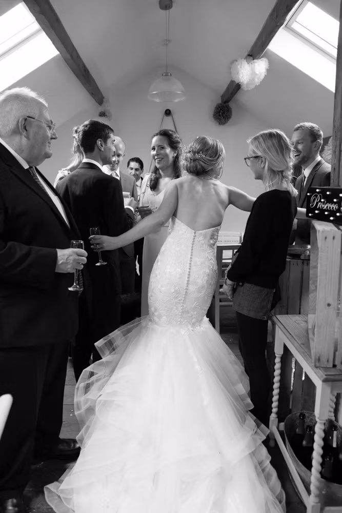 After the ceremony, we moved upstairs into the barn where guests gathered for relaxed hellos and natural portraits, with the marquee set below ready for the wedding breakfast.