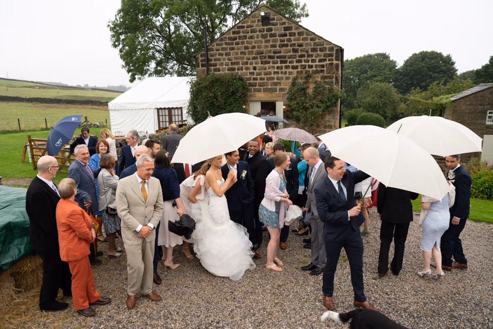 It naturally followed on from the ceremony and flowed into the next part of the day as Helen stepped into her wellies and, with umbrellas from the groomsmen, we headed outside into a warm summer shower for some planned portraits with their white horse, just beyond the fields near Chevin Forest.
