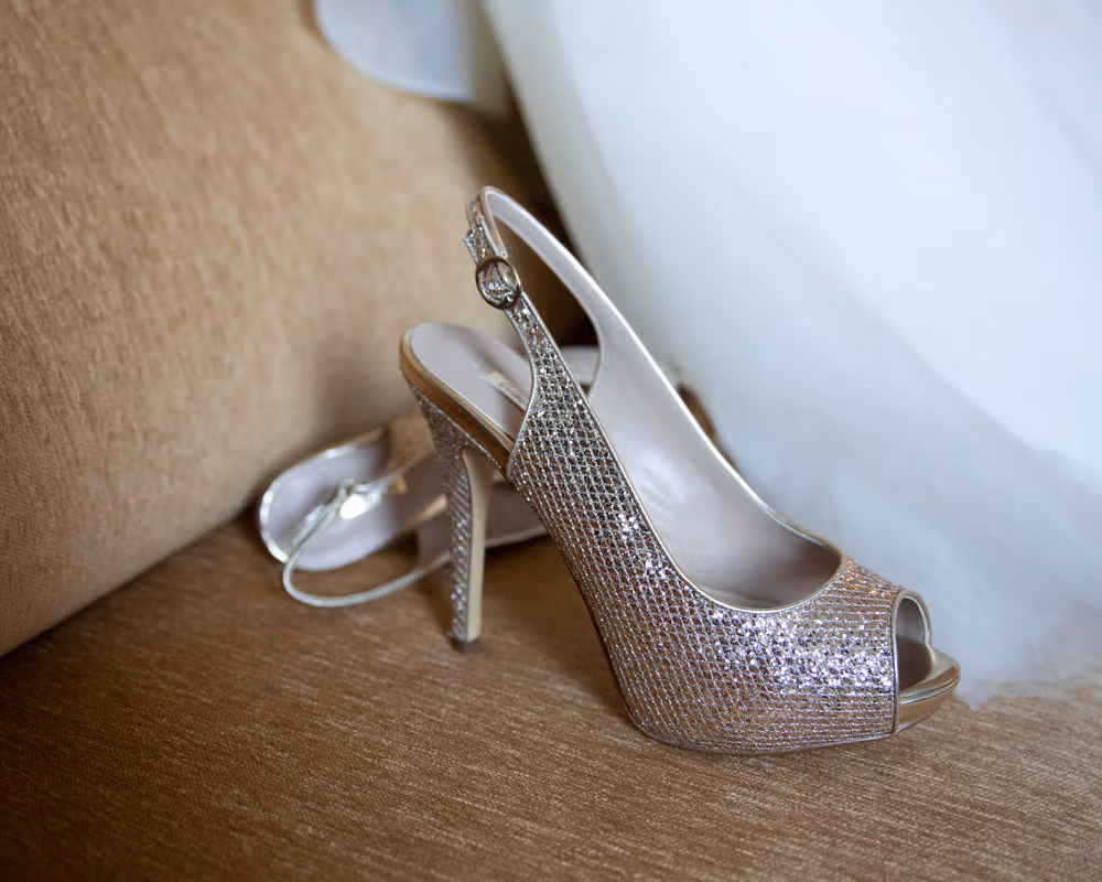 These sparkly pink heels rested near the dress as it flowed gently over the