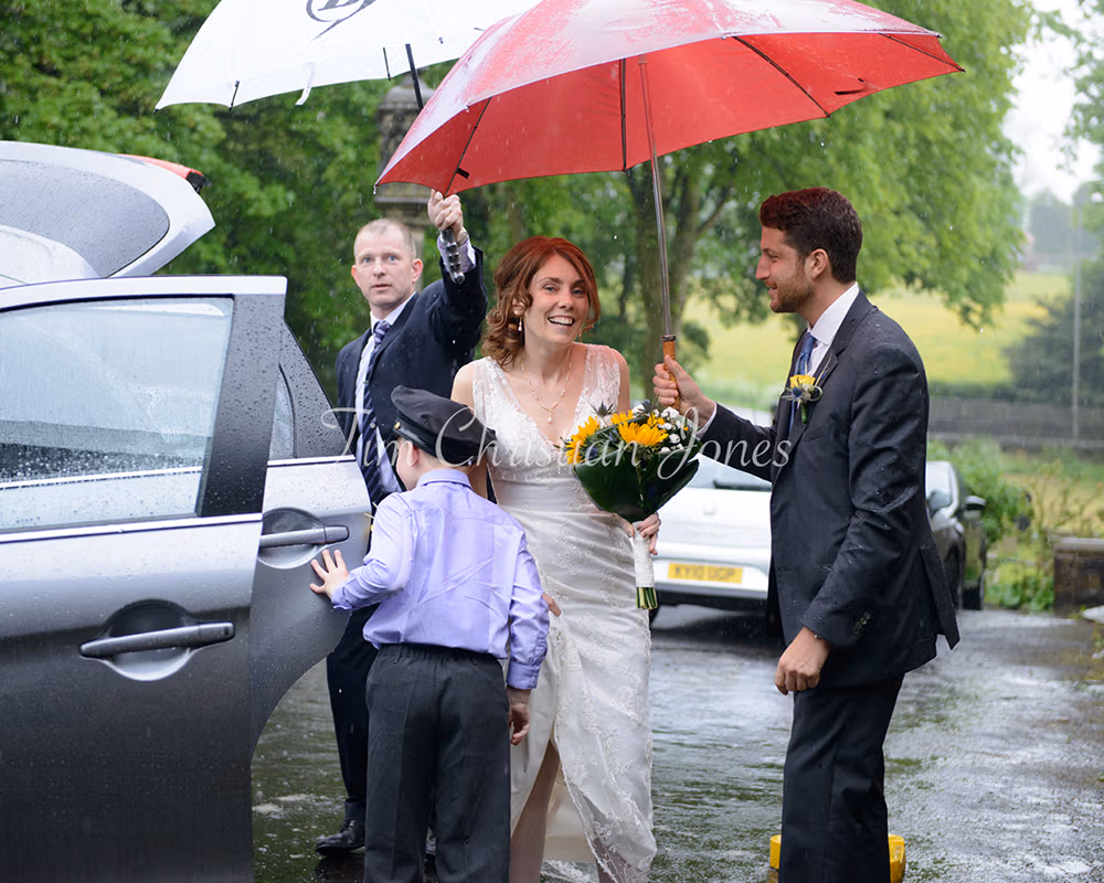 After the church ceremony, rain rolled across Pendle Hill as we arrived at Barley Village Hall. The plan had always been to step out for portraits, but the weather made the couple pause. We slowed things down, talked it through, and decided to stick with it. With a groomsman holding umbrellas and plenty of laughter in between, the photographs became about the experience as much as the view. The rain stayed — and so did the moments that mattered.