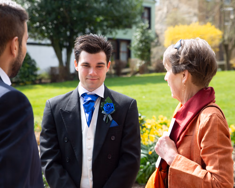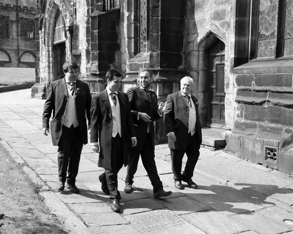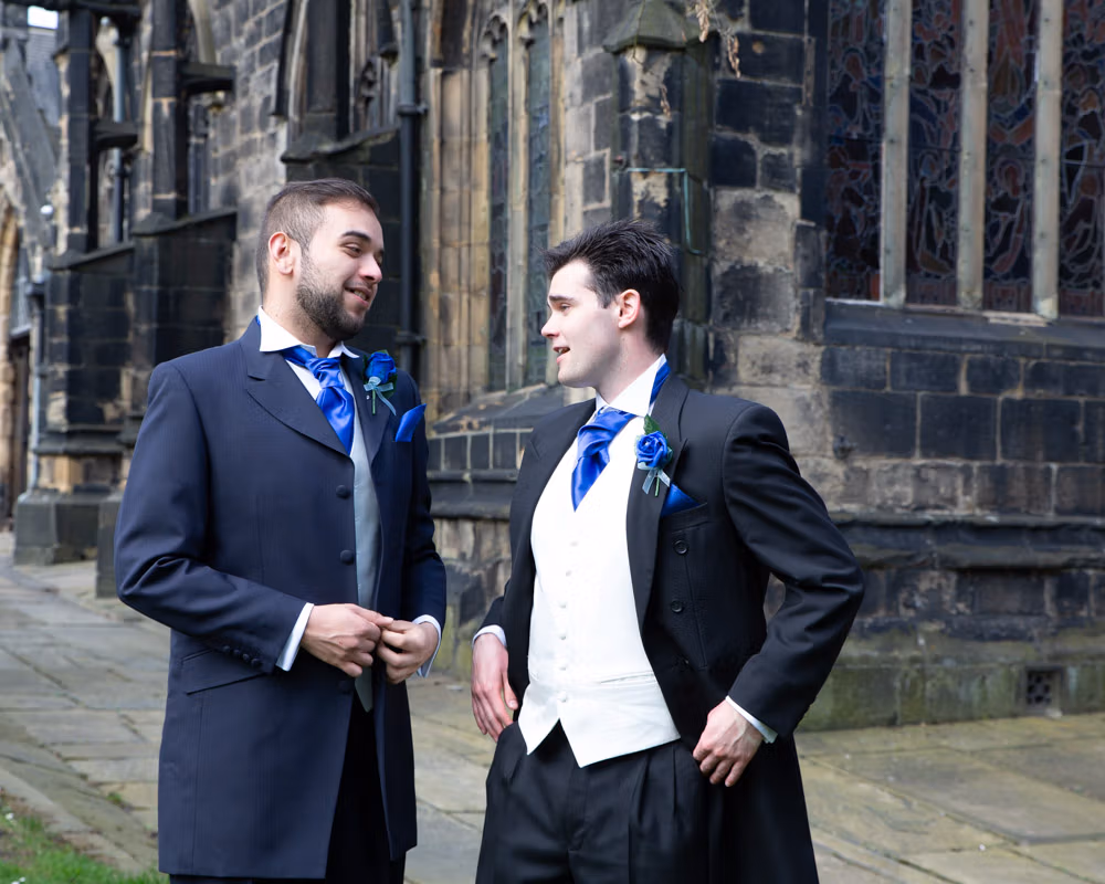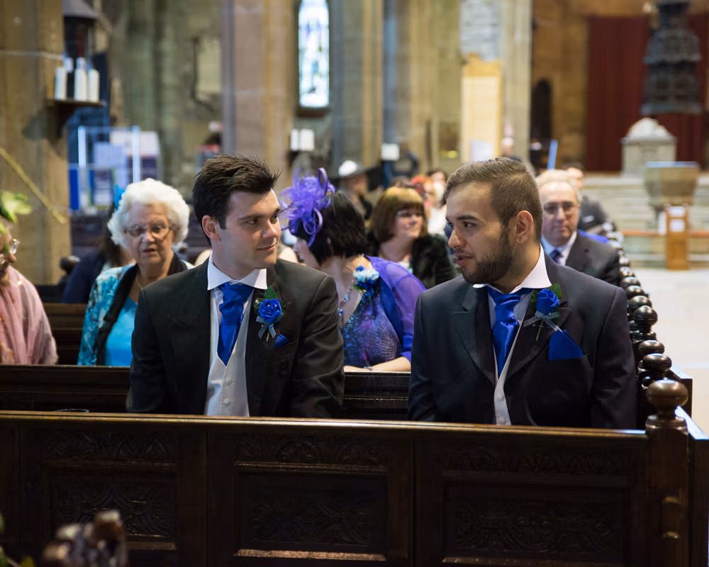 Inside Halifax Minster, the light filtered through the stained glass as guests took their seats. The groom and best man waited quietly, sharing a moment before the arrival of the bride.
