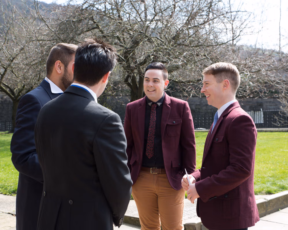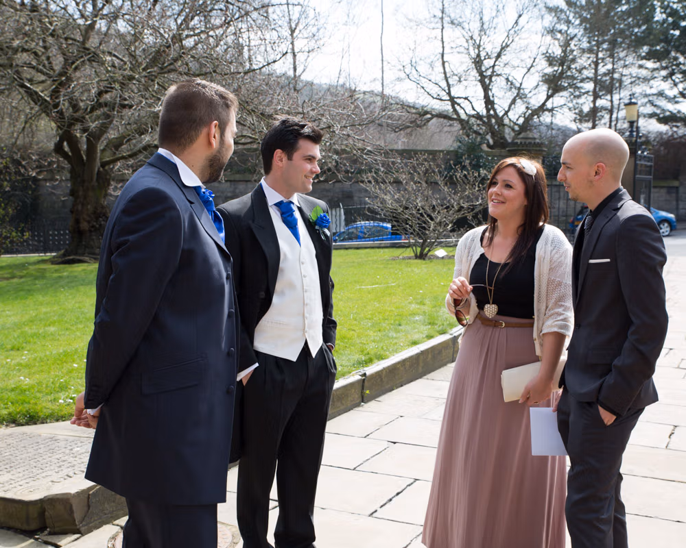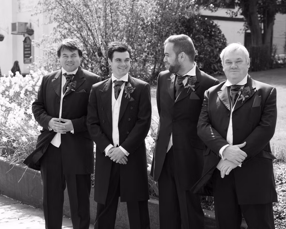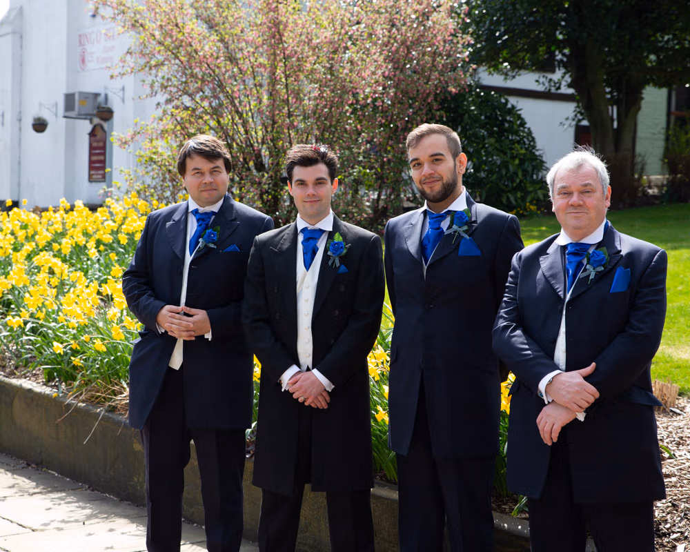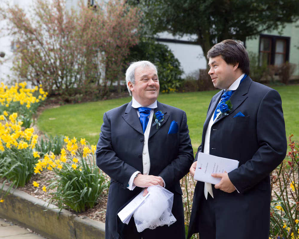 Inside Halifax Minster, the light filtered through the stained glass as guests took their seats. The groom and best man waited quietly, sharing a moment before the arrival of the bride.