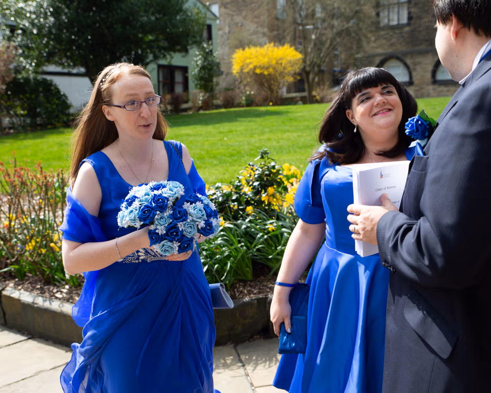 Soon, familiar hugs and happy chatter filled the space outside. The groom and best man greeted friends as more guests arrived, many wearing blue — ties, dresses, even the flowers echoed the tone of the day.