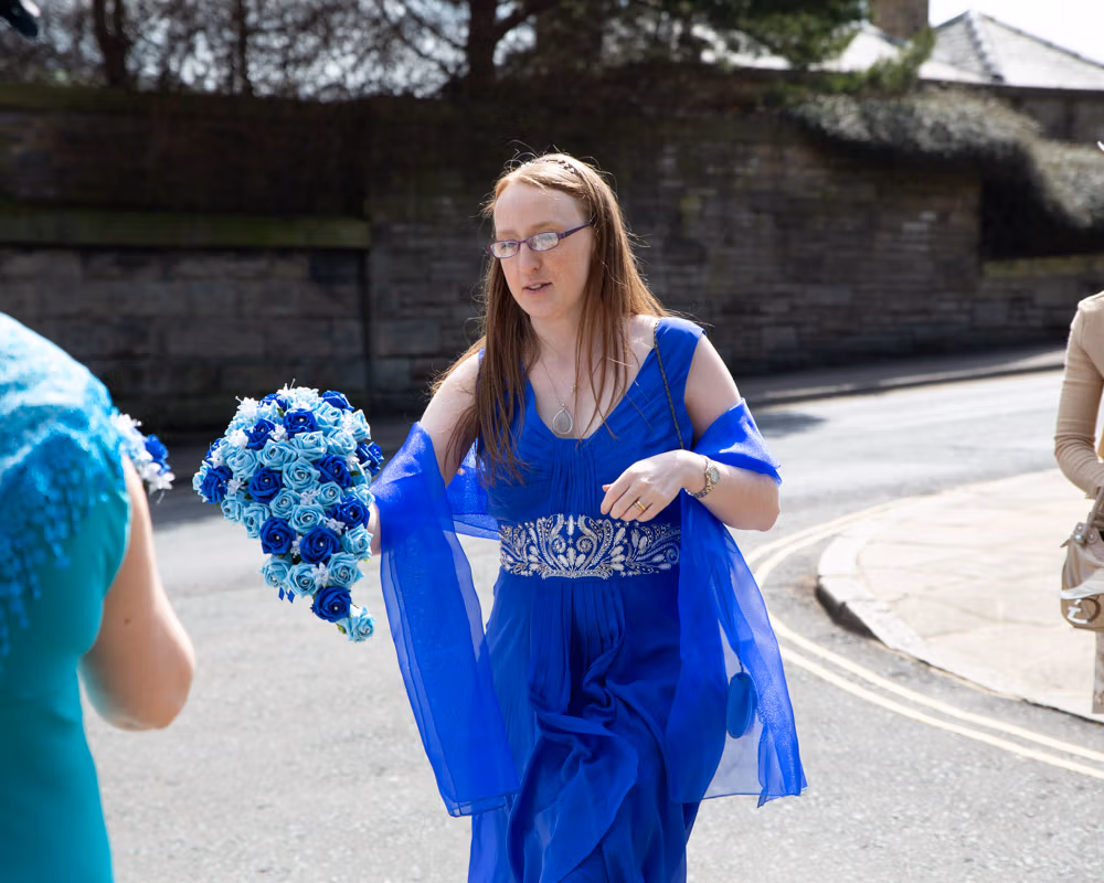Claire’s sister and the other bridesmaids arrived first, followed by Claire herself — pulled up in a small car, steadying herself before making the short walk with her father. She was radiant. Despite living with MS, she was determined, smiling, and full of grace.