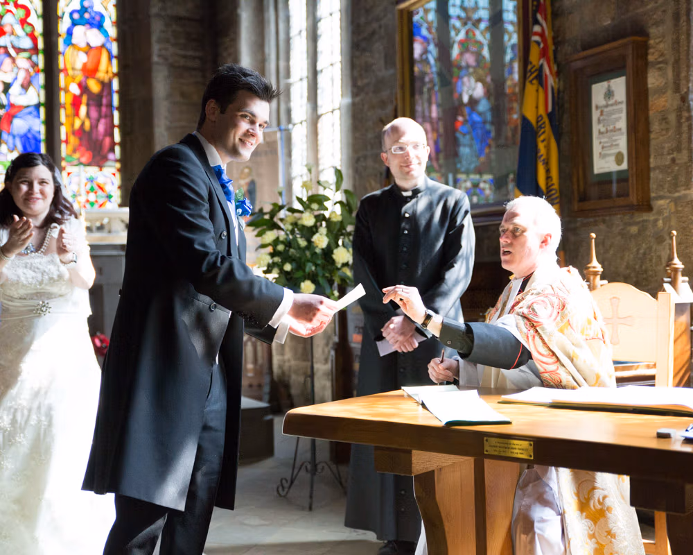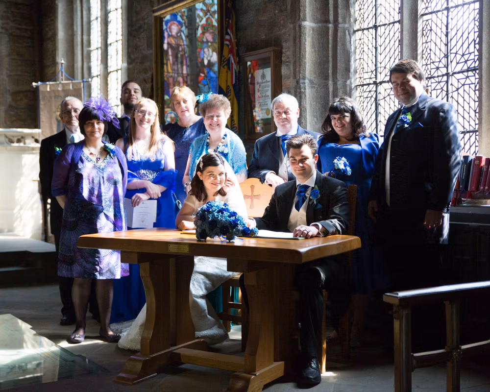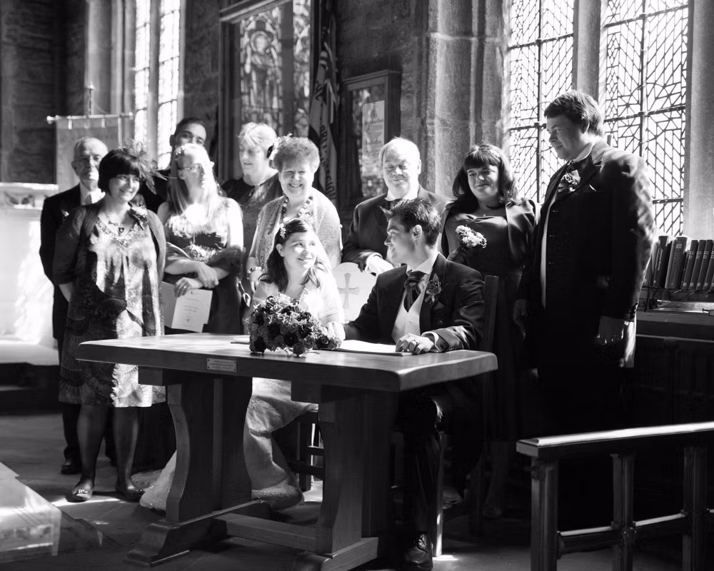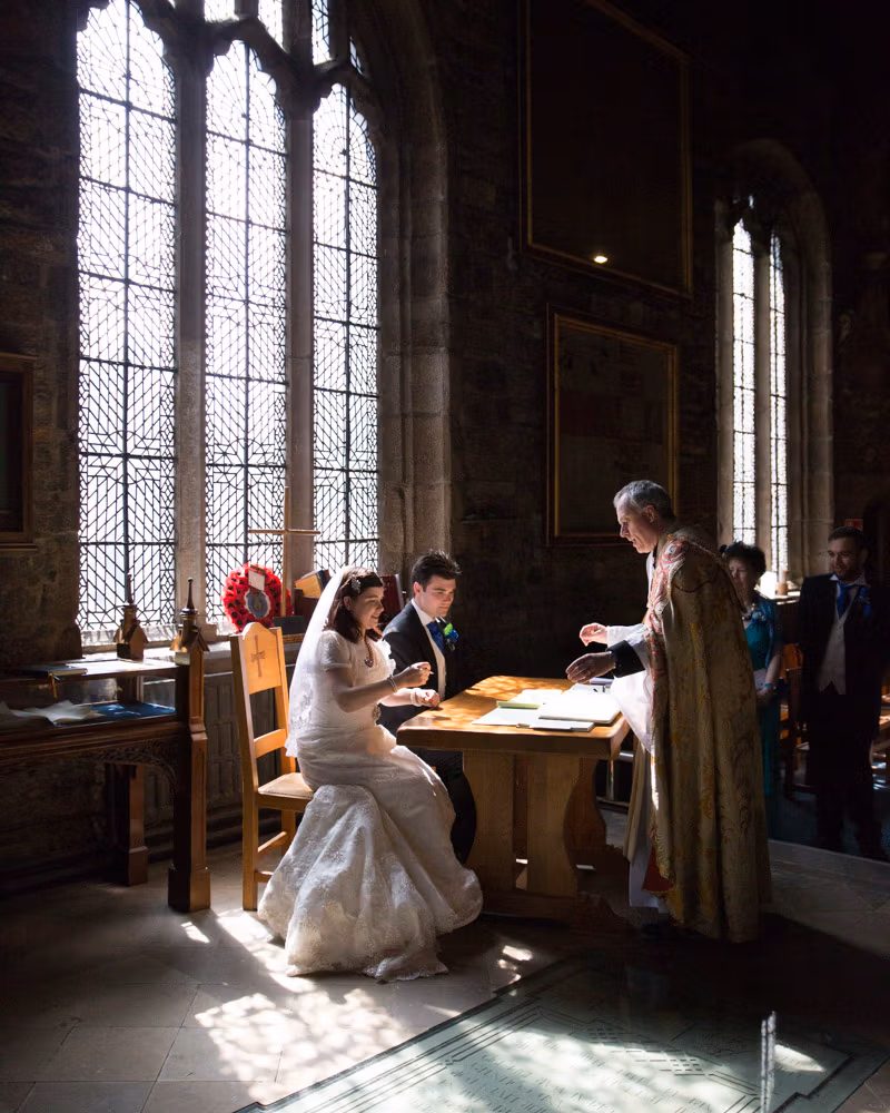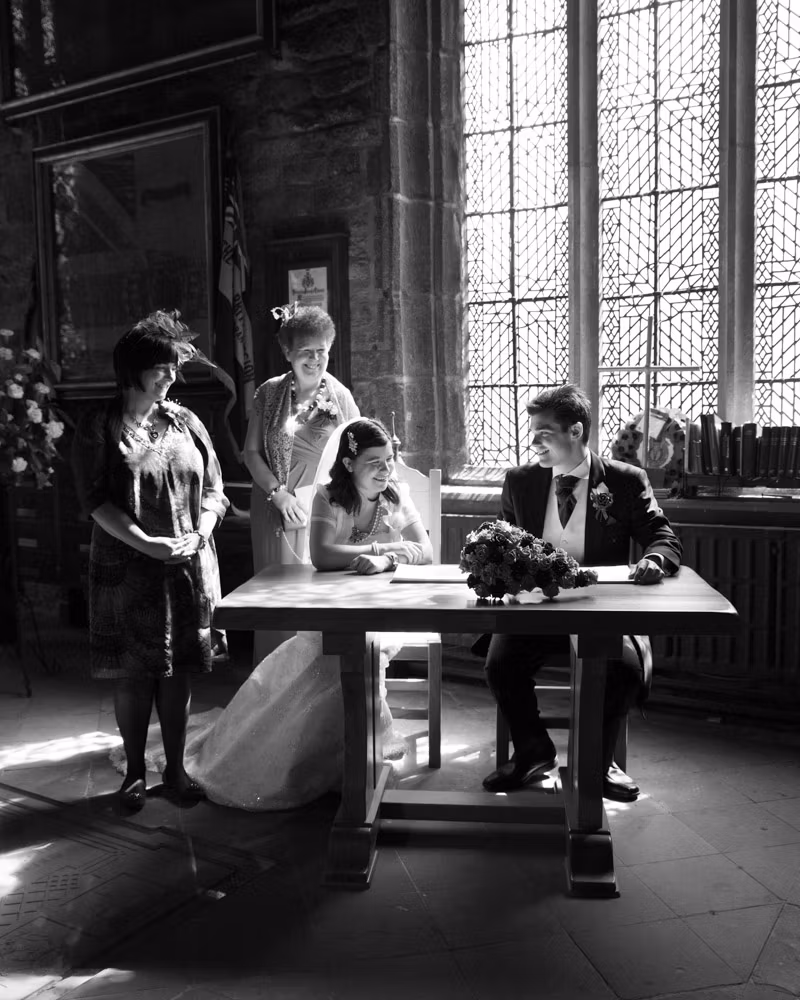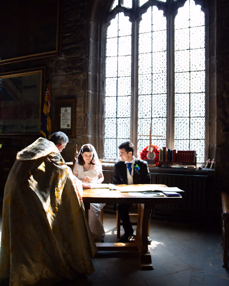 After the ceremony, we made our way quietly into the vestry — a beautiful space bathed in soft window light. There was such joy in the air. The newlyweds shared a smile as they signed the register, framed by the stained glass and the grandeur of Halifax Minster’s old stone walls.