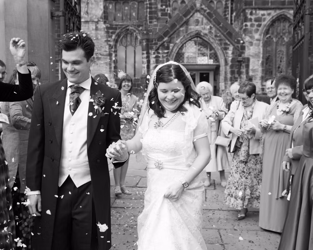 Outside the Minster, the guests formed two lines, smiling and cheering as Claire and Tom stepped out hand in hand. The confetti flew, the sunlight returned, and at the end of the walk, Claire let out the most joyful expression — a moment I’ll never forget. A kiss sealed the walk and the laughter echoed around the church grounds.