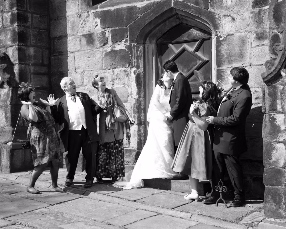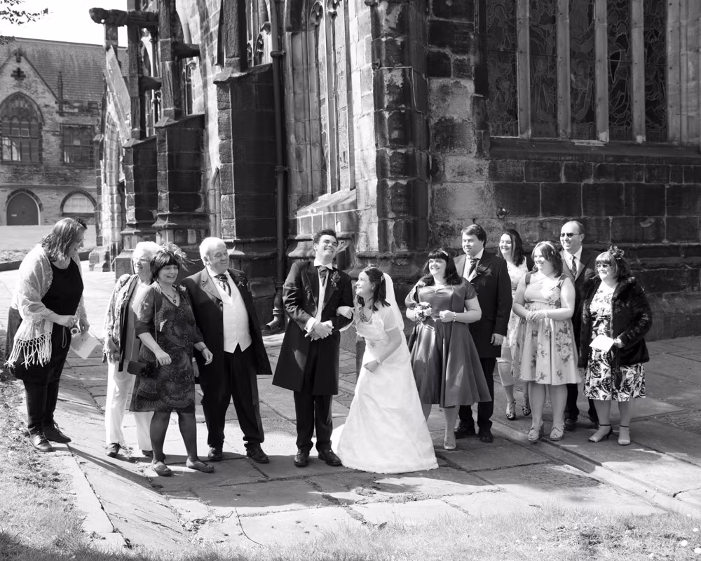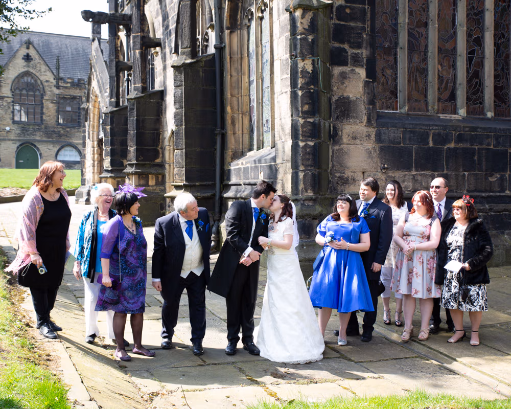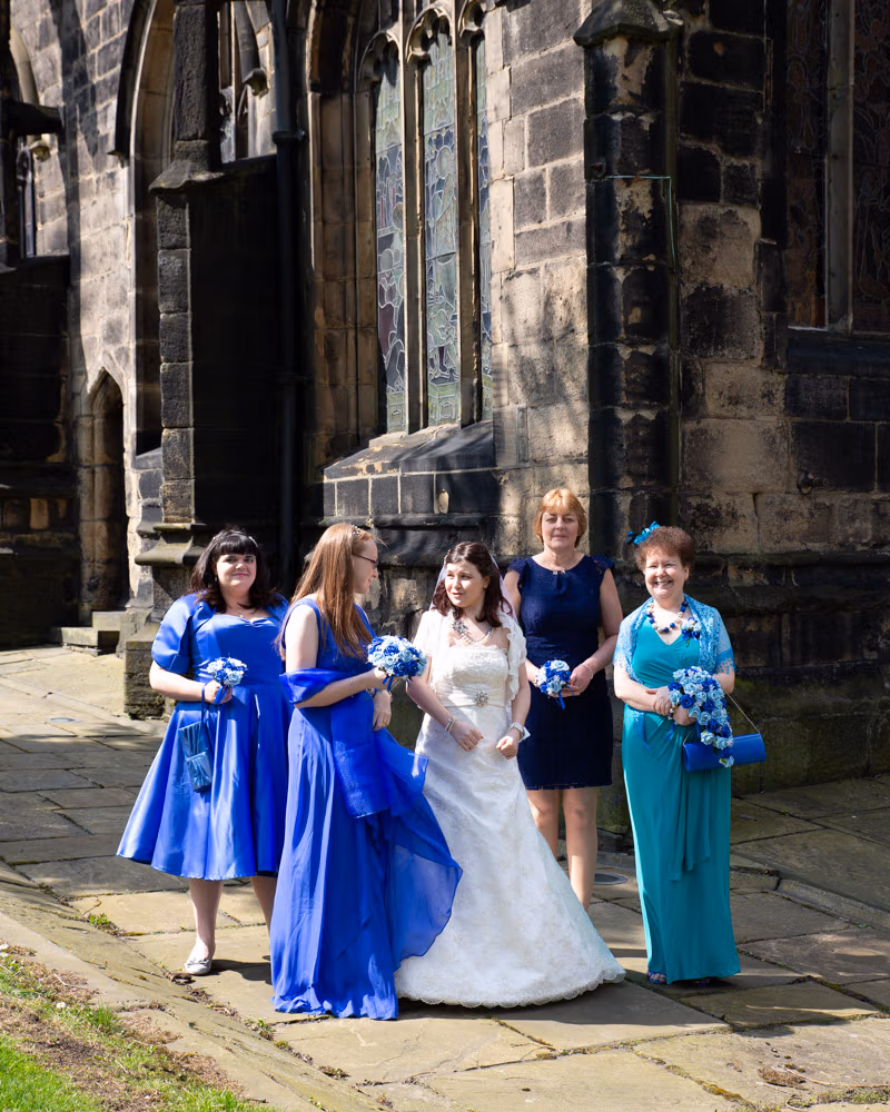 We gathered for a few relaxed group photos in the April sun. The groom with his best man and both fathers. Claire with her bridesmaids, her mum, and Tom’s — all glowing against the beautiful Halifax Minster stone. One wide shot of the full wedding party caught everyone mid-laughter, a perfect memory. Then just a few more before slipping away for some quiet portraits of the couple beside the old side door — soft sunlight, shadows, and real tenderness.