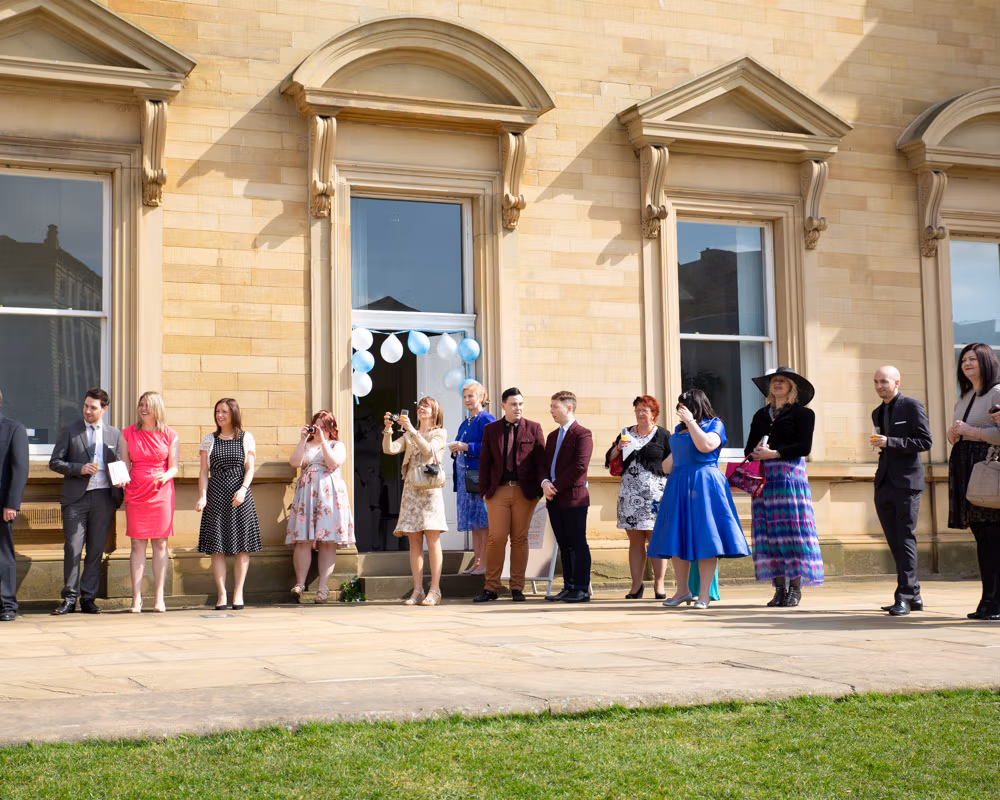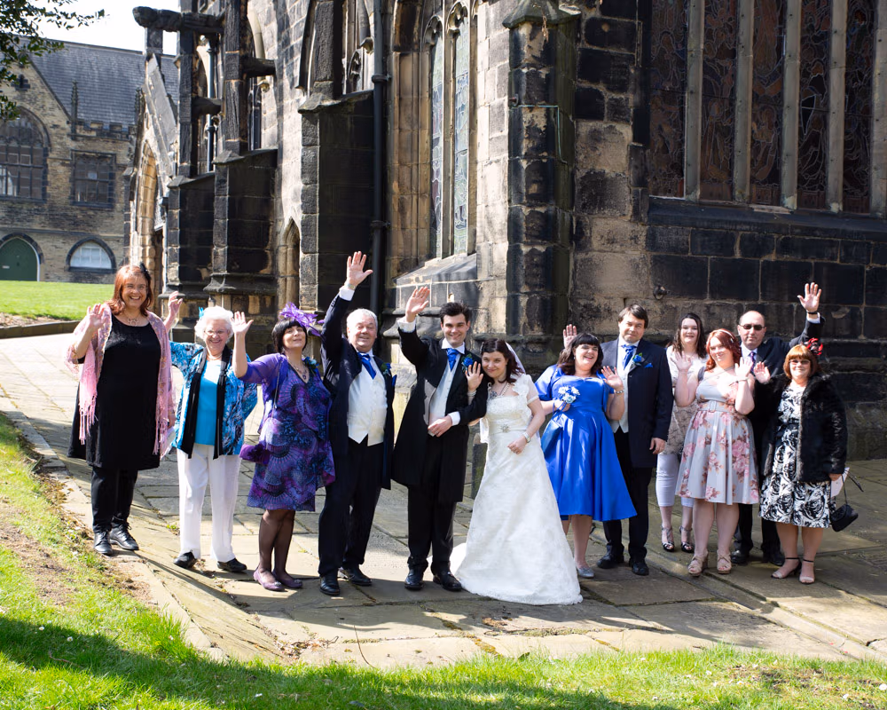 Then the full wedding party joined us for a final photo before the exit. It wasn’t easy for Claire — but she was so brave and so determined. This was such a beautiful part of their Halifax wedding day, and I felt truly lucky to photograph it all as a Leeds-based wedding photographer.