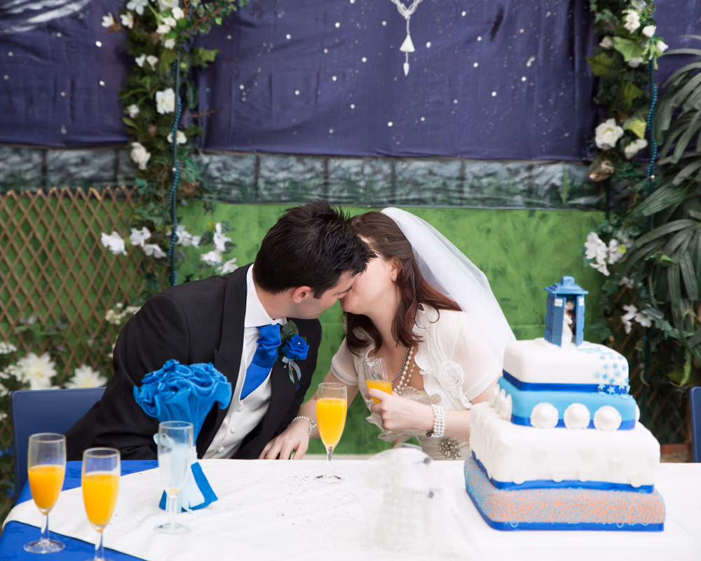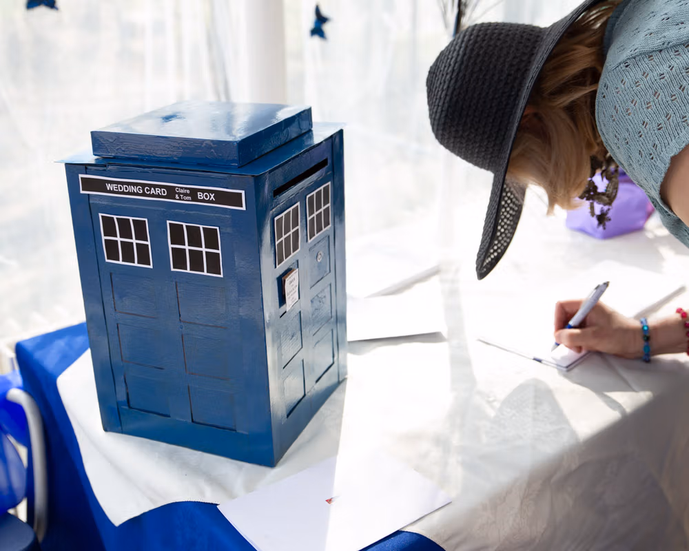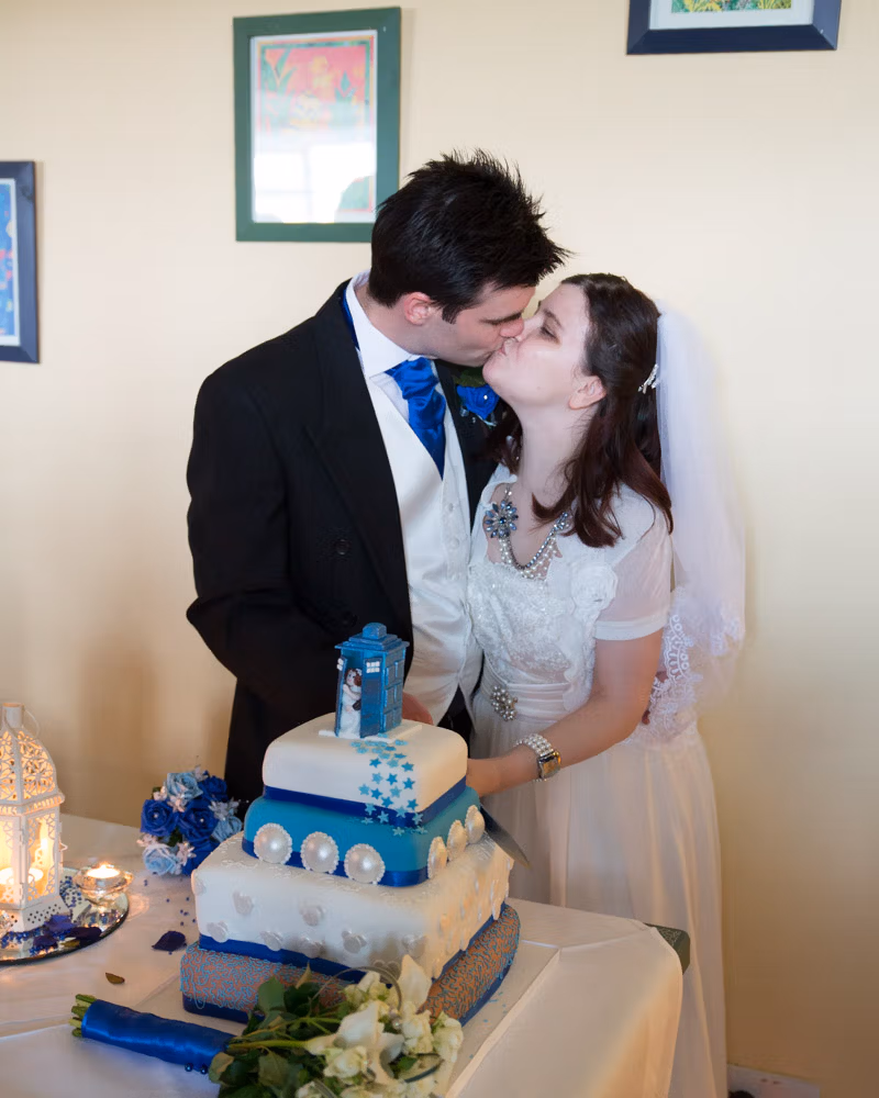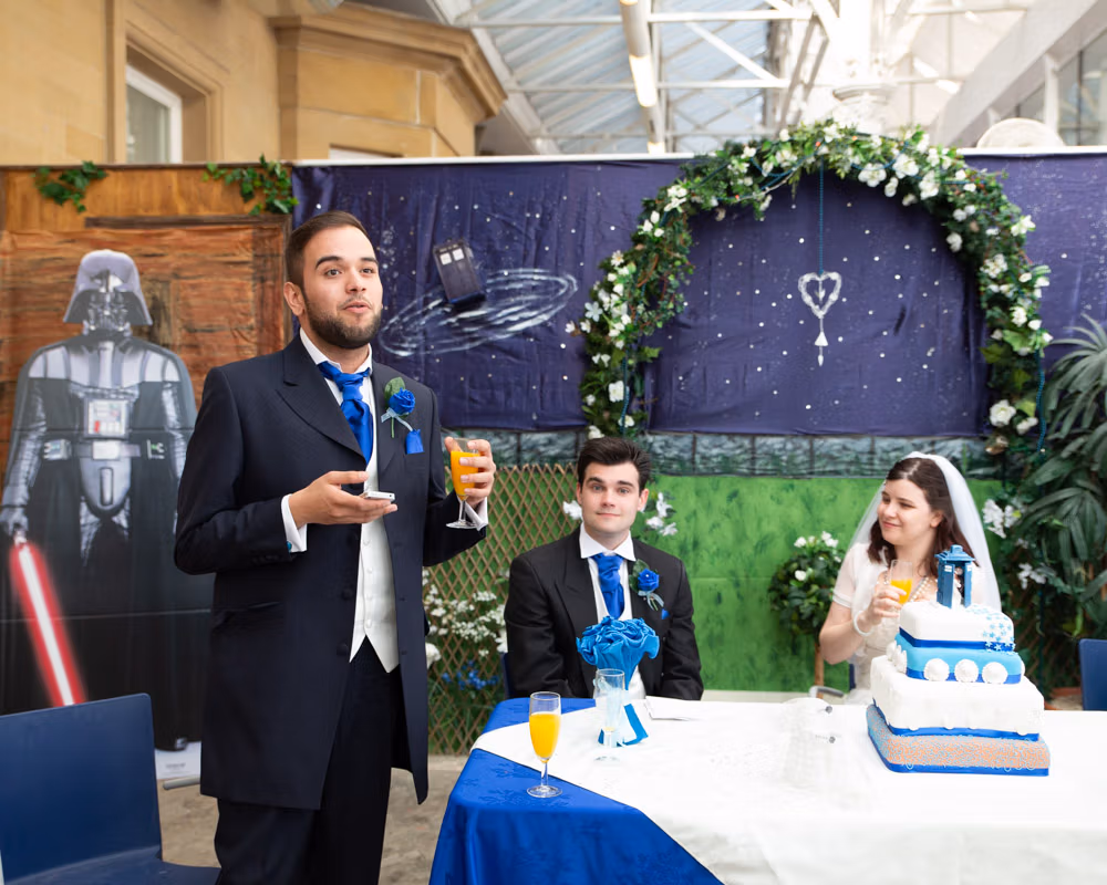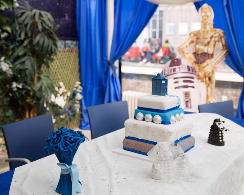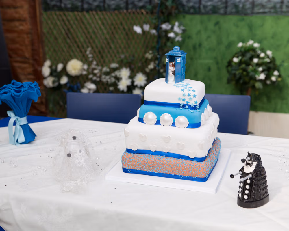 Inside the Northern Broadsides Theatre Company, the celebration truly came into its own. Blue details echoed the day — tablecloths, bouquets, dresses, even the Dr Who TARDIS card box and a mini one perched proudly atop the cake. A chocolate fountain and snack station kept everyone fuelled between laughter and speeches.