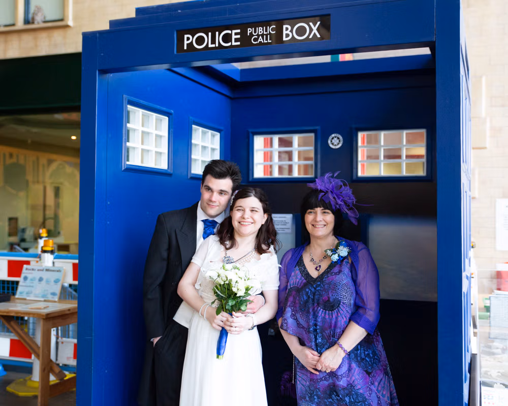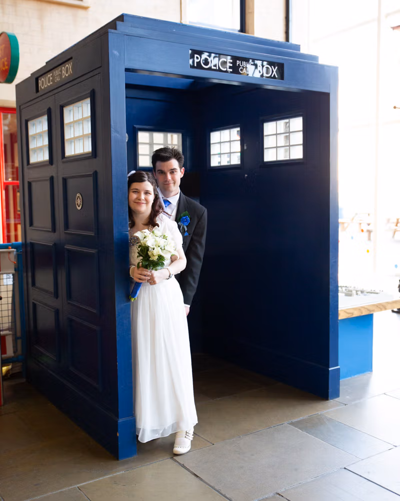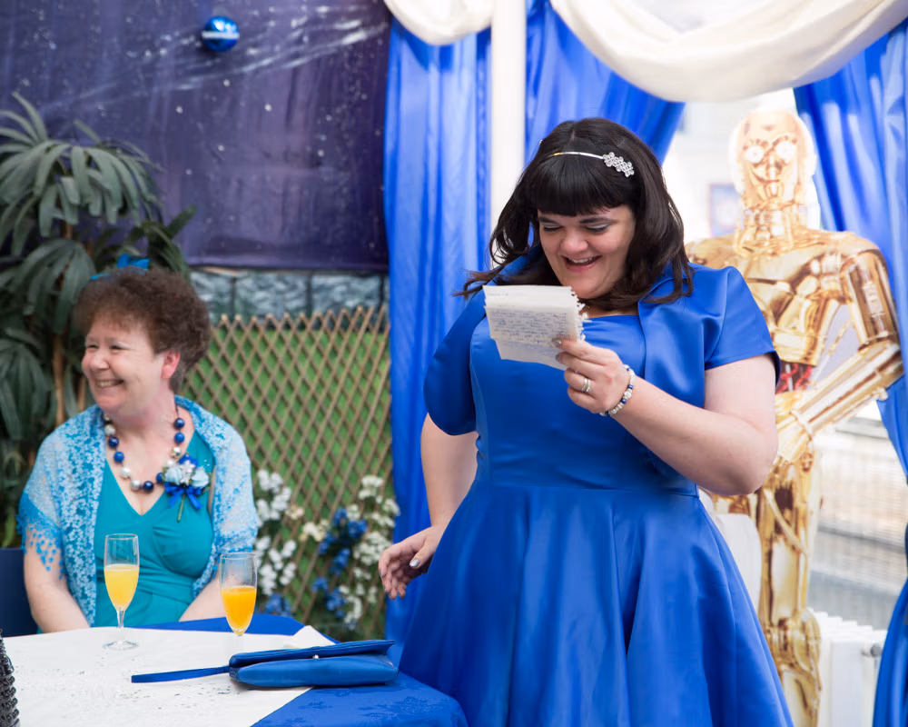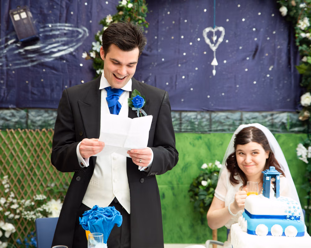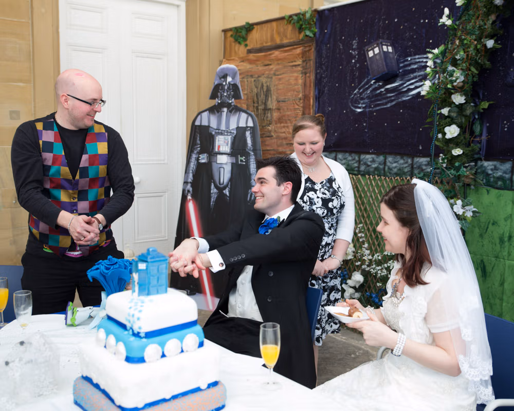 Inside the Northern Broadsides Theatre Company, the celebration truly came into its own. Blue details echoed the day — tablecloths, bouquets, dresses, even the Dr Who TARDIS card box and a mini one perched proudly atop the cake. A chocolate fountain and snack station kept everyone fuelled between laughter and speeches.