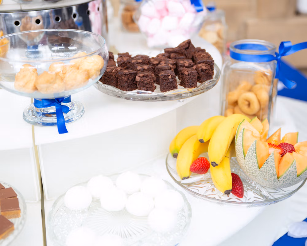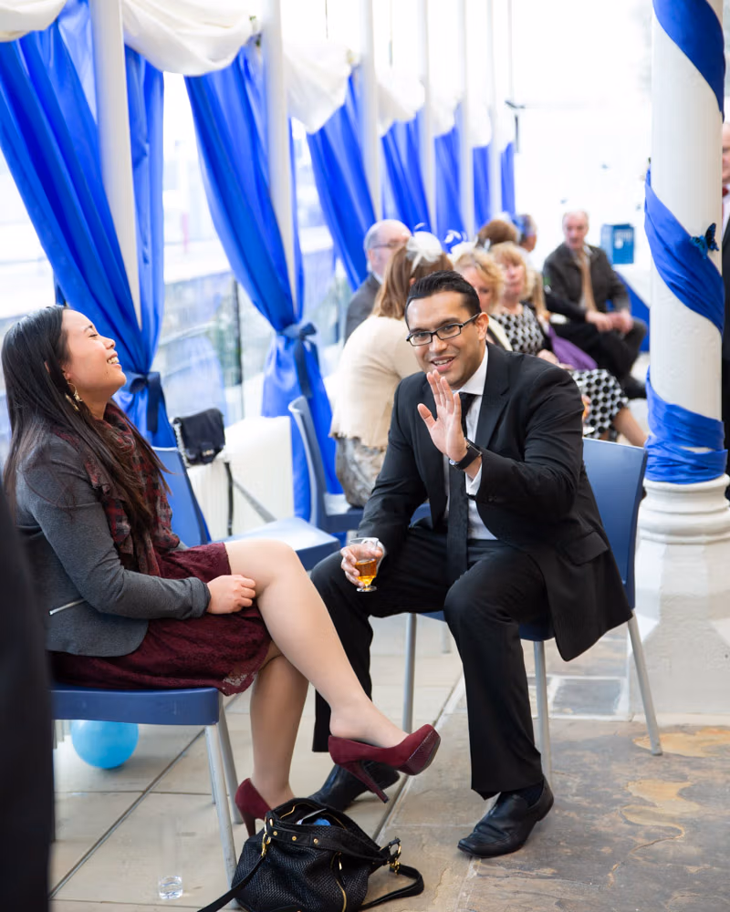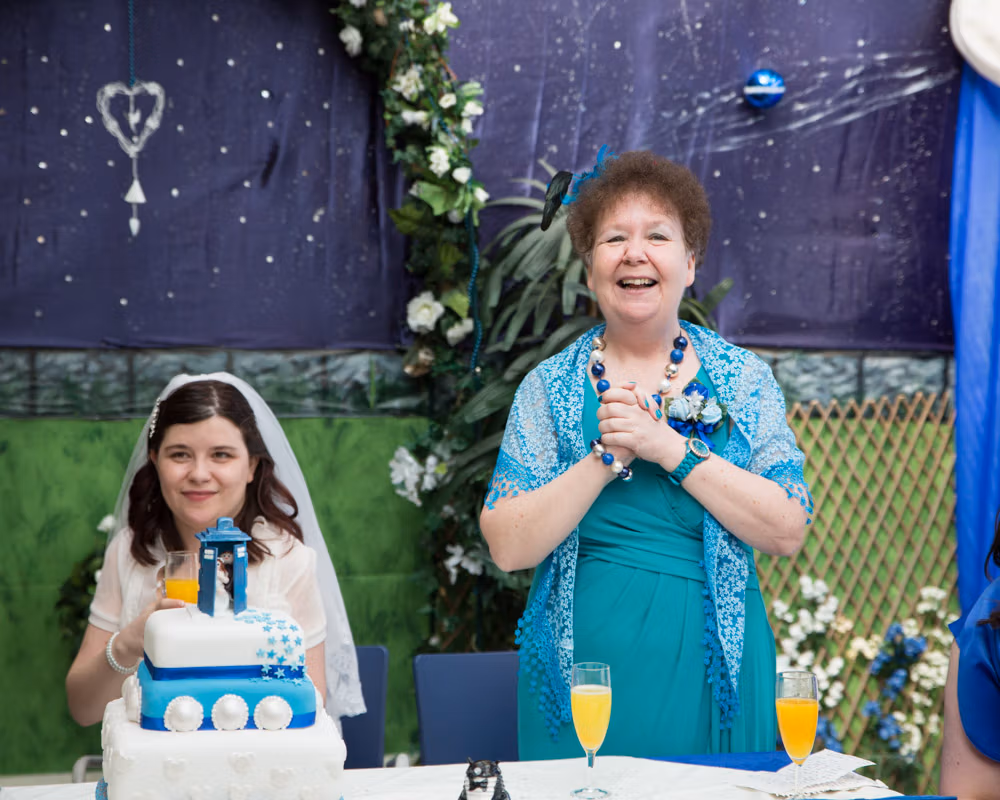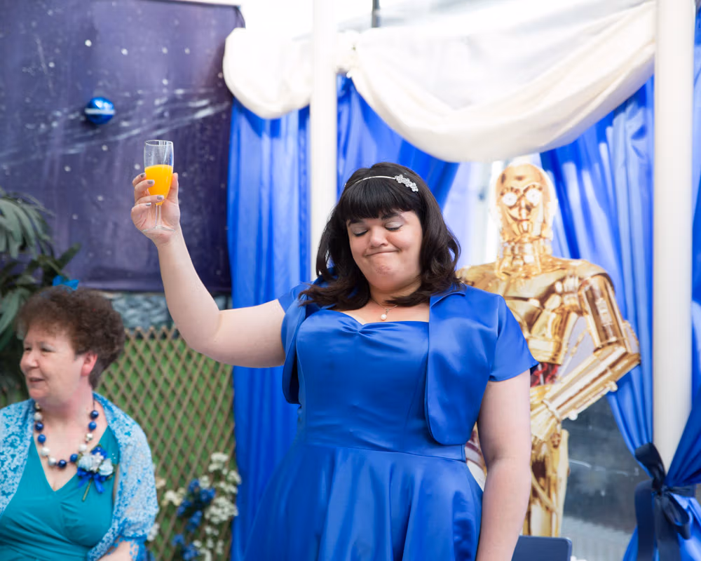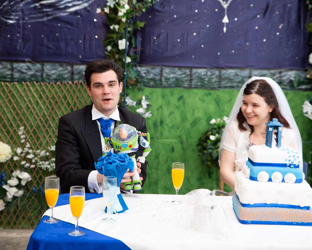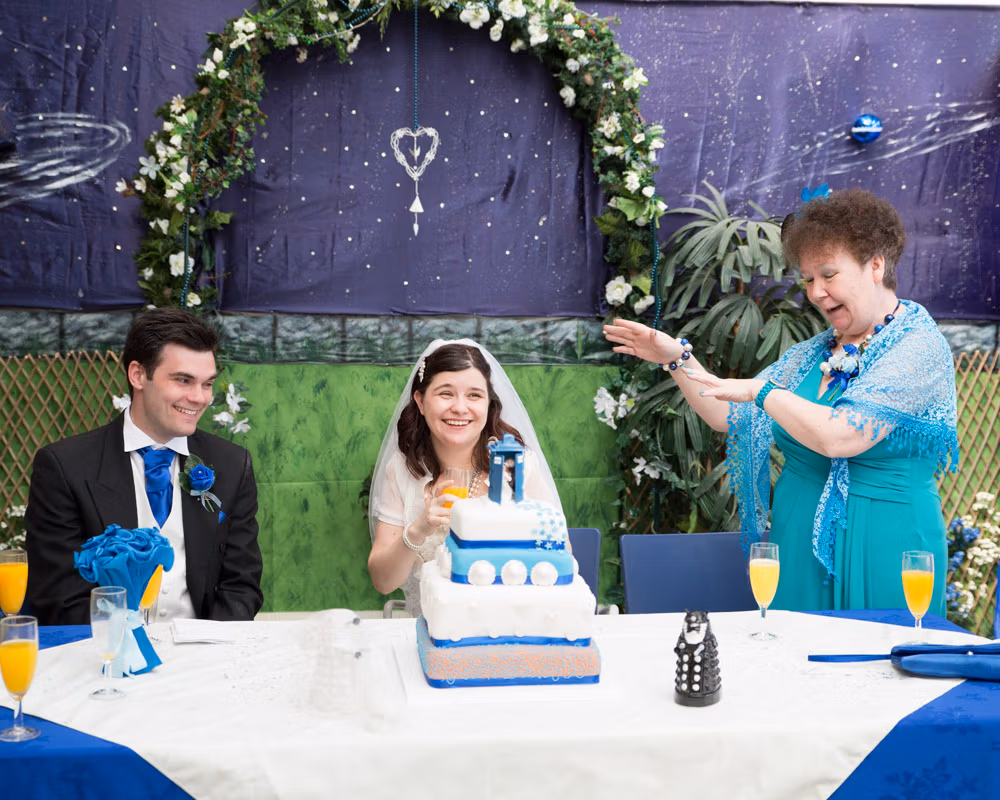 Inside the Northern Broadsides Theatre Company, the celebration truly came into its own. Blue details echoed the day — tablecloths, bouquets, dresses, even the Dr Who TARDIS card box and a mini one perched proudly atop the cake. A chocolate fountain and snack station kept everyone fuelled between laughter and speeches.