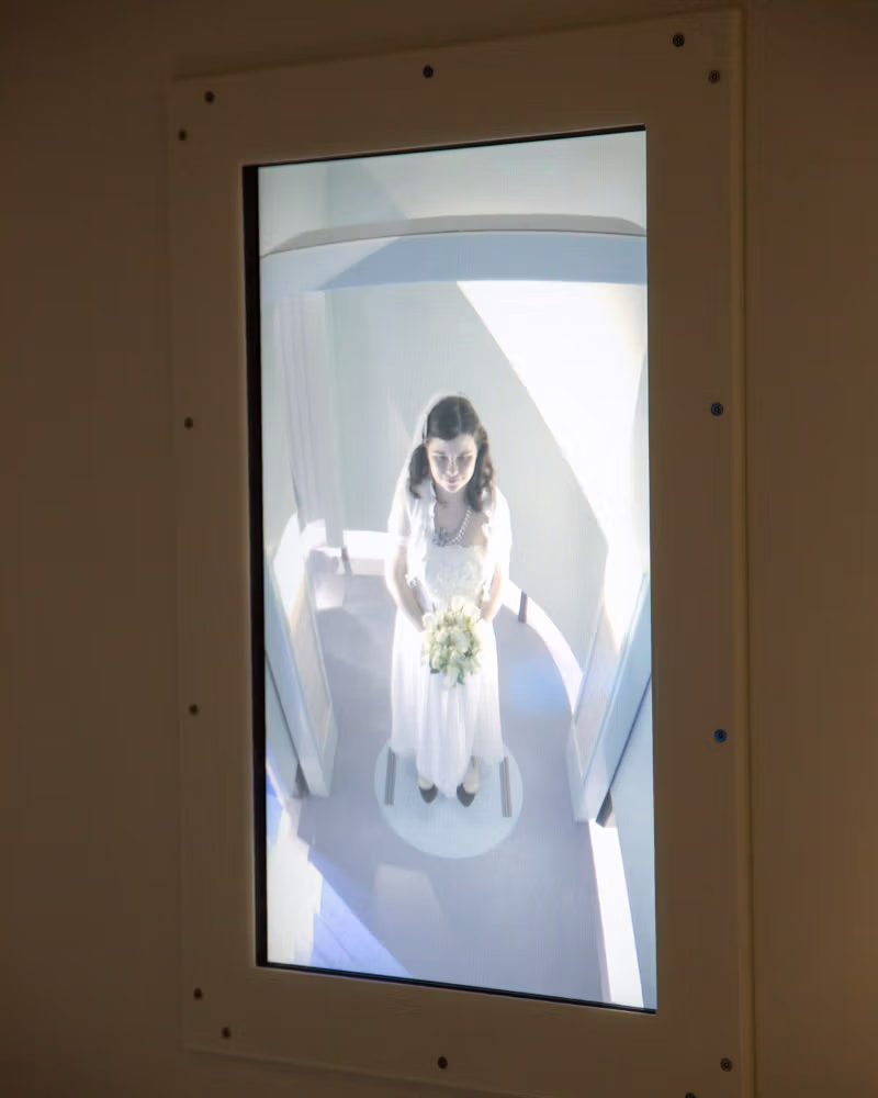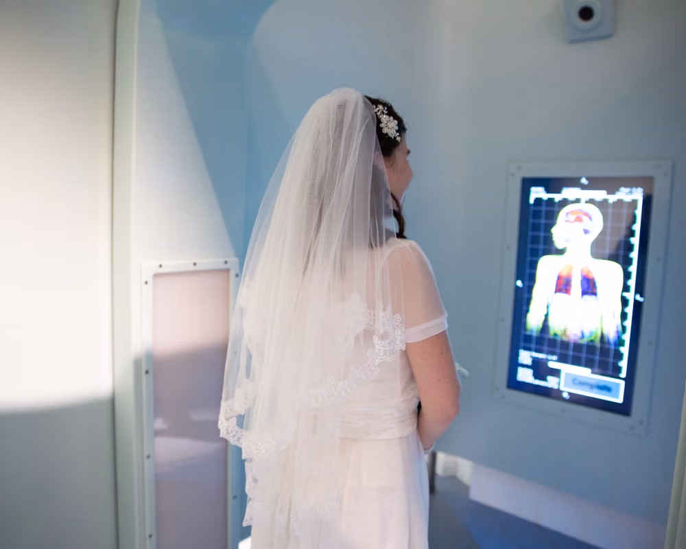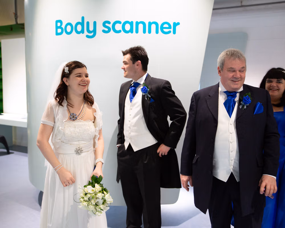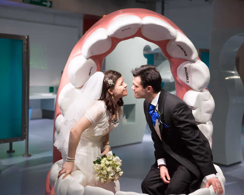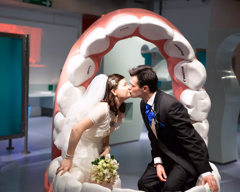 As a photographer, it was a dream. The oversized mouth, the dentist chair, the body scanner — all perfect backdrops for playful, one-of-a-kind portraits. I captured the bouquet resting gently against her dress; the groom reading a story to Claire and her mum; her sister lying on the giant tongue — and later, the bride and groom inside the enormous nostrils, laughing like kids.
