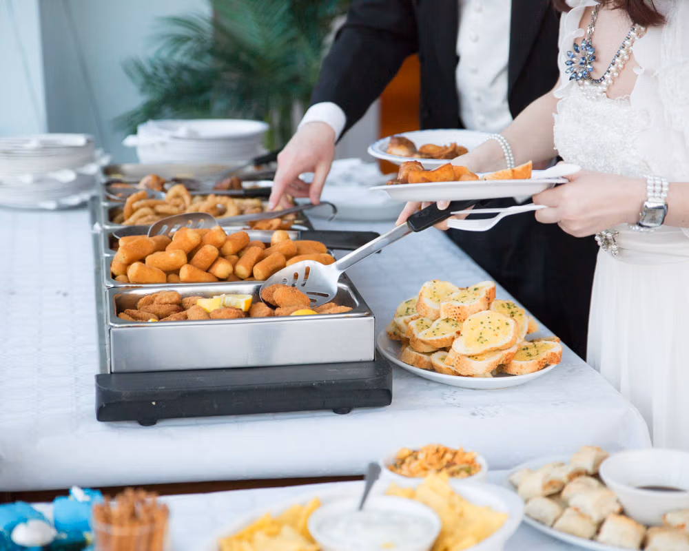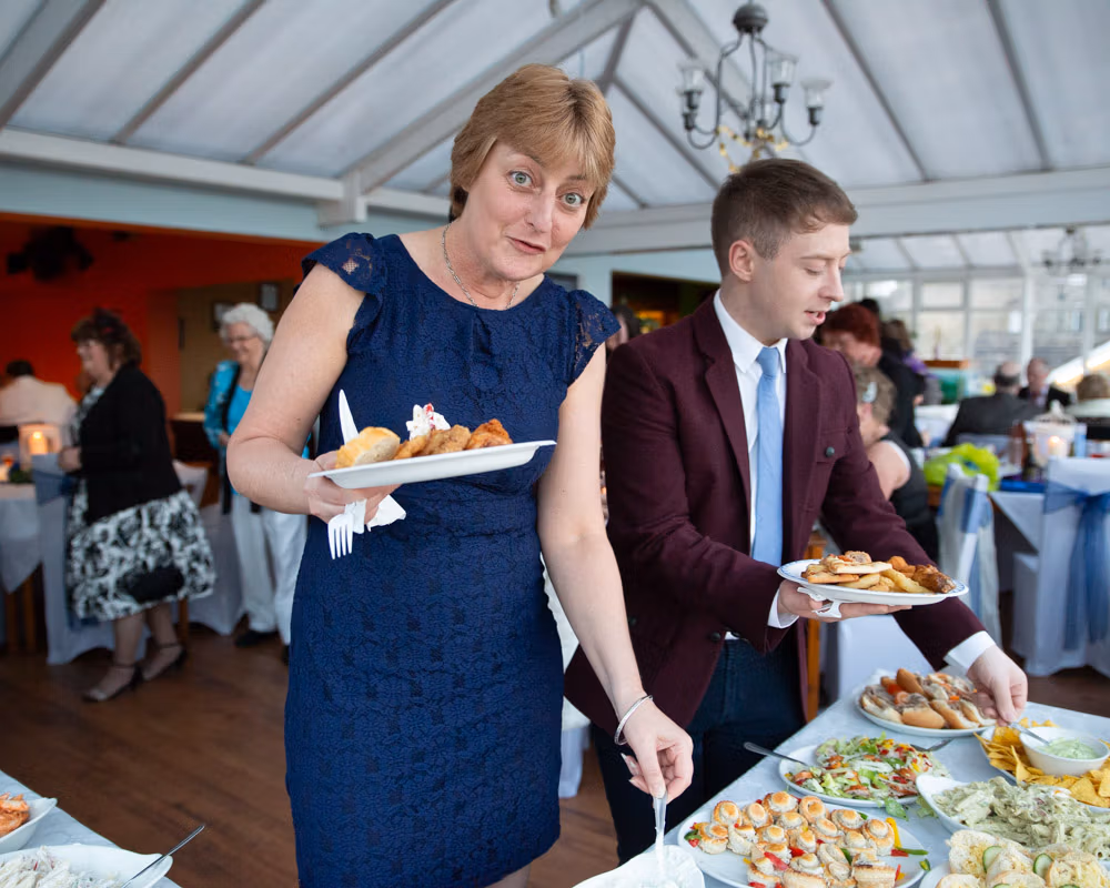 Before the dancing kicked off, the buffet opened — the couple were first to grab a bite, followed by guests drifting over in pairs and groups, plates in hand. The cake, which had made its way from the earlier venues, was portioned and passed around.
