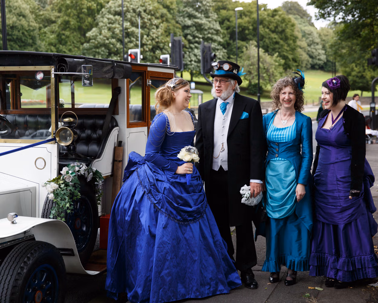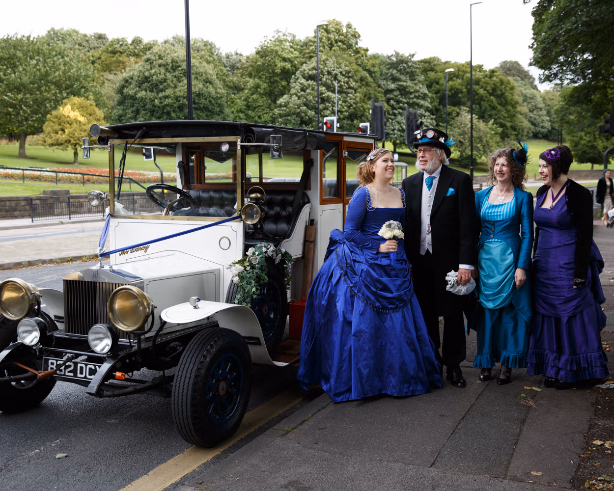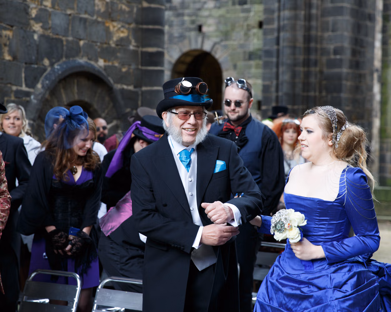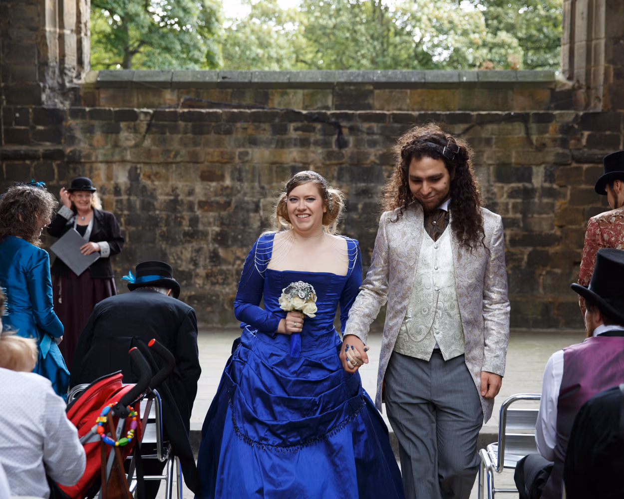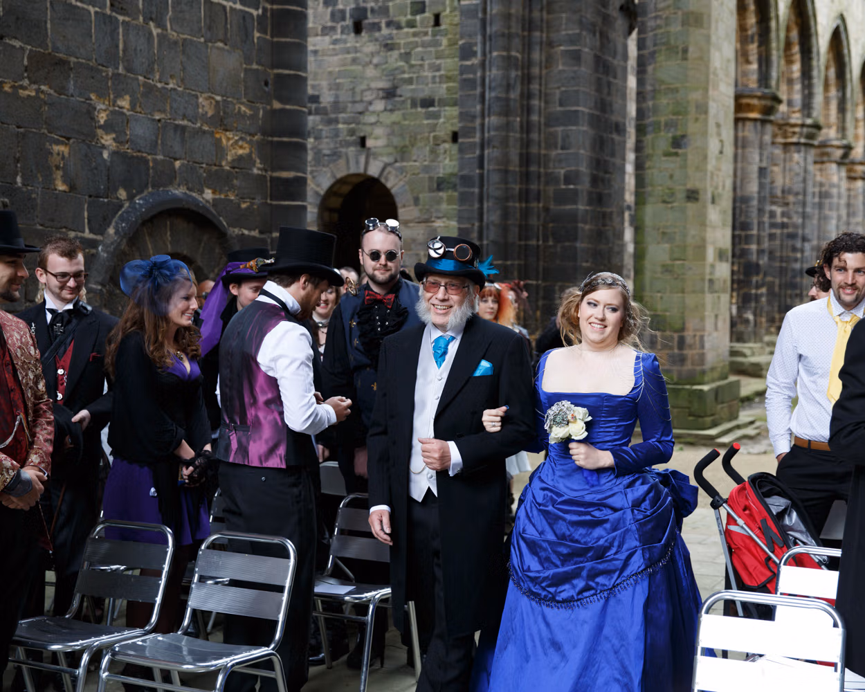 Linsey and Chris chose two striking Leeds wedding venues for their day — Kirkstall Abbey and Left Bank Leeds. Kirkstall Abbey sits just a short walk from home for me, while Left Bank Leeds, a deconsecrated church on Cardigan Lane, became the setting for their evening celebration. I hadn’t encountered a steampunk wedding before this one, but from the moment I arrived and began photographing the colour, detail, and personality, it was clear this was going to be one of the most enjoyable weddings I’d documented.