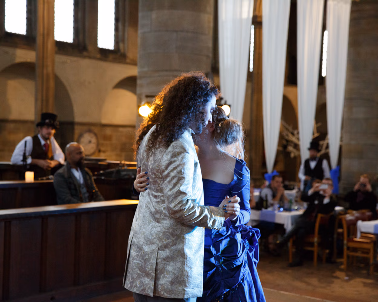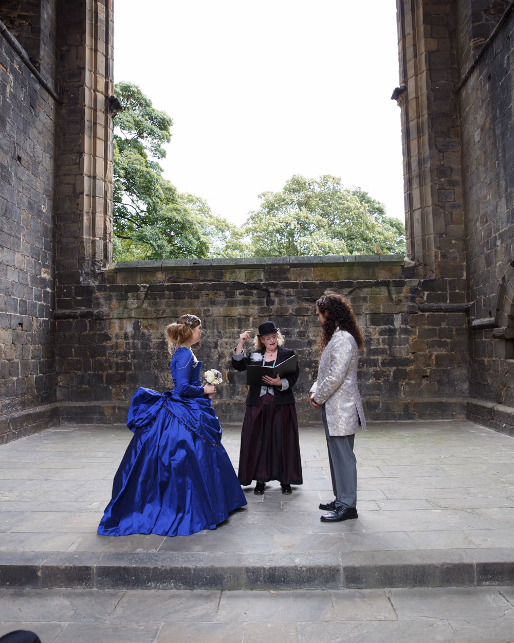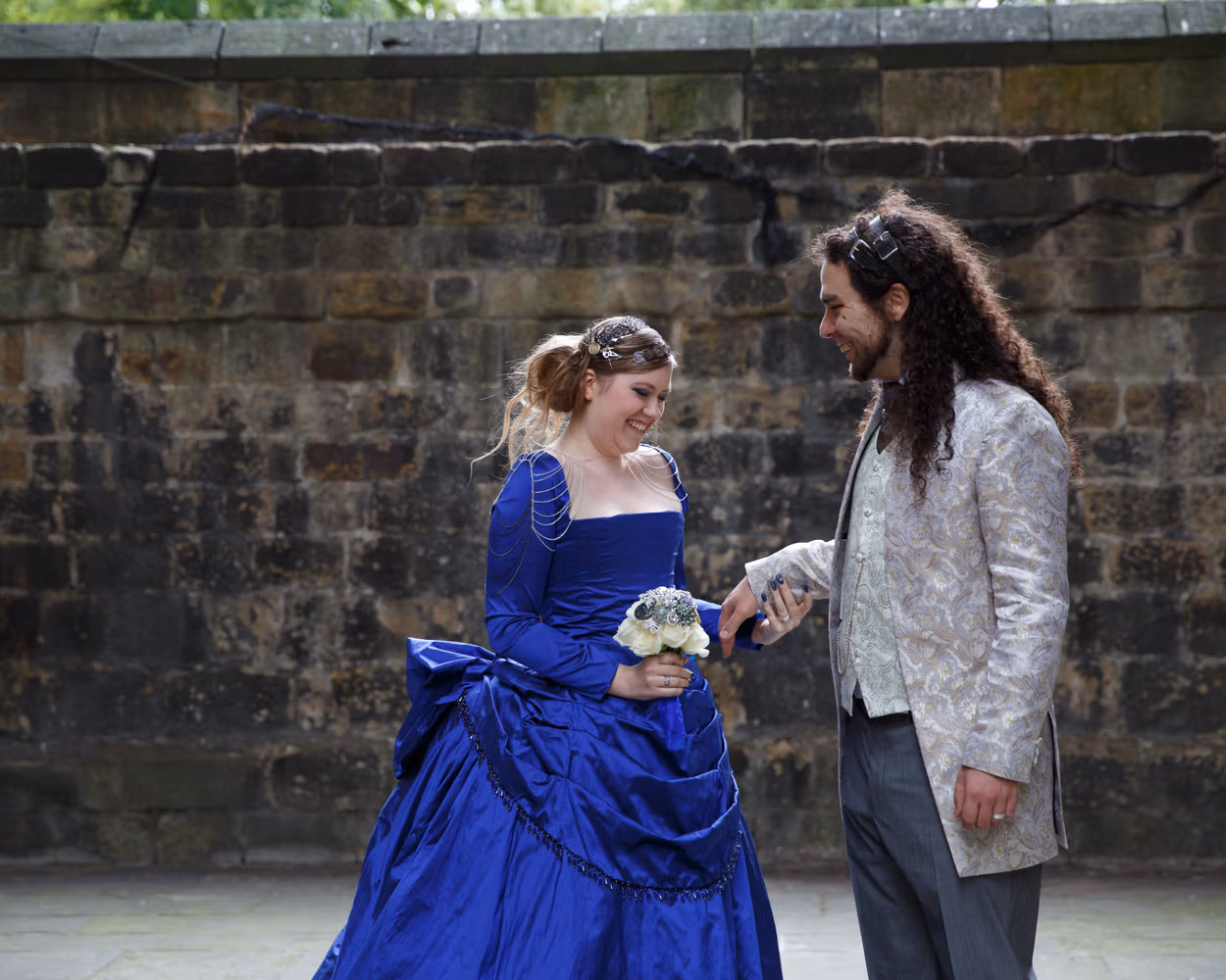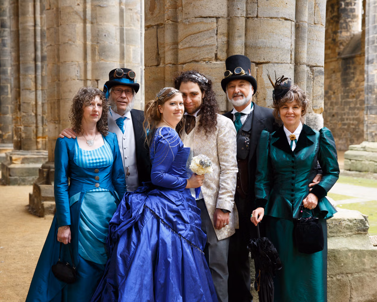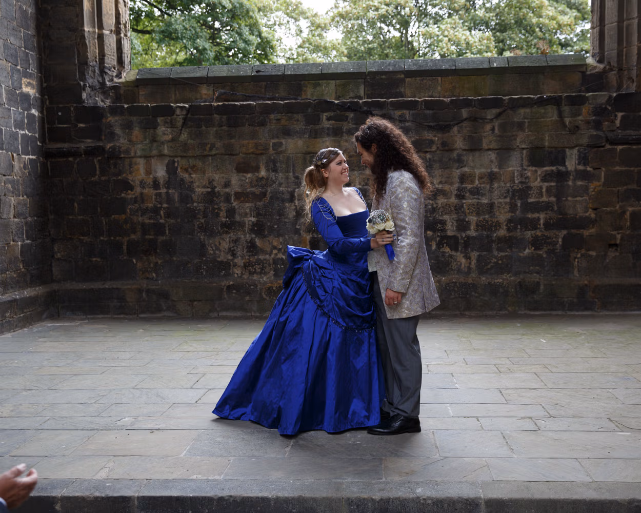 Linsey and Chris chose two striking Leeds wedding venues for their day — Kirkstall Abbey and Left Bank Leeds. Kirkstall Abbey sits just a short walk from home for me, while Left Bank Leeds, a deconsecrated church on Cardigan Lane, became the setting for their evening celebration. I hadn’t encountered a steampunk wedding before this one, but from the moment I arrived and began photographing the colour, detail, and personality, it was clear this was going to be one of the most enjoyable weddings I’d documented.