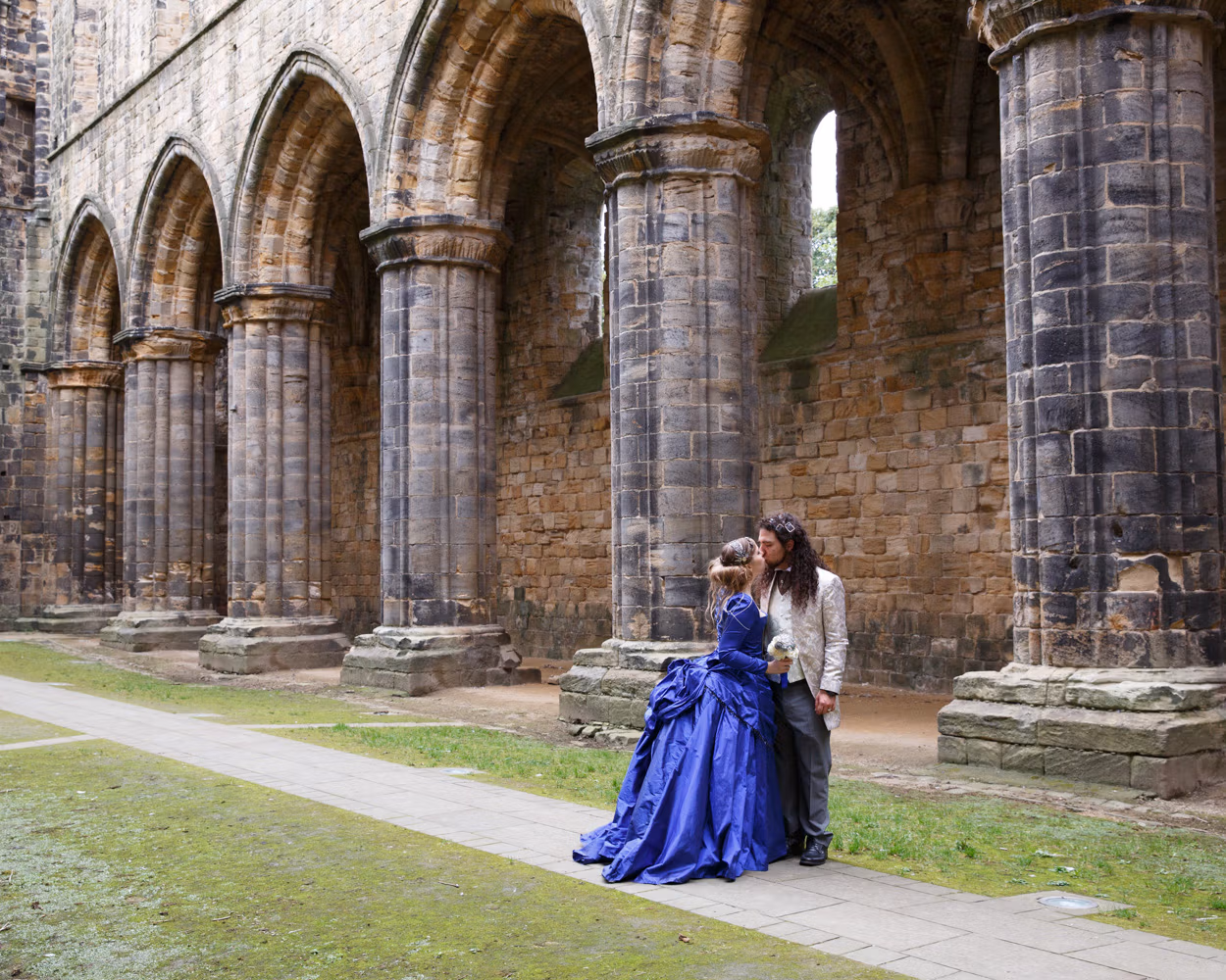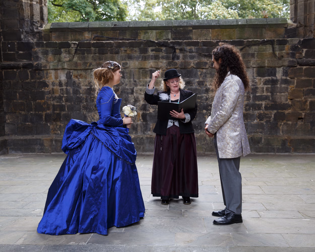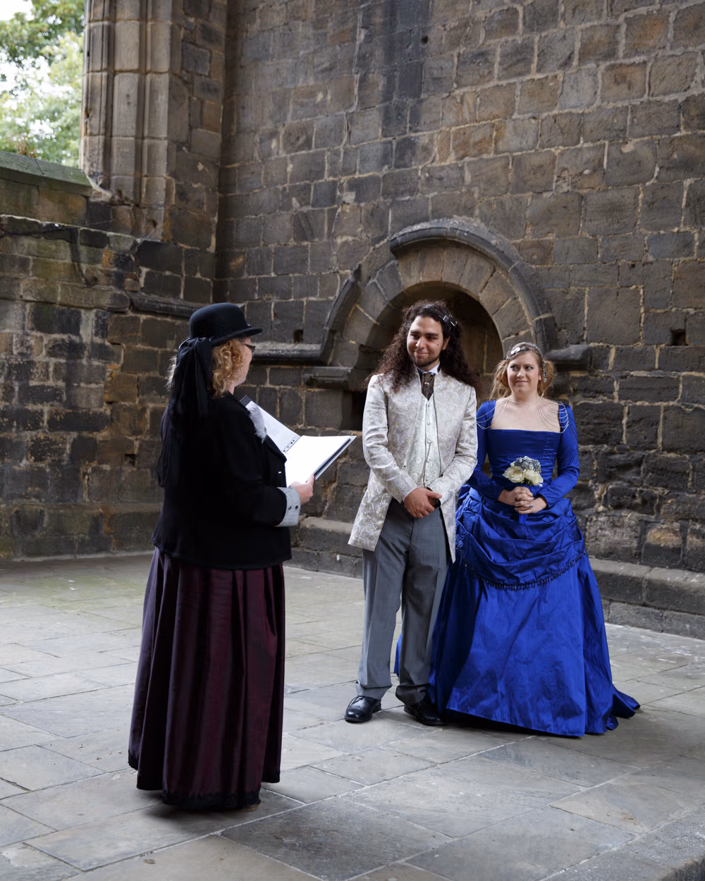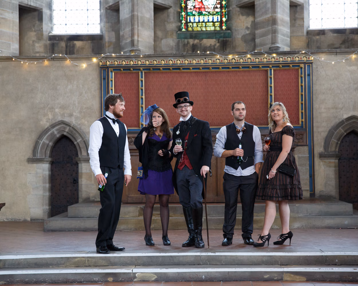 Linsey and Chris chose two striking Leeds wedding venues for their day — Kirkstall Abbey and Left Bank Leeds. Kirkstall Abbey sits just a short walk from home for me, while Left Bank Leeds, a deconsecrated church on Cardigan Lane, became the setting for their evening celebration. I hadn’t encountered a steampunk wedding before this one, but from the moment I arrived and began photographing the colour, detail, and personality, it was clear this was going to be one of the most enjoyable weddings I’d documented.