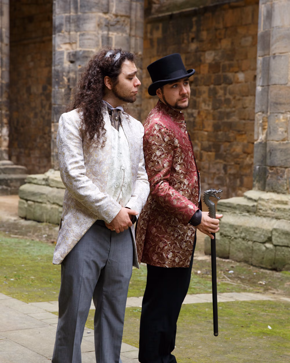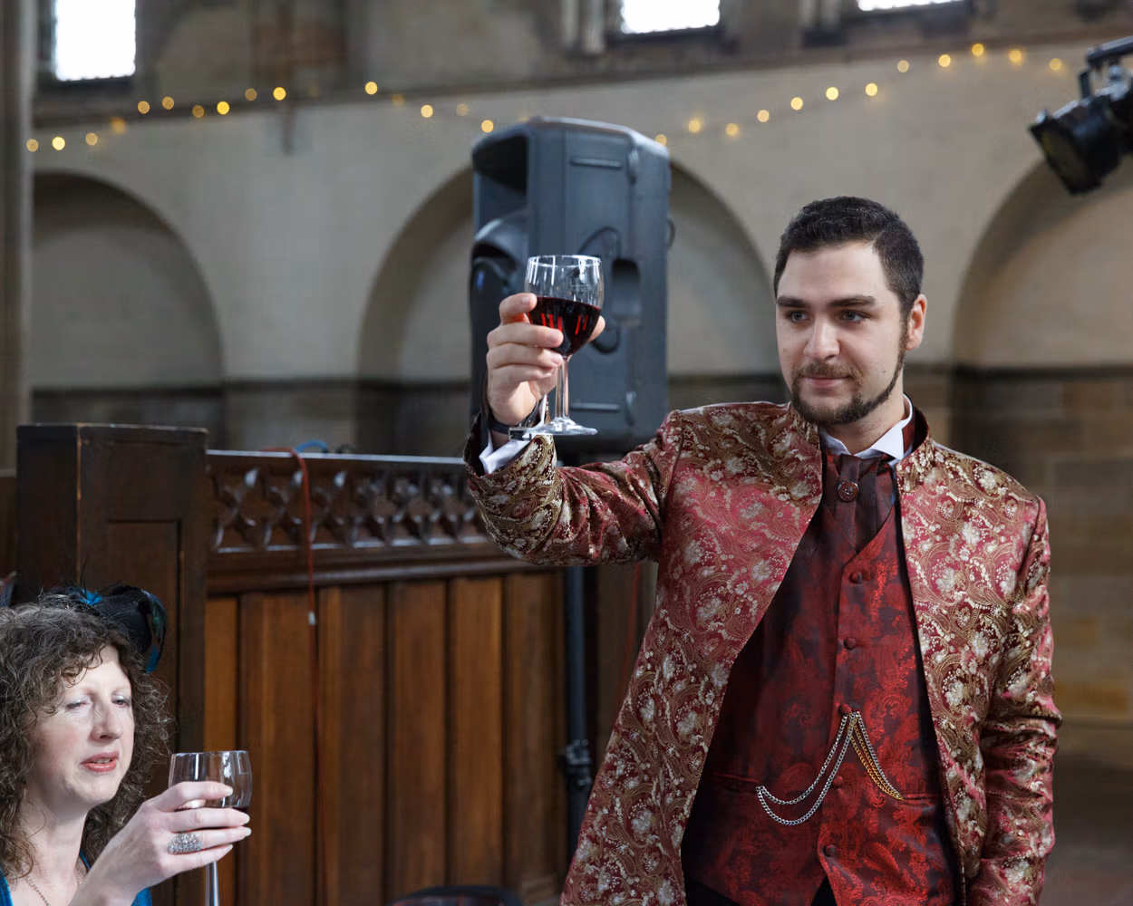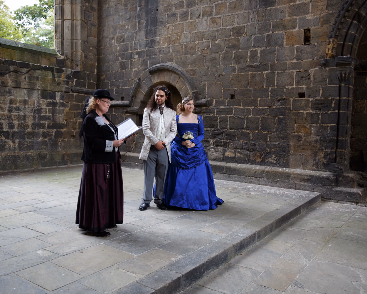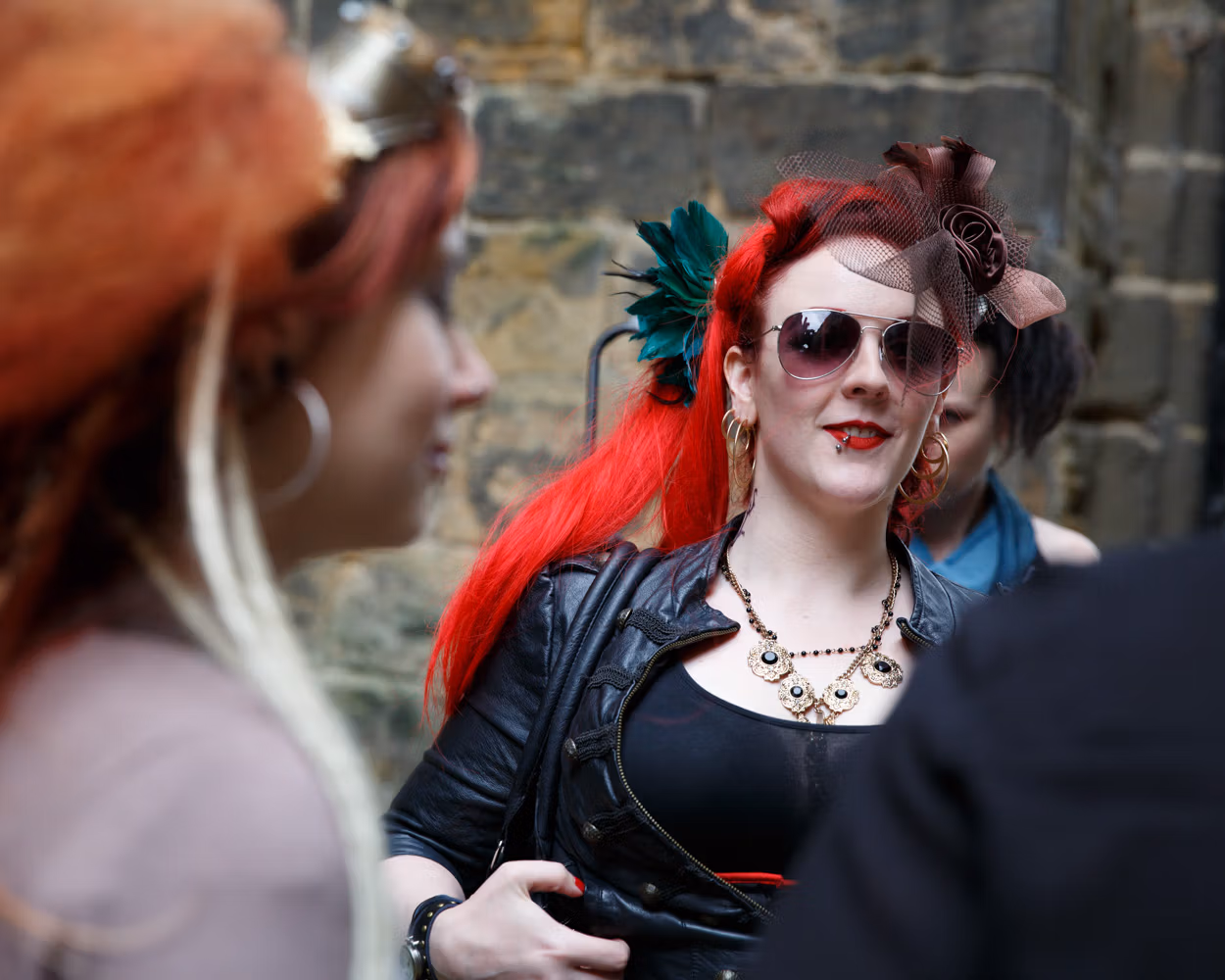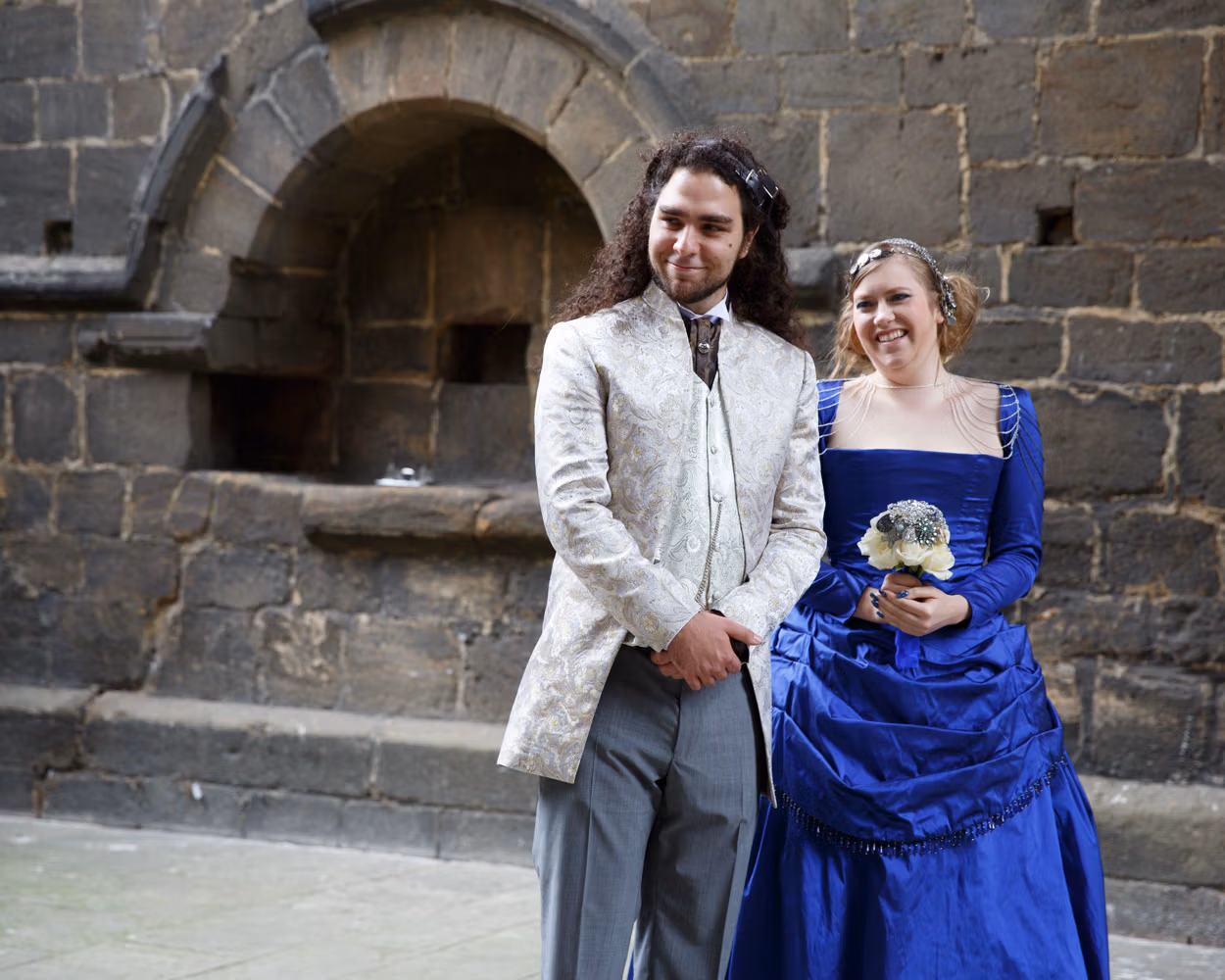 Linsey and Chris chose two striking Leeds wedding venues for their day — Kirkstall Abbey and Left Bank Leeds. Kirkstall Abbey sits just a short walk from home for me, while Left Bank Leeds, a deconsecrated church on Cardigan Lane, became the setting for their evening celebration. I hadn’t encountered a steampunk wedding before this one, but from the moment I arrived and began photographing the colour, detail, and personality, it was clear this was going to be one of the most enjoyable weddings I’d documented.