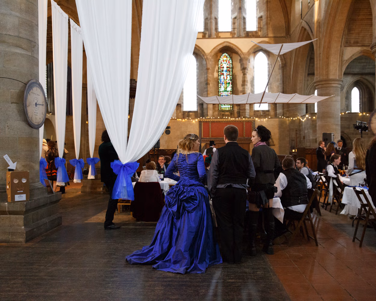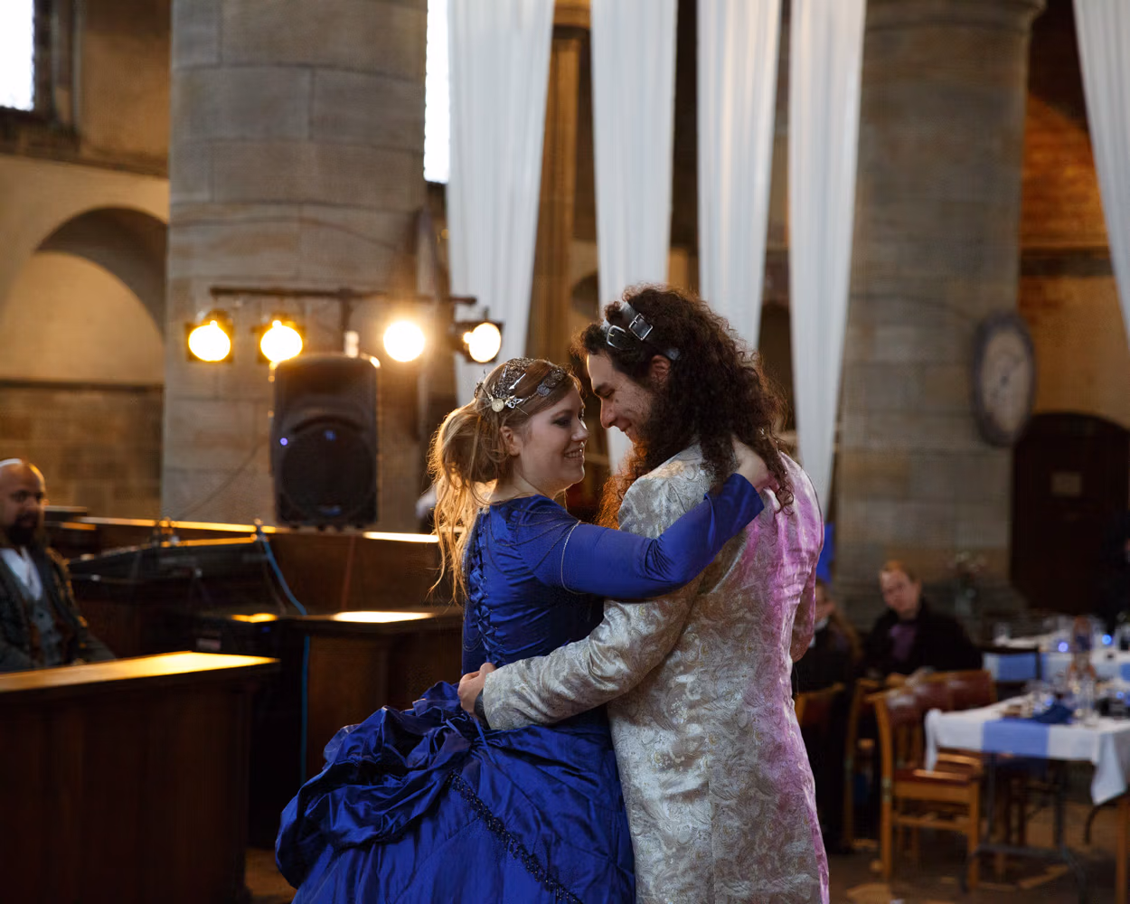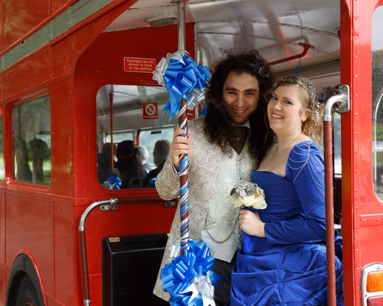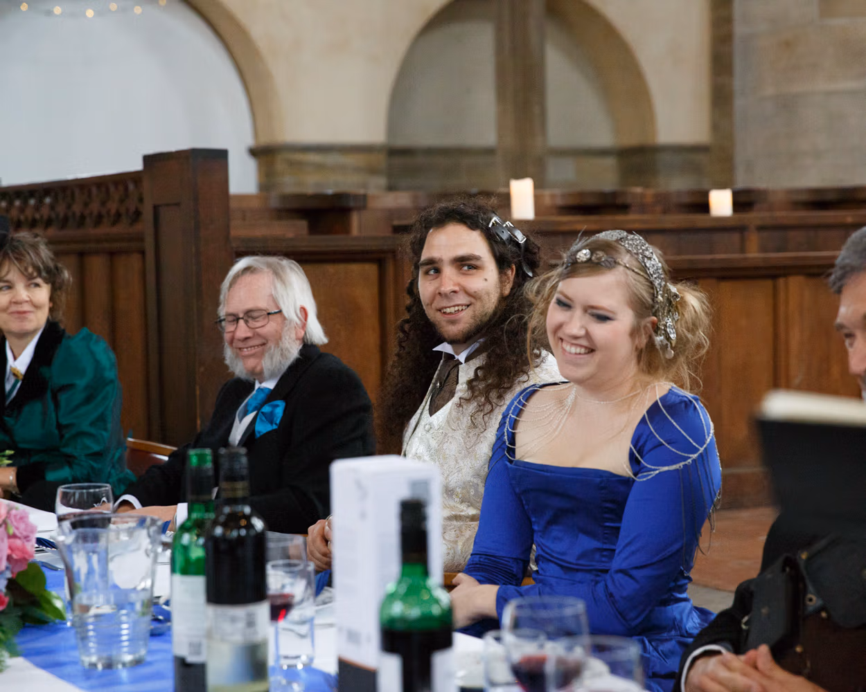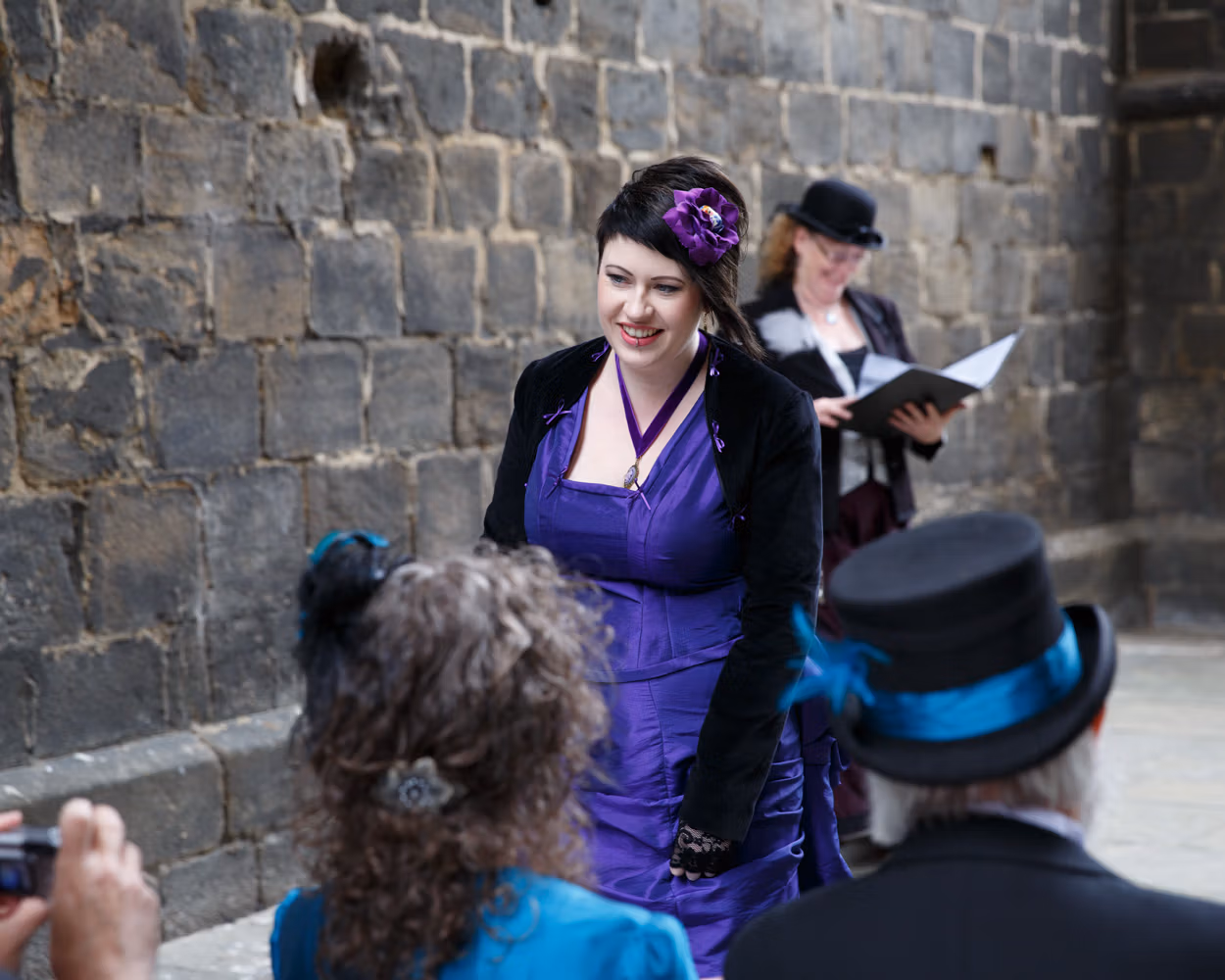 Linsey and Chris chose two striking Leeds wedding venues for their day — Kirkstall Abbey and Left Bank Leeds. Kirkstall Abbey sits just a short walk from home for me, while Left Bank Leeds, a deconsecrated church on Cardigan Lane, became the setting for their evening celebration. I hadn’t encountered a steampunk wedding before this one, but from the moment I arrived and began photographing the colour, detail, and personality, it was clear this was going to be one of the most enjoyable weddings I’d documented.