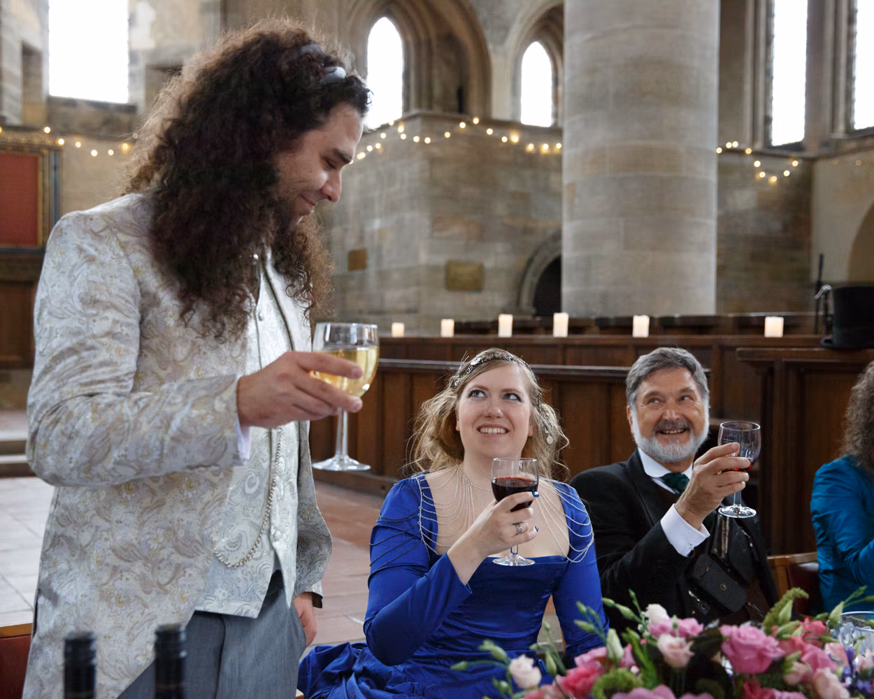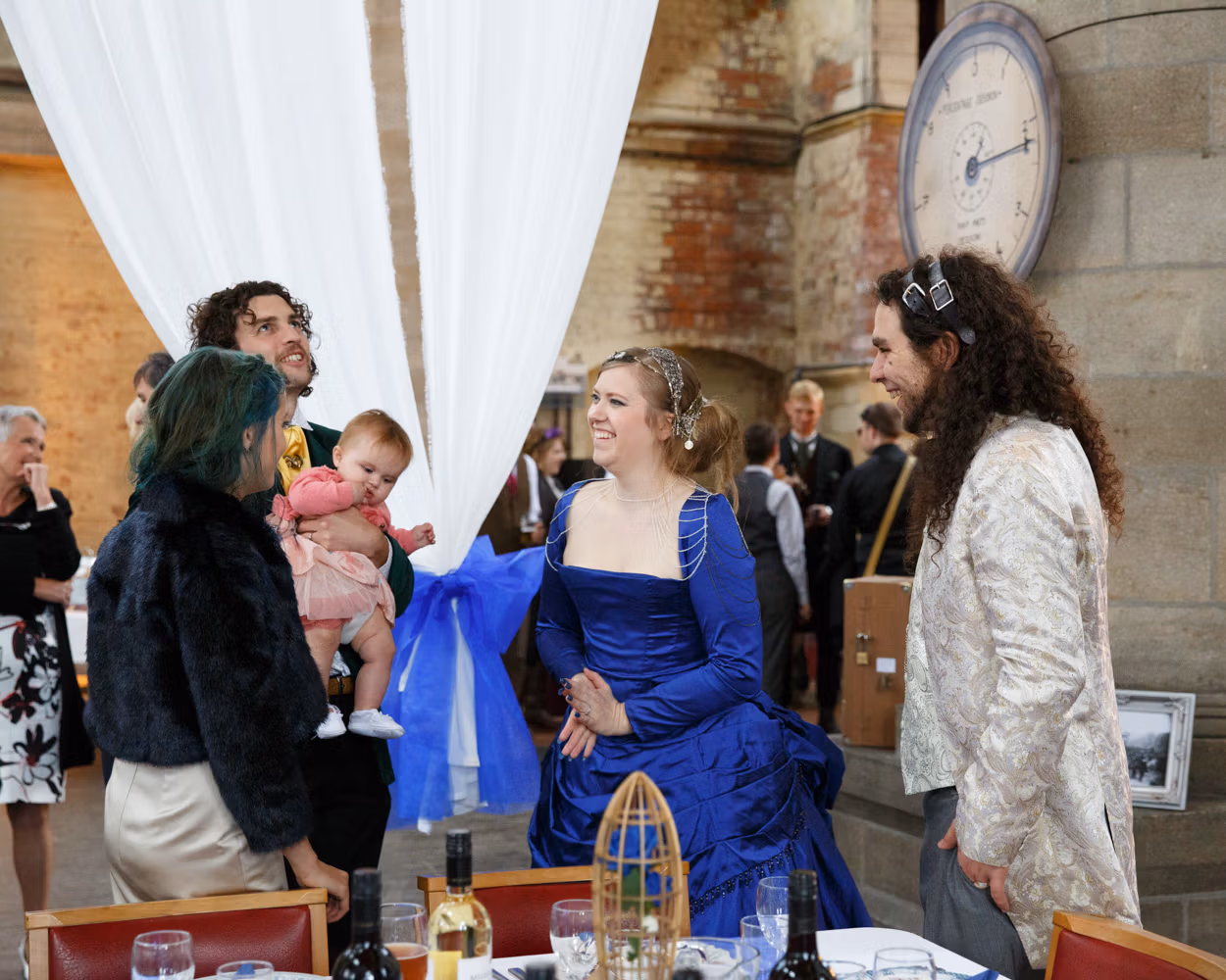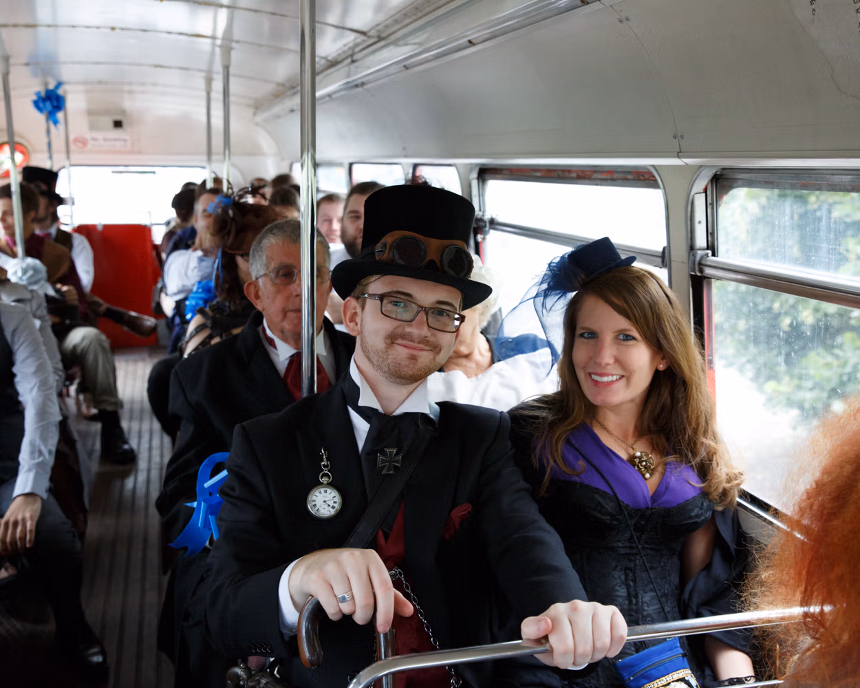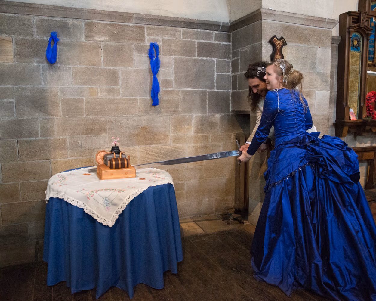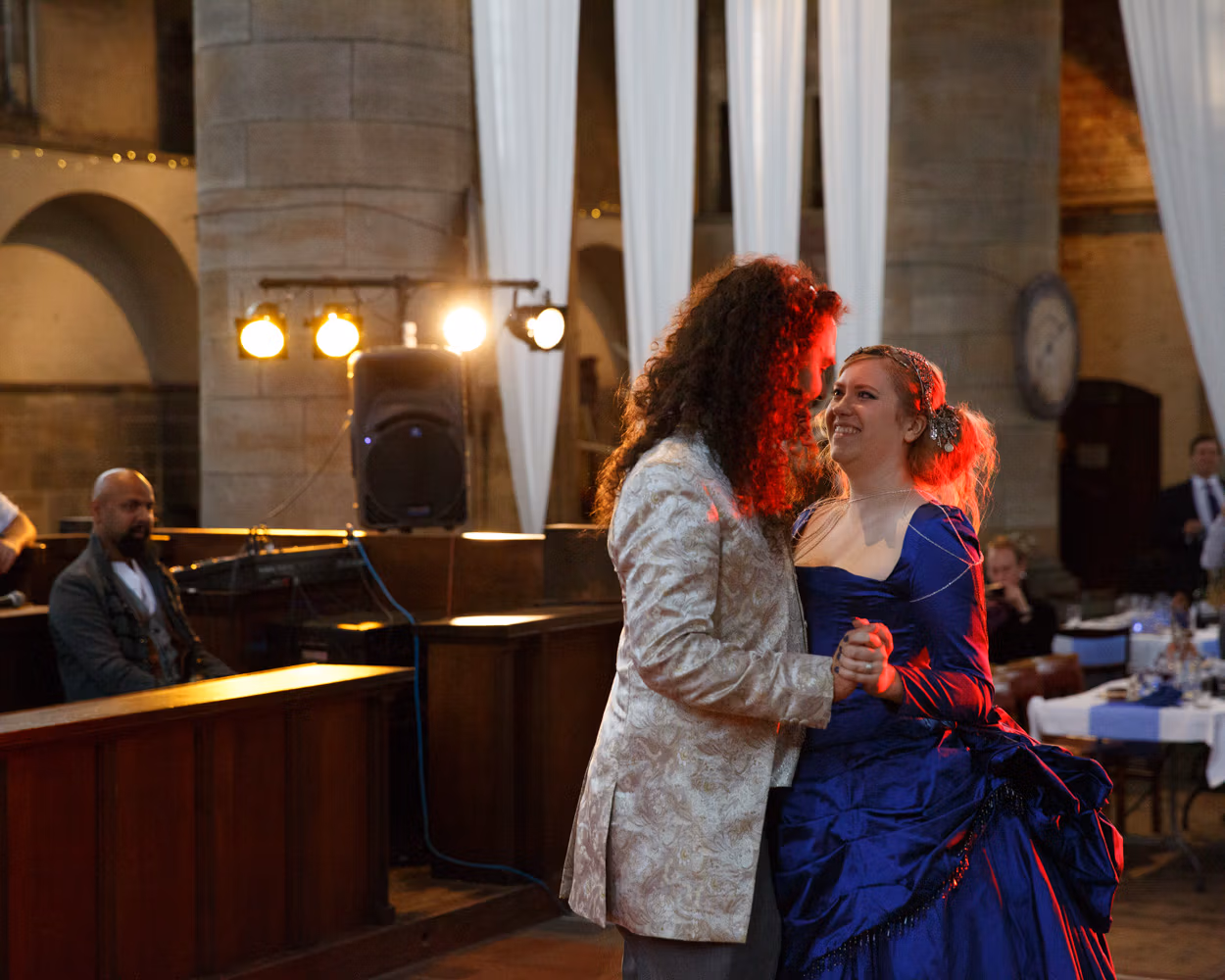 Linsey and Chris chose two striking Leeds wedding venues for their day — Kirkstall Abbey and Left Bank Leeds. Kirkstall Abbey sits just a short walk from home for me, while Left Bank Leeds, a deconsecrated church on Cardigan Lane, became the setting for their evening celebration. I hadn’t encountered a steampunk wedding before this one, but from the moment I arrived and began photographing the colour, detail, and personality, it was clear this was going to be one of the most enjoyable weddings I’d documented.