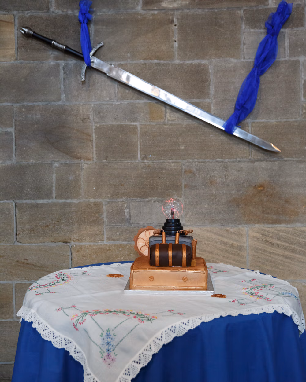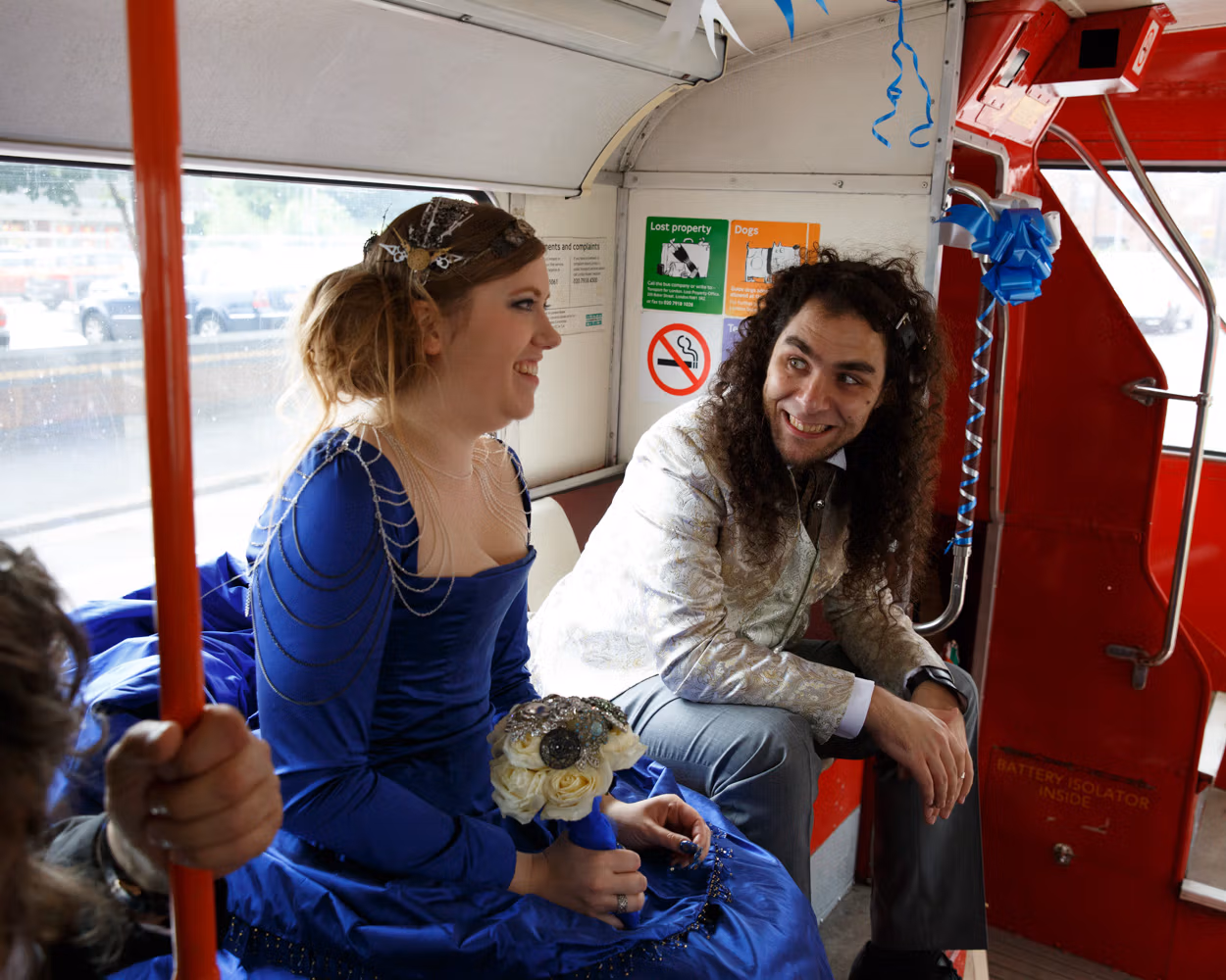 After drinks in the Kirkstall Abbey café, everyone boarded the wedding bus and travelled together to Left Bank Leeds. The shift in atmosphere was immediate. Tall ceilings amplified the space, long tables filled quickly, and the personality of the day revealed itself in layers — pie, mash, and gravy; a vintage photo-booth setup; a power-generator wedding cake; even an aeroplane suspended from the ceiling. Each detail added to the sense of fun without ever feeling staged.