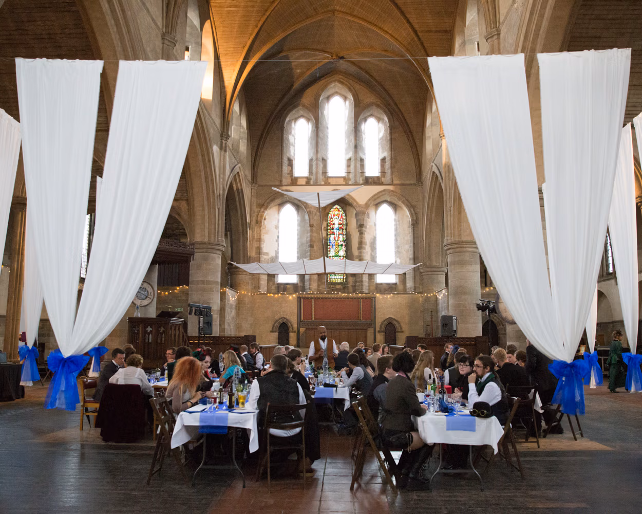 stone architecture and long ceremonial aisle. Left Bank Leeds, a restored Grade