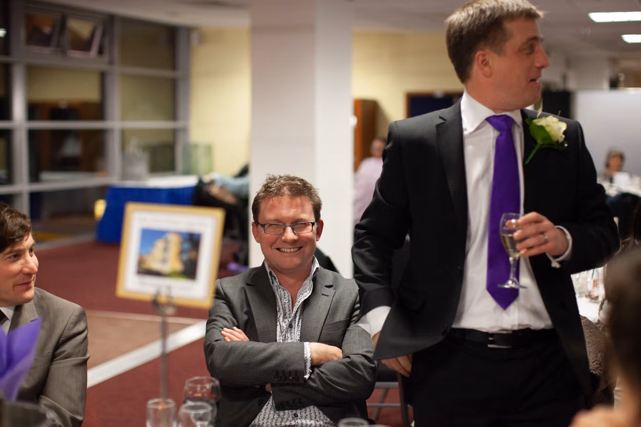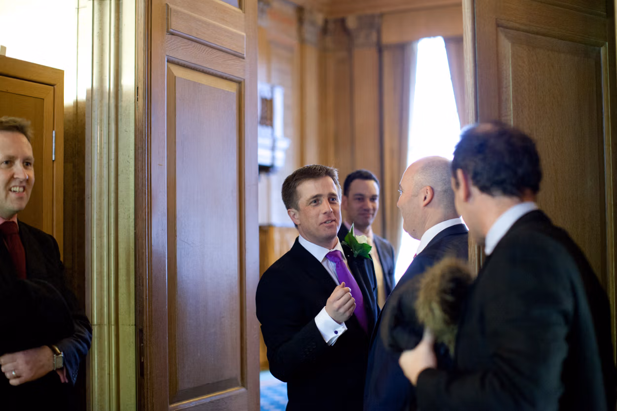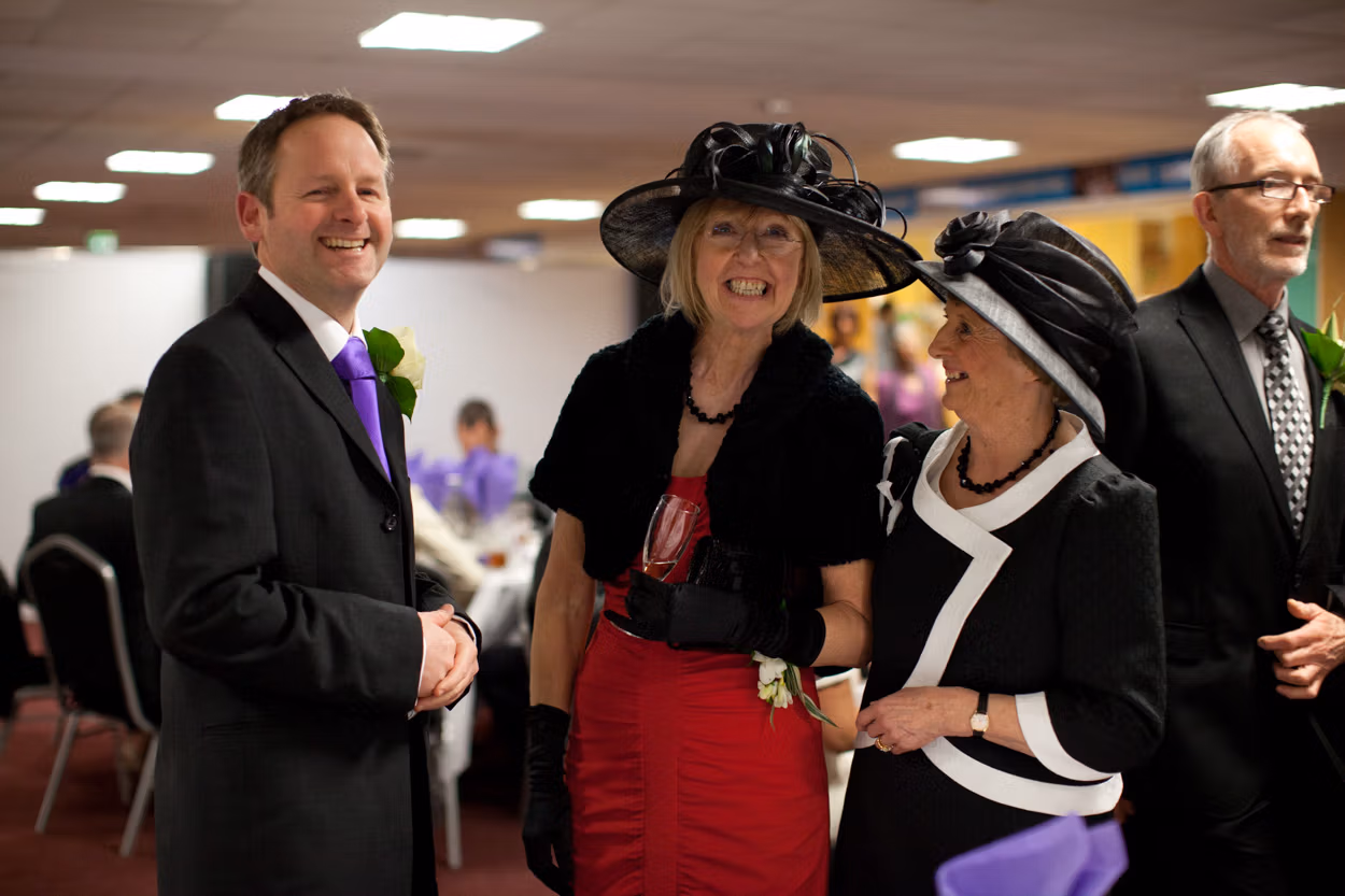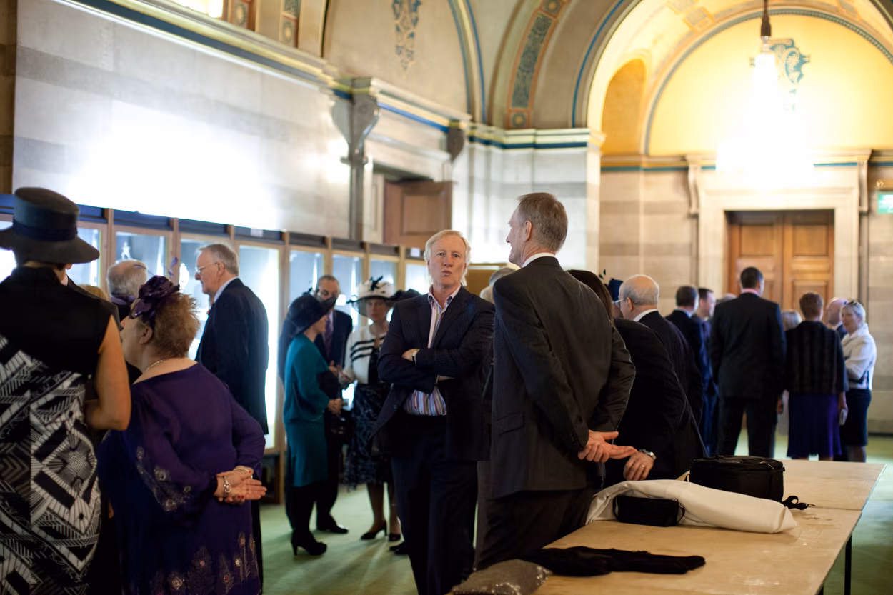 Guests arrived early and gathered inside Leeds Civic Hall, catching up quietly with Mark before the ceremony. Conversations flowed easily, coats were folded over arms, and the atmosphere stayed light and unforced.