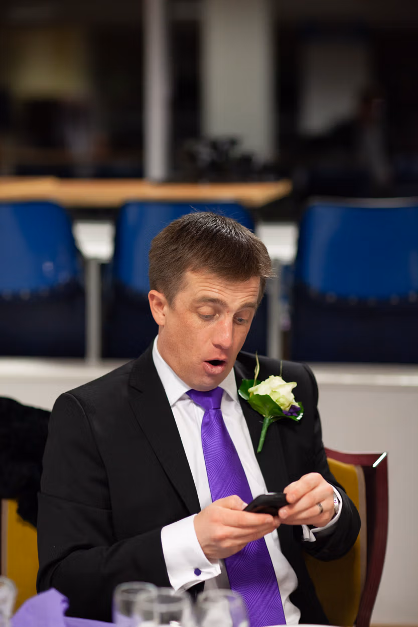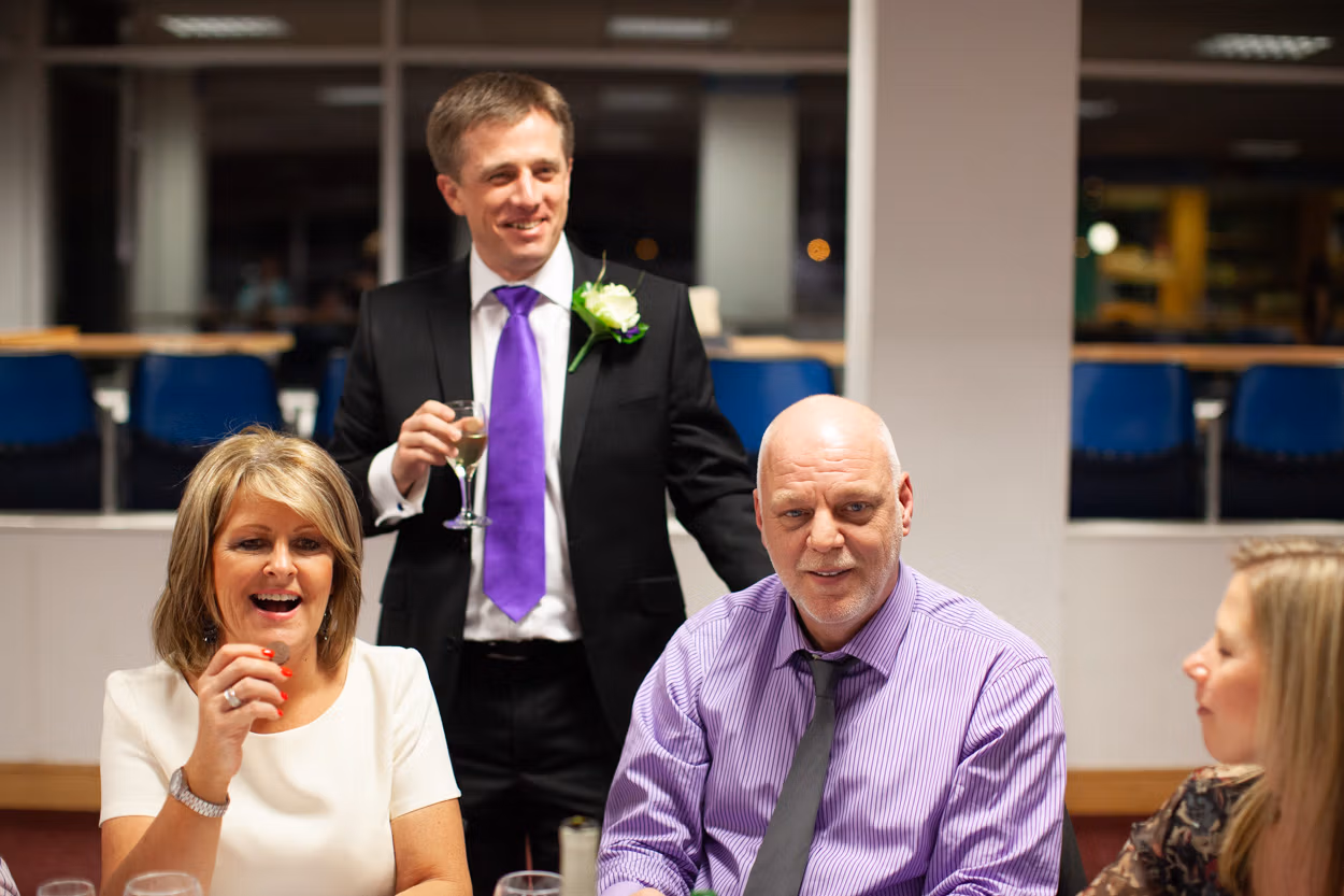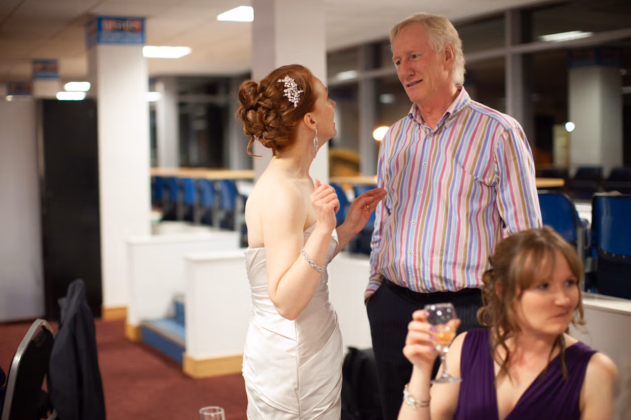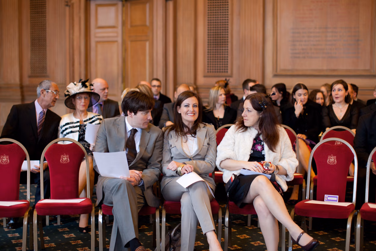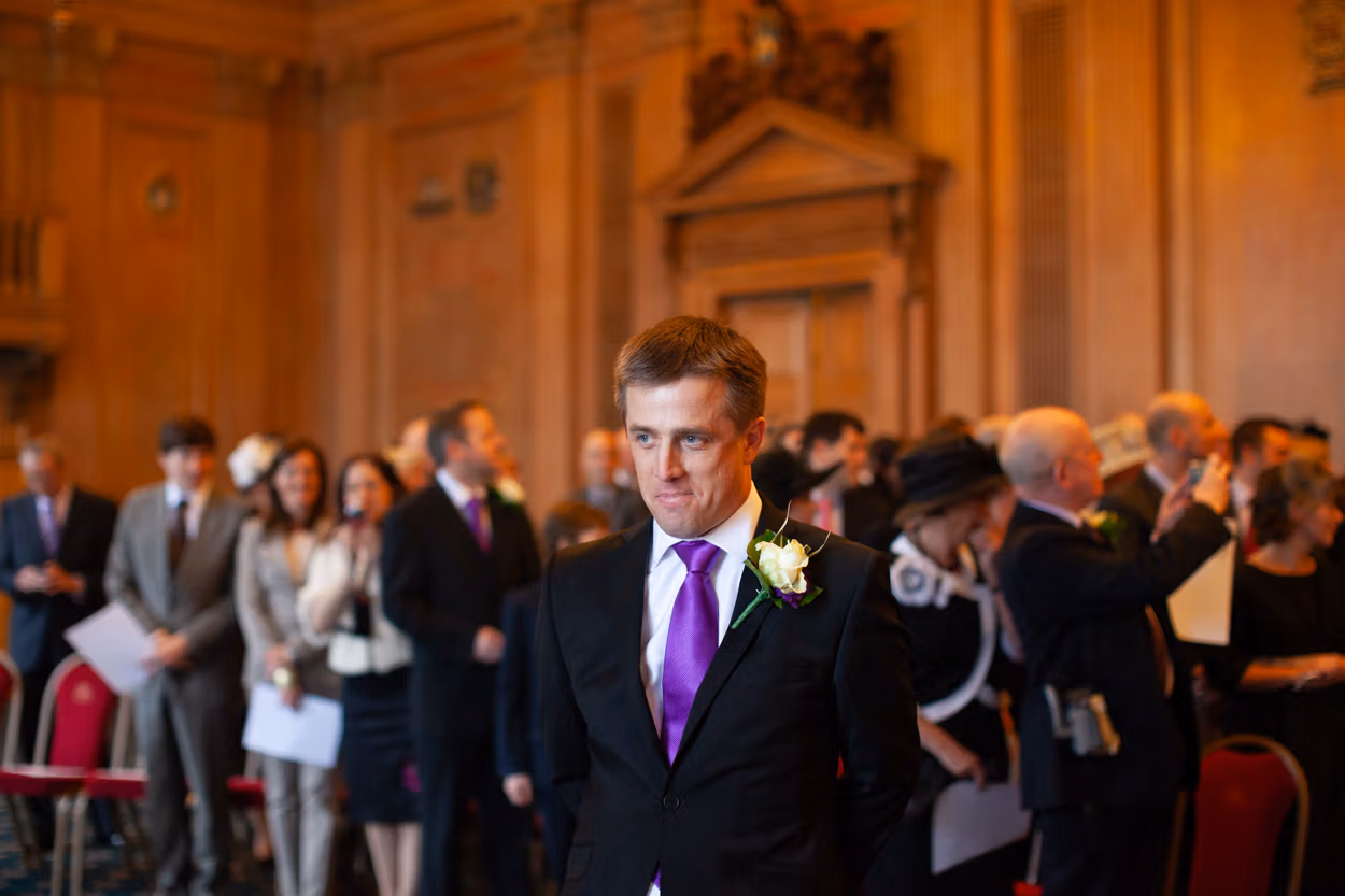 Guests arrived early and gathered inside Leeds Civic Hall, catching up quietly with Mark before the ceremony. Conversations flowed easily, coats were folded over arms, and the atmosphere stayed light and unforced.