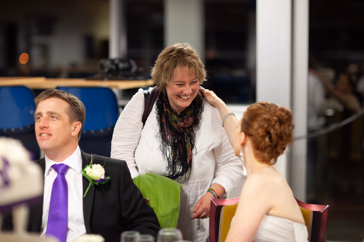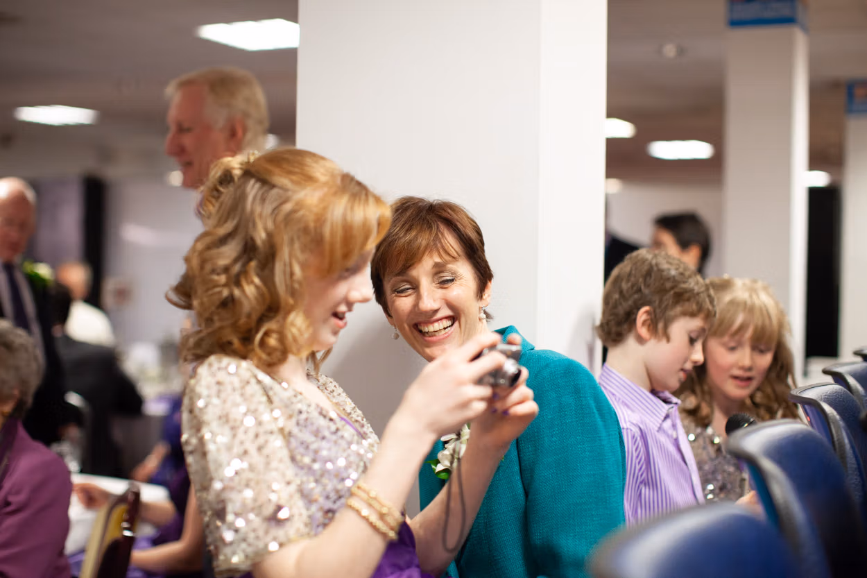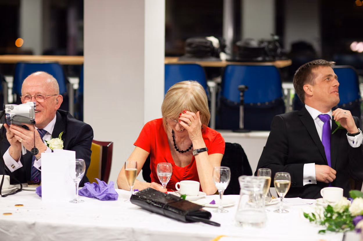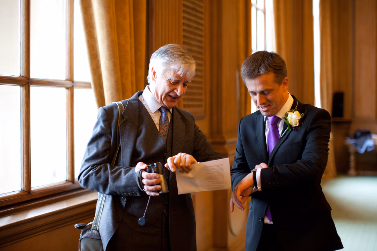 Guests arrived early and gathered inside Leeds Civic Hall, catching up quietly with Mark before the ceremony. Conversations flowed easily, coats were folded over arms, and the atmosphere stayed light and unforced.