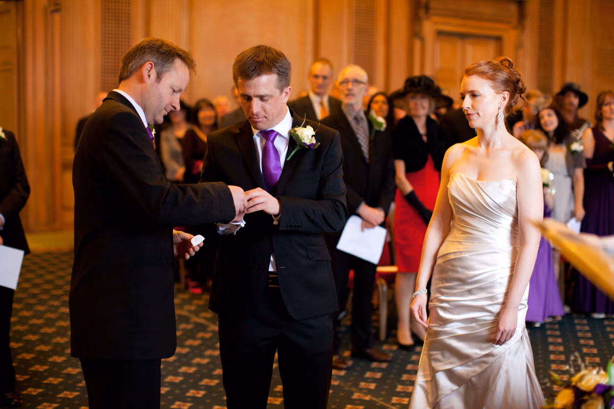 The exchange of vows and rings felt heartfelt and unhurried, grounding the ceremony in what mattered most to them. Their first kiss came in two parts — spontaneous, lighthearted, and full of joy — followed by laughter during the mock signing. As they stepped back out into the Great Hall together, the ceremony closed exactly as it had begun: relaxed, genuine, and full of feeling.