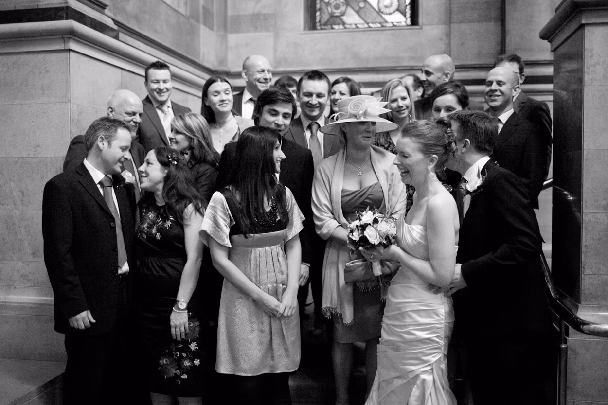 With February rain settling in outside, everyone stayed indoors — and Leeds Civic Hall offered more than enough room to breathe. Group photos unfolded naturally across the Great Hall, the balcony above, and the sweeping grand stairway, each space offering a different rhythm and backdrop without ever feeling repetitive.