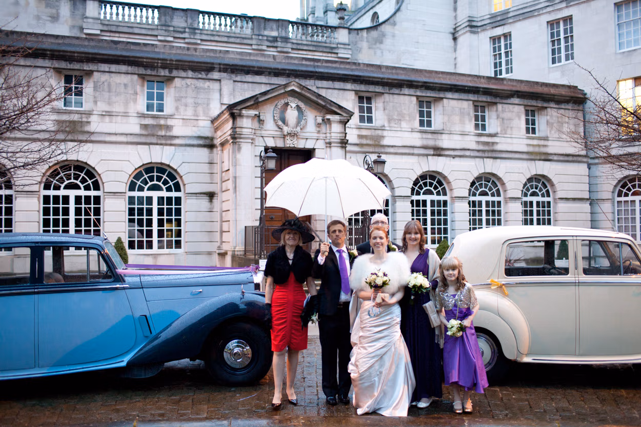 When the rain softened, we stepped briefly outside to the Civic Hall entrance. Just a few quiet couple portraits, followed by family photos beside the vintage cream and blue wedding cars, the white stone of the building rising behind them. A handful of final frames beside the car — city-centre Leeds all around — and then it was time to move on, the story ready for its next chapter.