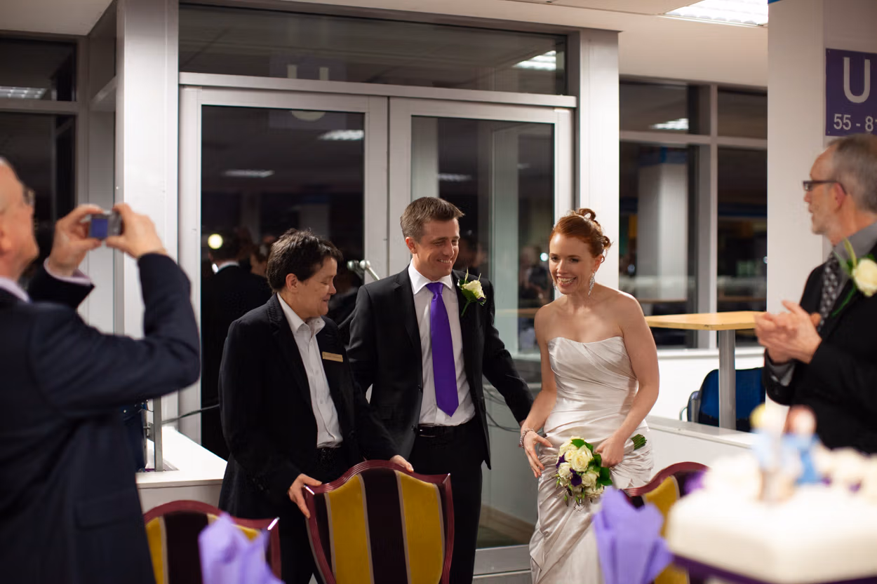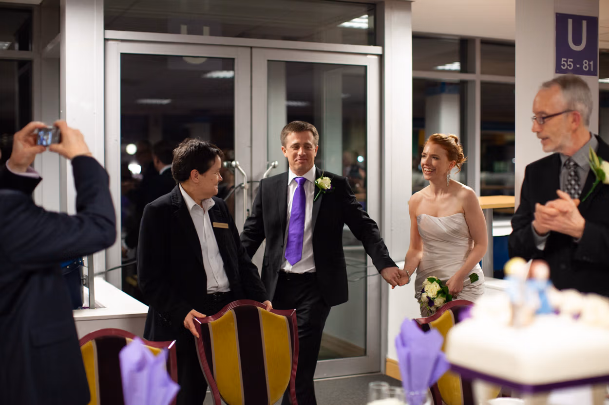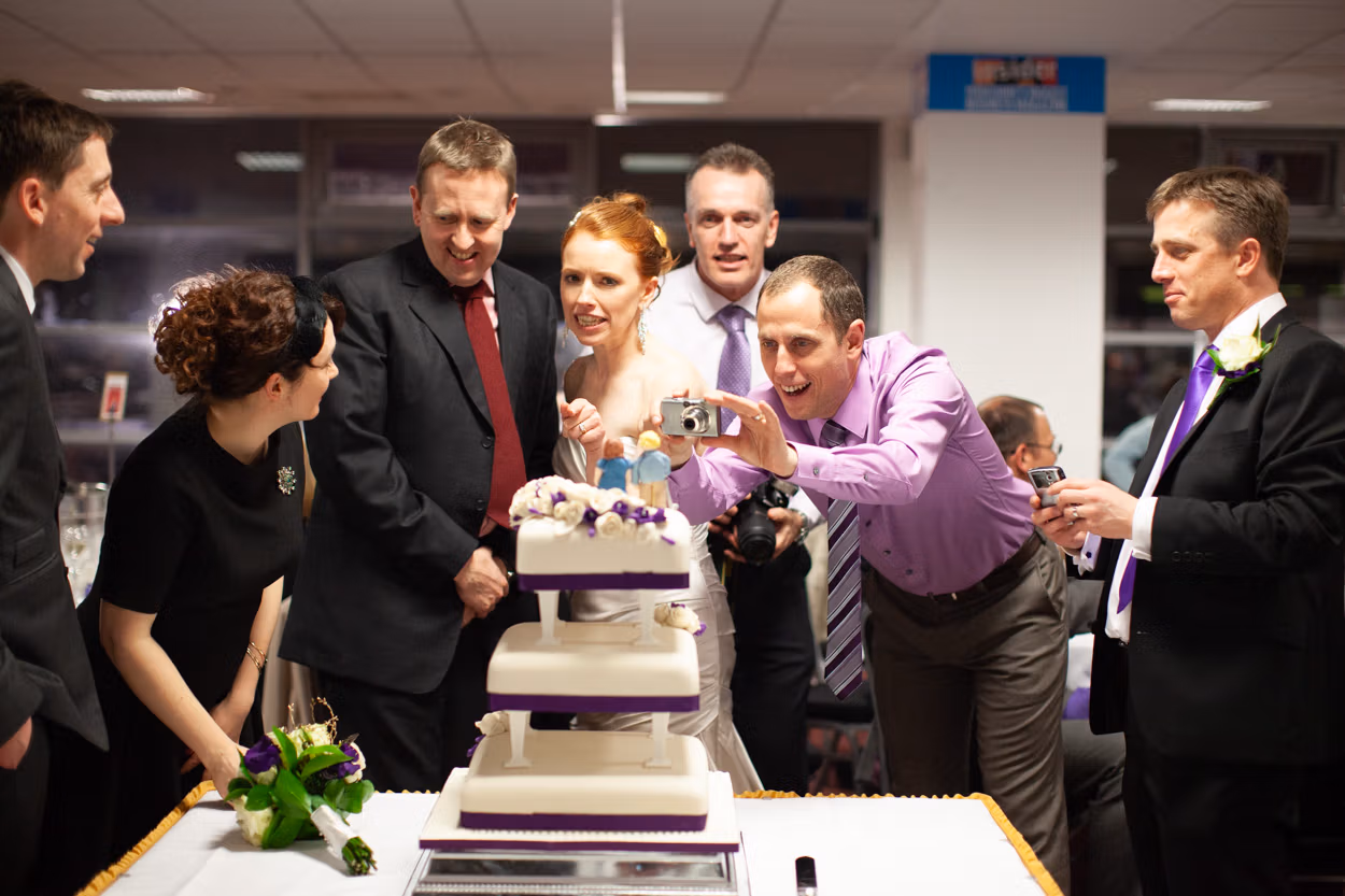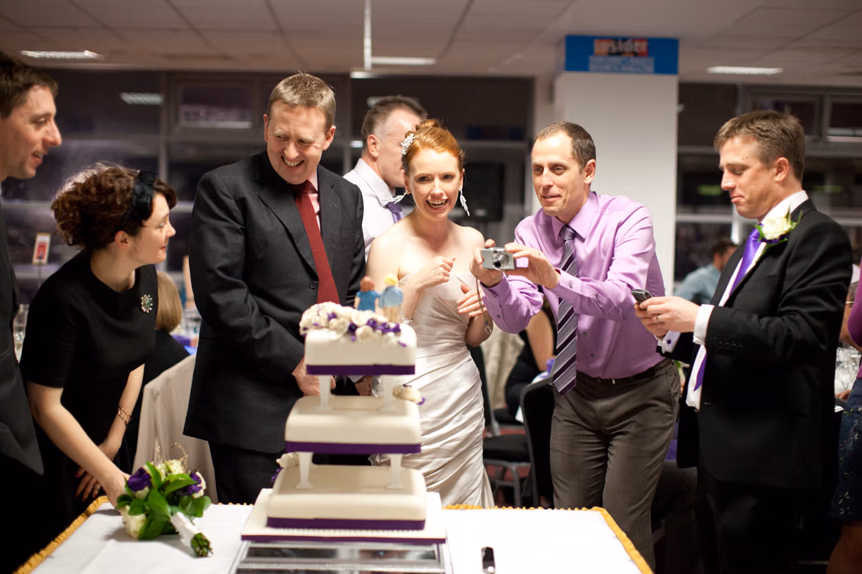 Afterwards, vintage cream and blue wedding cars carried everyone through the rain toward Headingley Stadium, where the celebration continued. There were quiet smiles, shared glances, a guest carrying the exact same camera as me, and — in the middle of it all — a birthday cake for their son, candles lit and blown out with cheers.