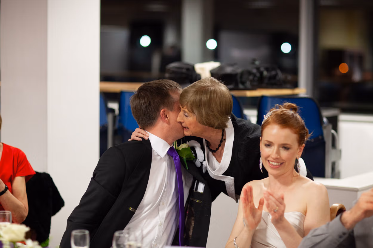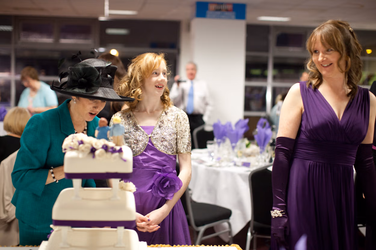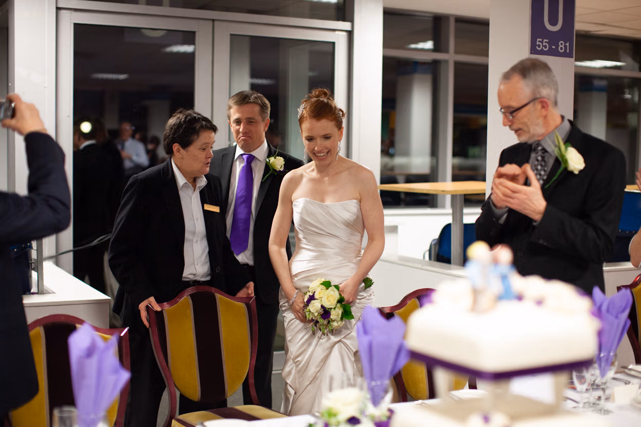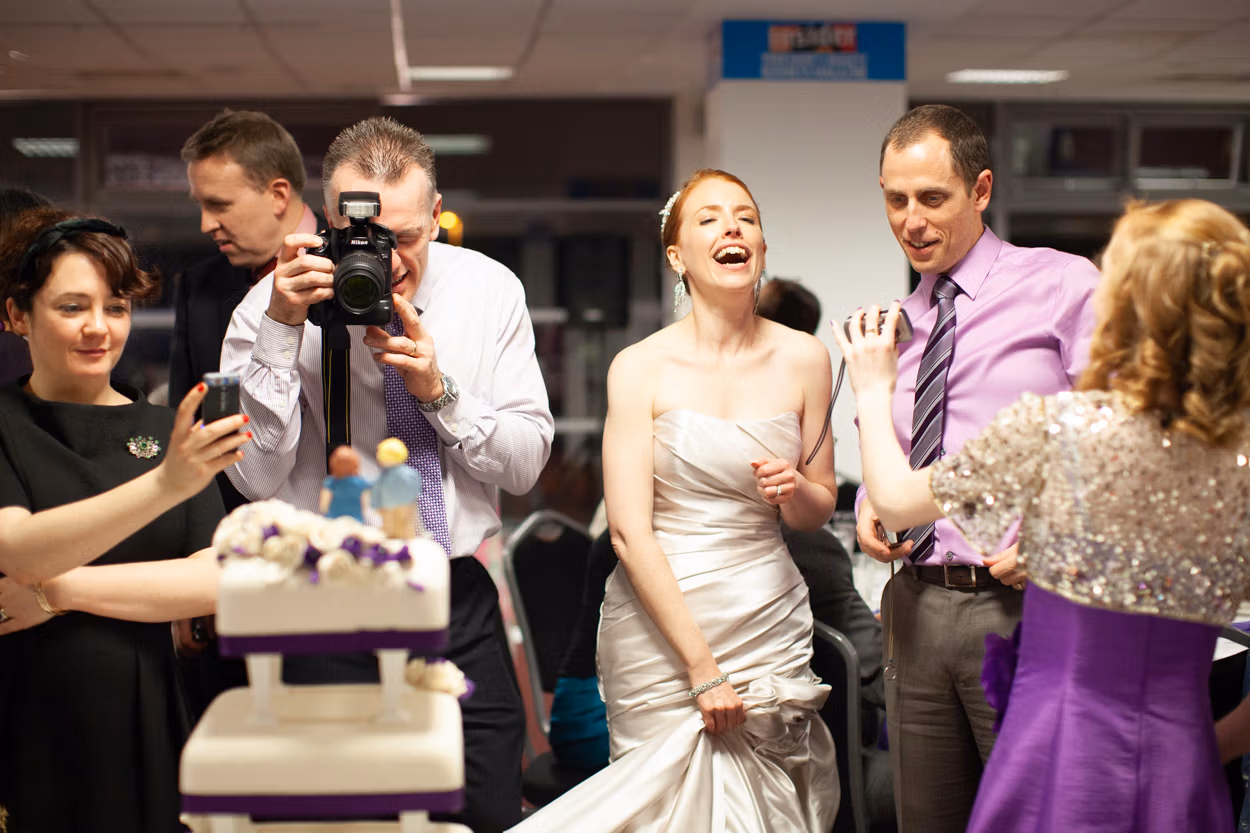 Afterwards, vintage cream and blue wedding cars carried everyone through the rain toward Headingley Stadium, where the celebration continued. There were quiet smiles, shared glances, a guest carrying the exact same camera as me, and — in the middle of it all — a birthday cake for their son, candles lit and blown out with cheers.
