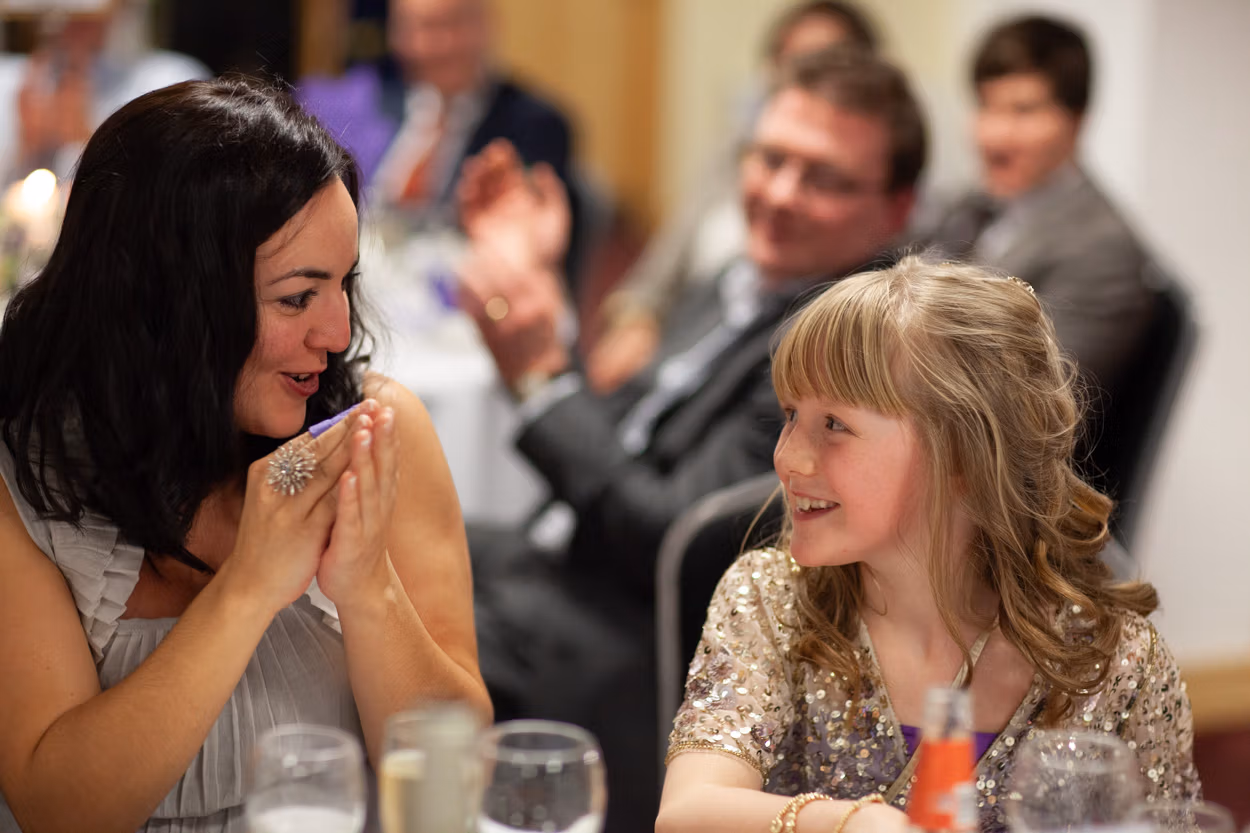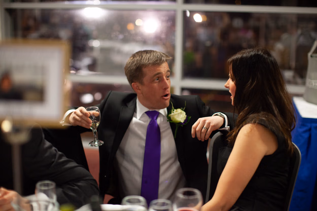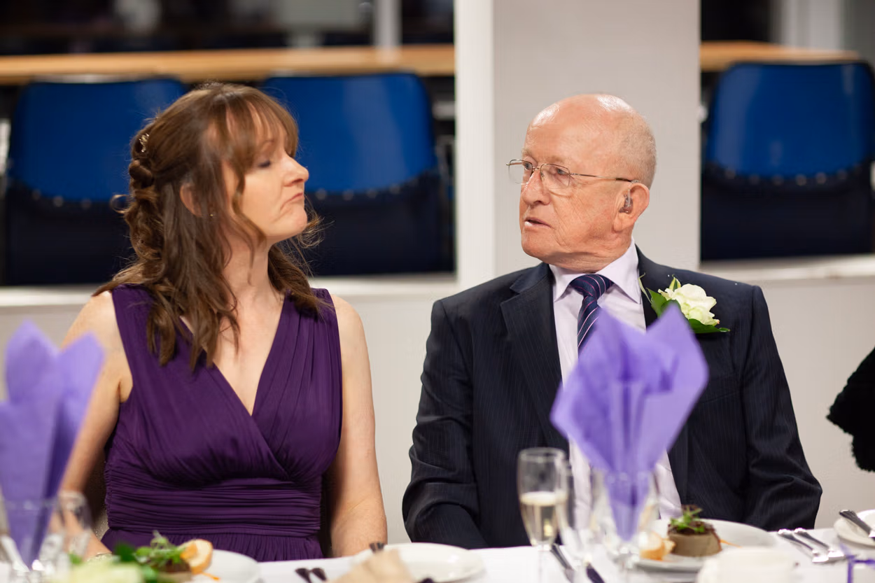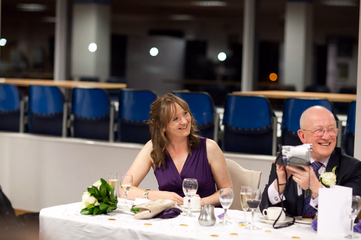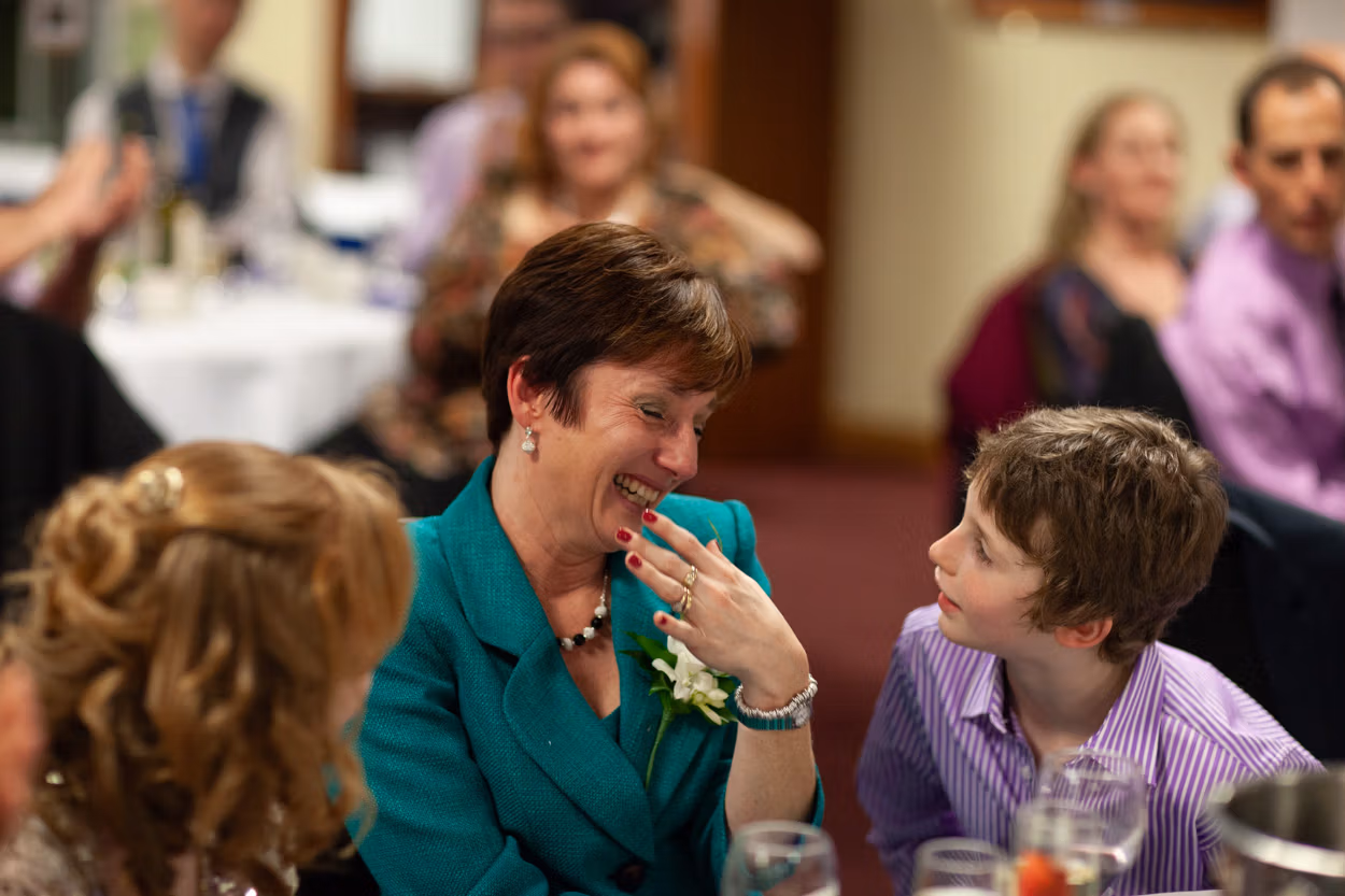 As everyone gathered, conversation flowed easily. The cake was admired, glasses were topped up, and the room filled with that low, happy hum that comes just before a couple arrives. When Sarah and Mark entered the wedding breakfast, smiles wide and completely at ease, the energy lifted instantly. They moved through the room without rush — greeting friends, hugging family, laughing freely — settling into an evening that felt relaxed, personal, and full of warmth.