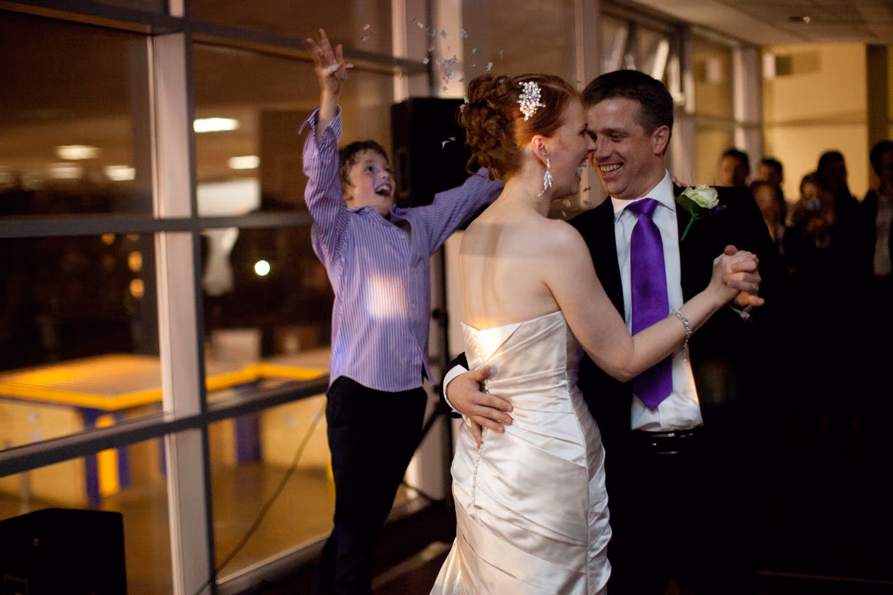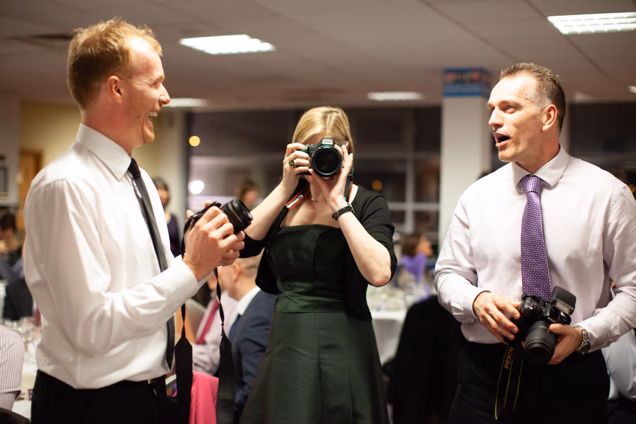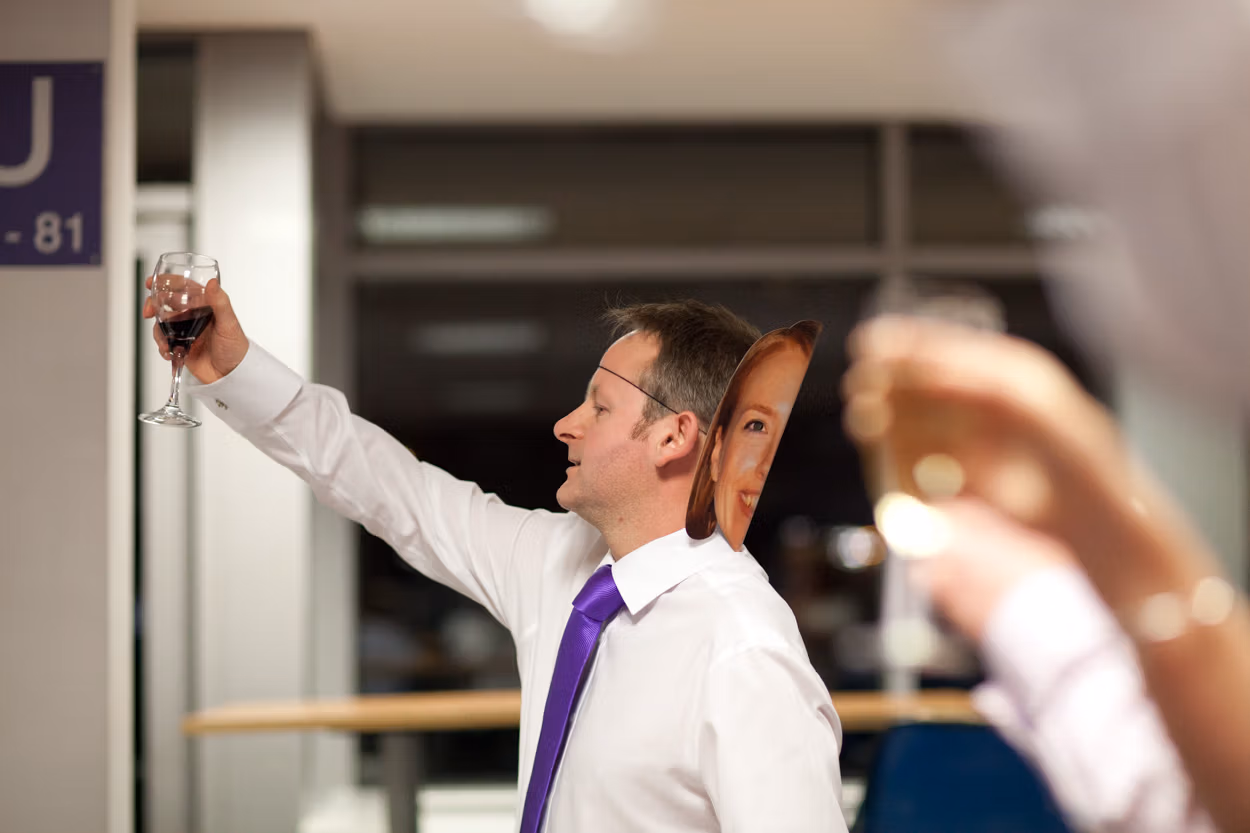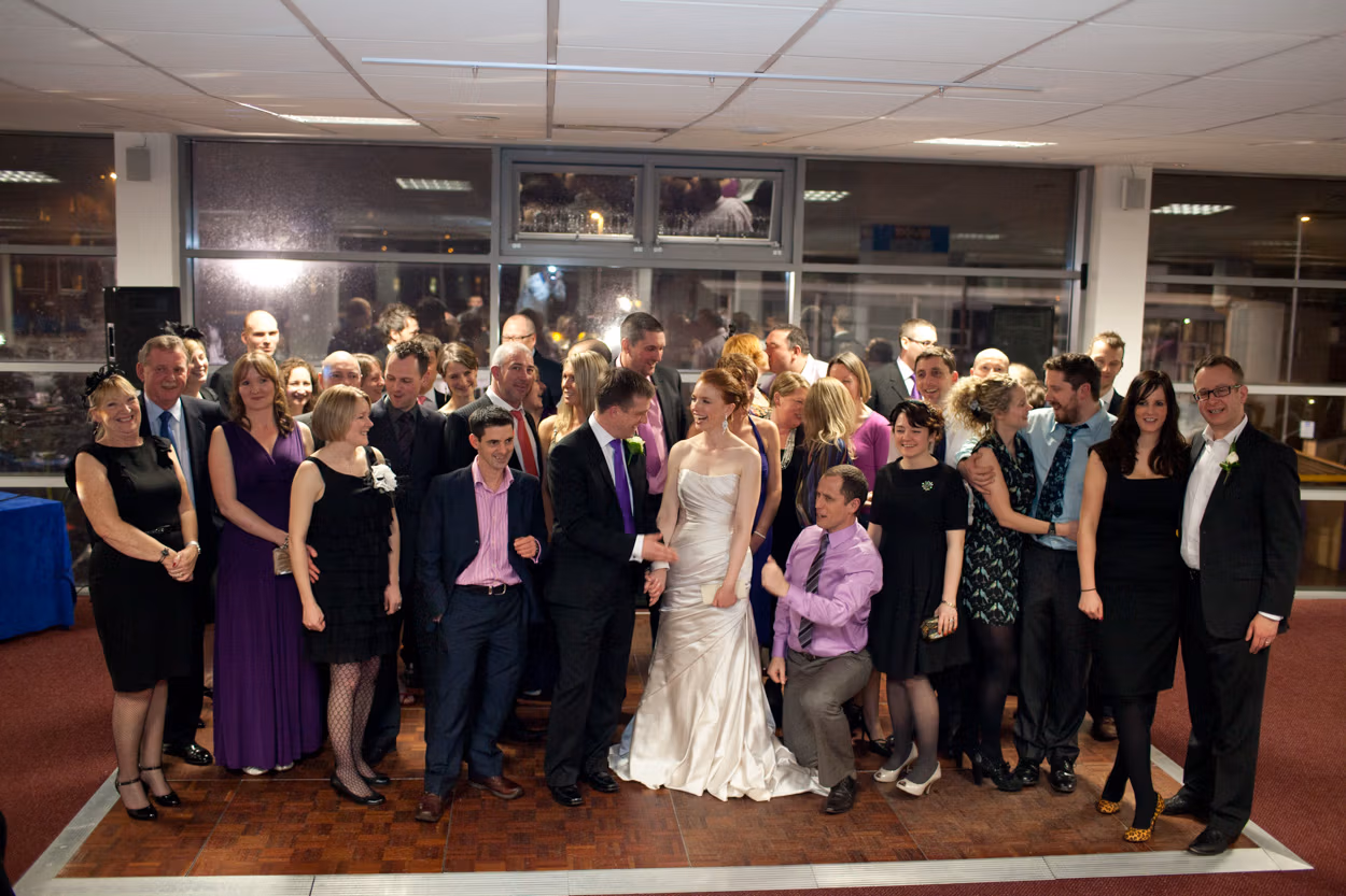 For a moment, the wedding paused for something quieter and just as meaningful. I gathered everyone near the windows for a quick group photograph — climbing onto a table to fit everyone in — laughter breaking out as people shuffled closer, still riding the warmth of the surprise. The face mask made a return, a final burst of silliness before the night tipped into motion.
