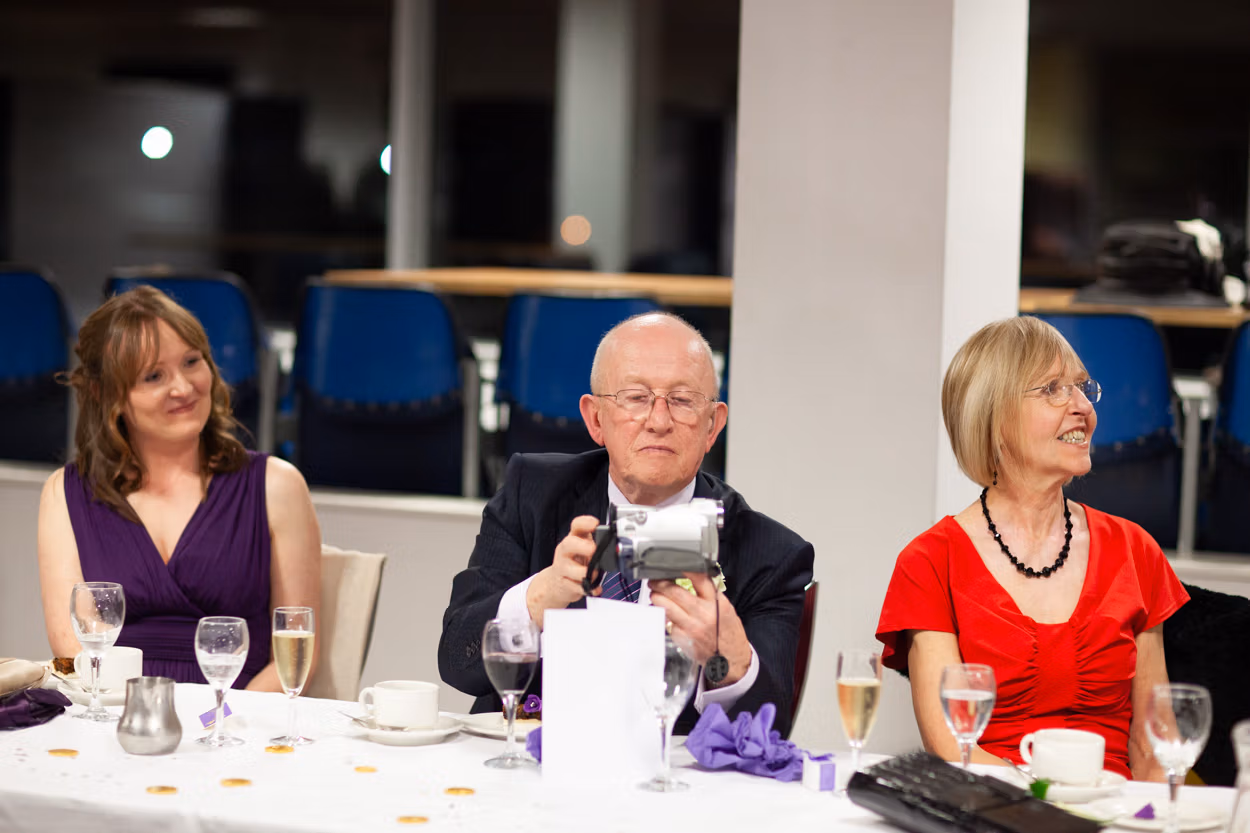 As they stepped back into the room, the pace never shifted. Guests drifted closer, conversations picked up again, and the evening settled into that comfortable rhythm that makes a wedding feel like a gathering rather than an event. A friend leaned in to photograph the cake — and a second later I noticed he was holding the exact same camera as me. A small detail, but one that summed up how the day felt: easy, informal, everyone fitting together naturally.