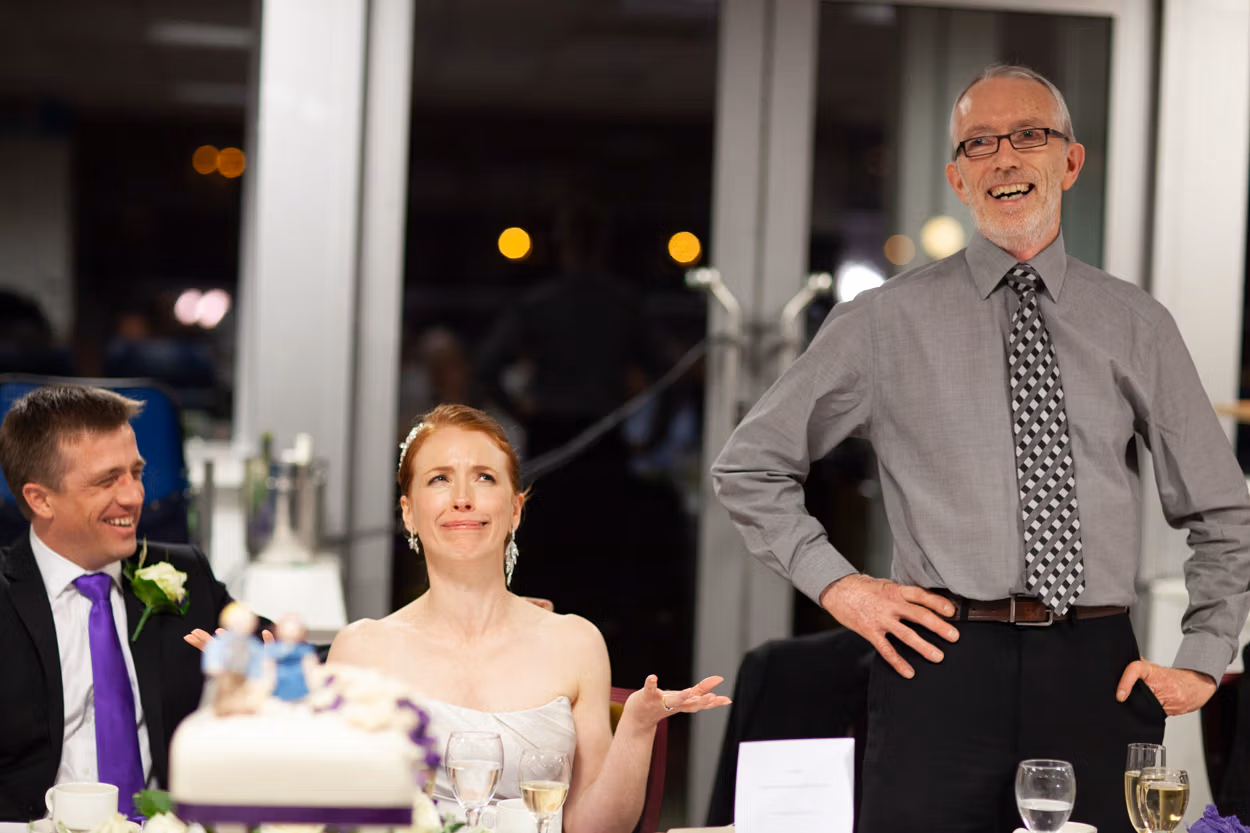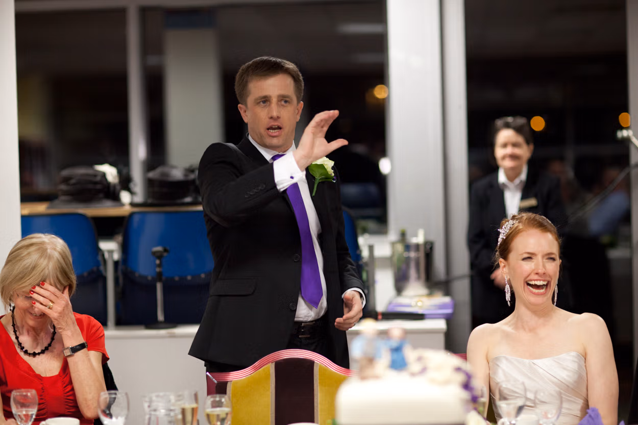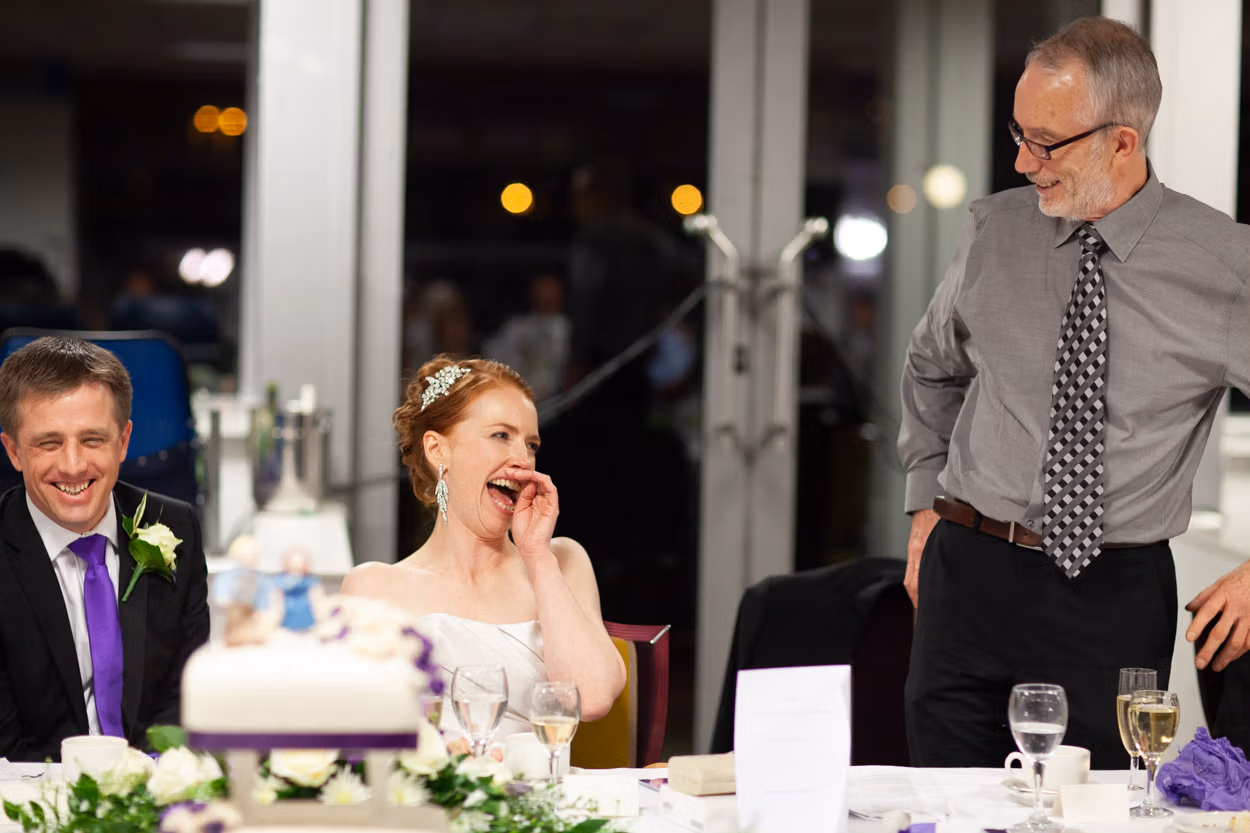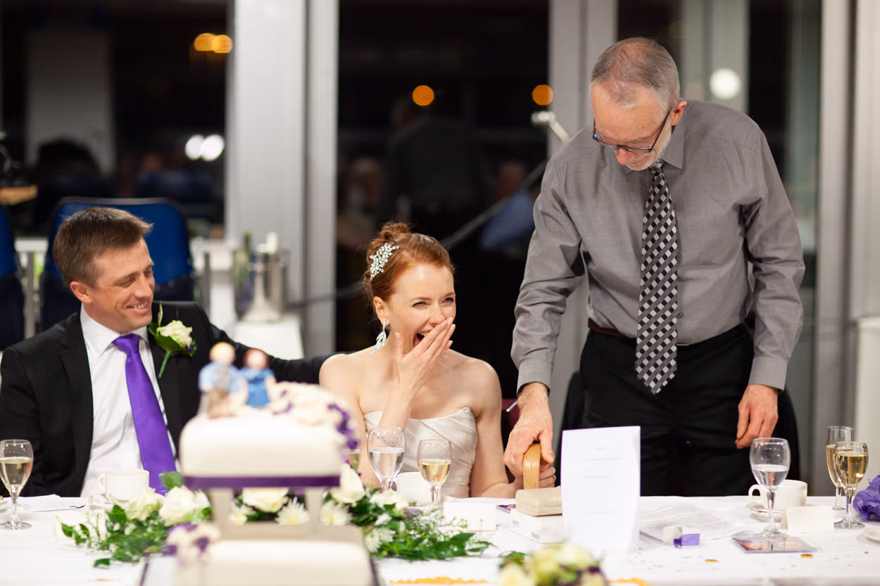 The speeches followed in the same spirit. Sarah’s father spoke with warmth and obvious pride, his words met with smiles and quiet emotion. Mark followed, passing flowers and small gifts as a thank-you — thoughtful gestures that felt completely in character. Then came the best man, wearing a face mask printed with Sarah’s face, delivering a speech that tipped the room into laughter. Sarah’s reaction said everything — joy, disbelief, and that kind of laughter you can’t stage.