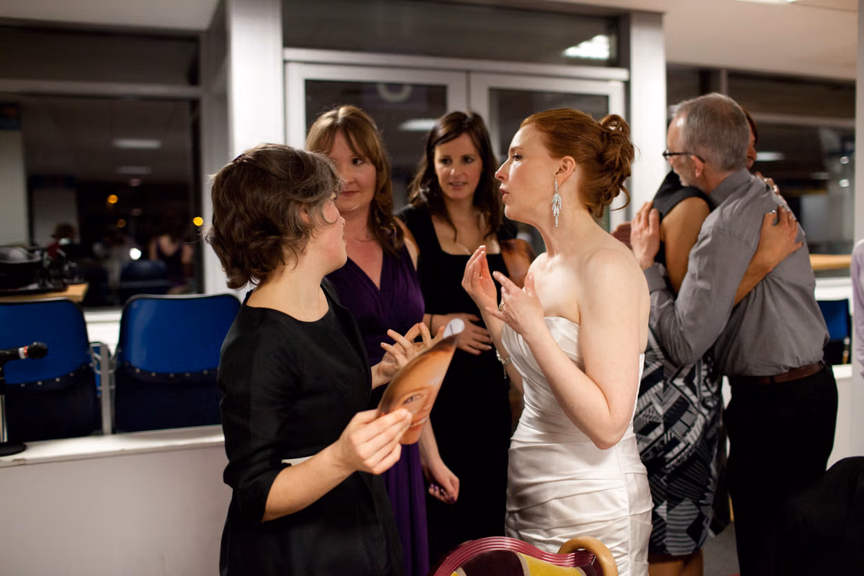 A friend stood discreetly near the curtain, holding a traditional video camera, quietly recording the moment without interrupting it. Love and happiness filled the room in a way that felt entirely natural. When the planned song began, accompanied by the pianist, it lifted the whole hall — guests smiling, voices joining in, the atmosphere warming all at once.
