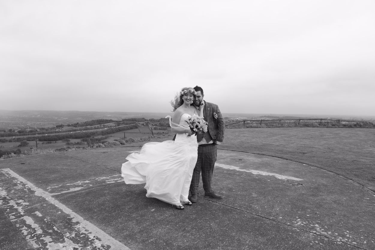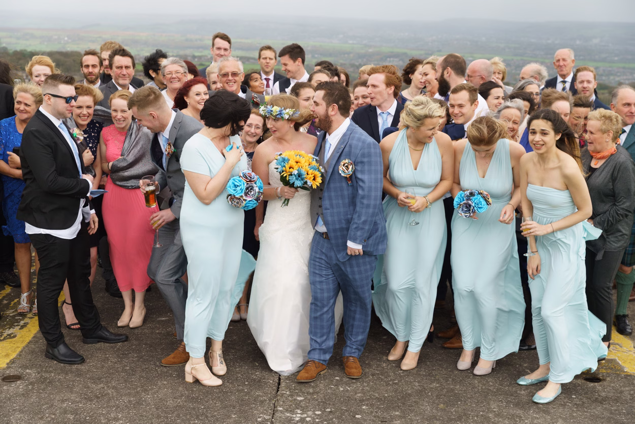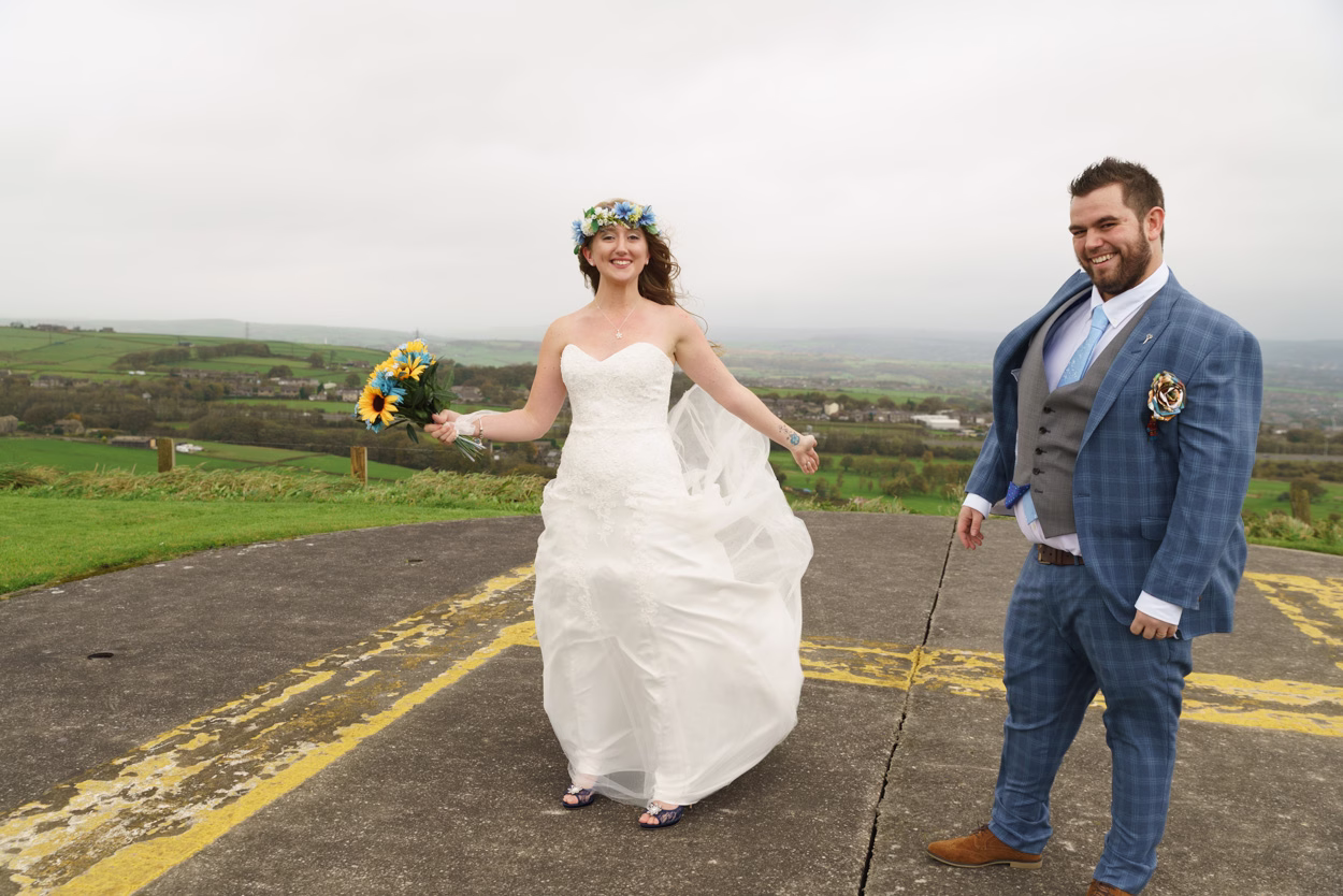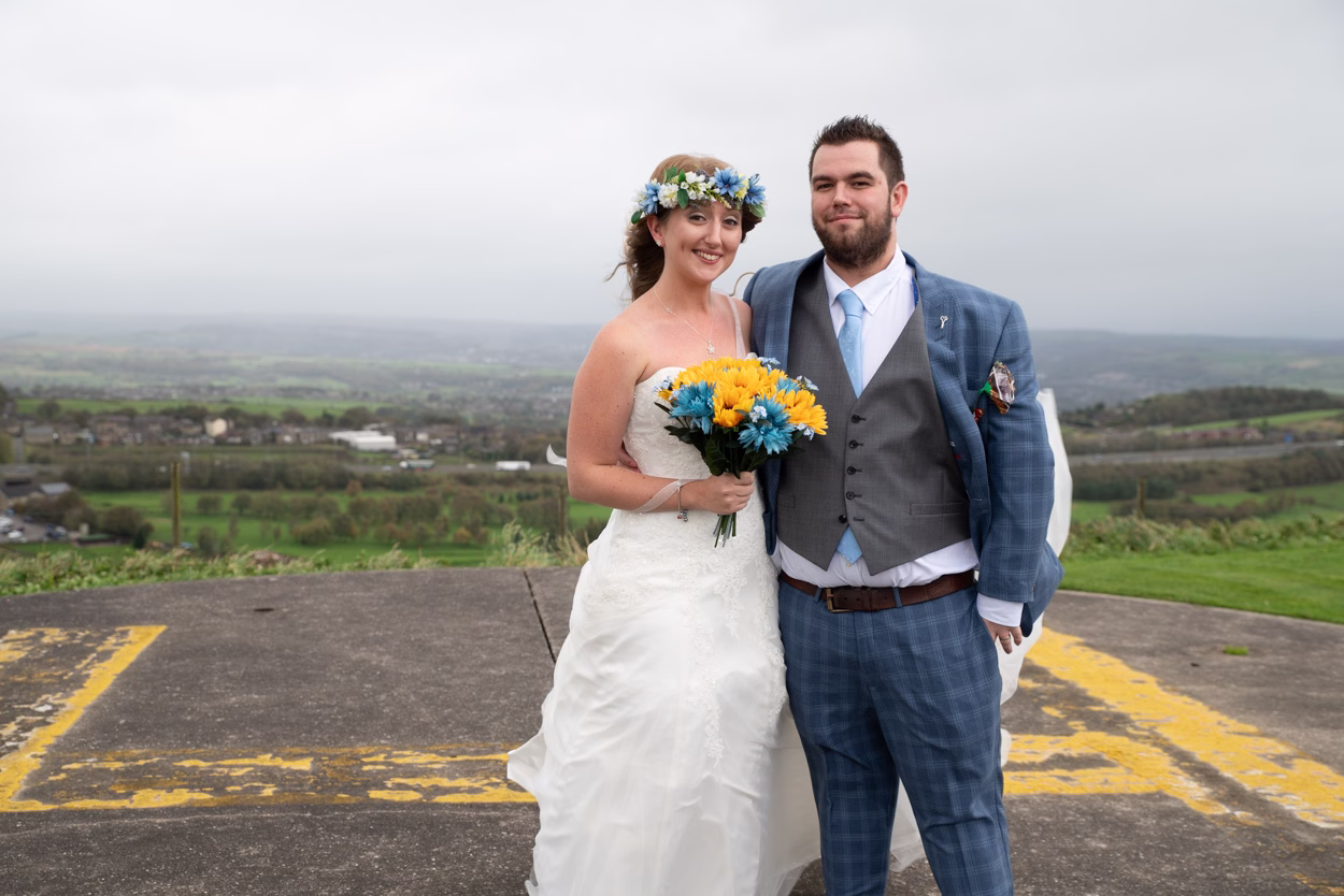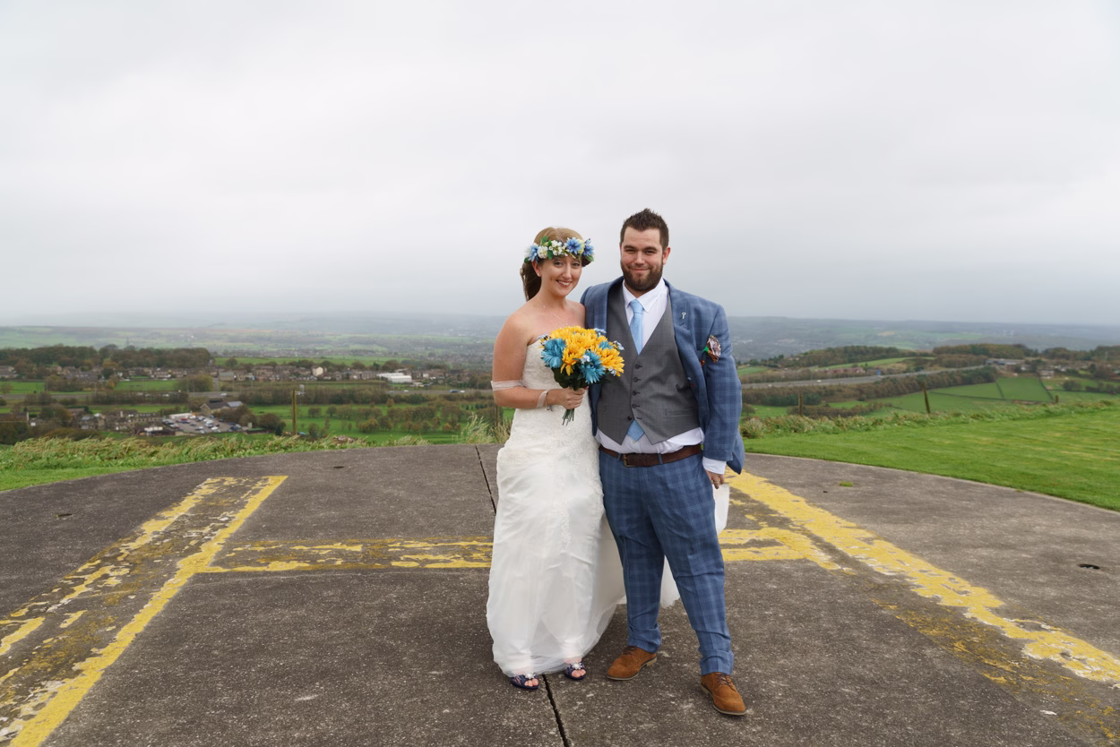 Julia and Scott were absolute stars on their October wedding at Pennine Manor Hotel in Huddersfield. The wind was wild, yet the couple—and all their guests—bravely ventured onto the helipad for the planned group photo. Hats off to everyone for embracing the gusts!