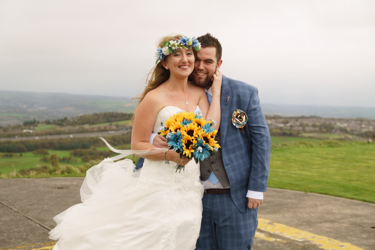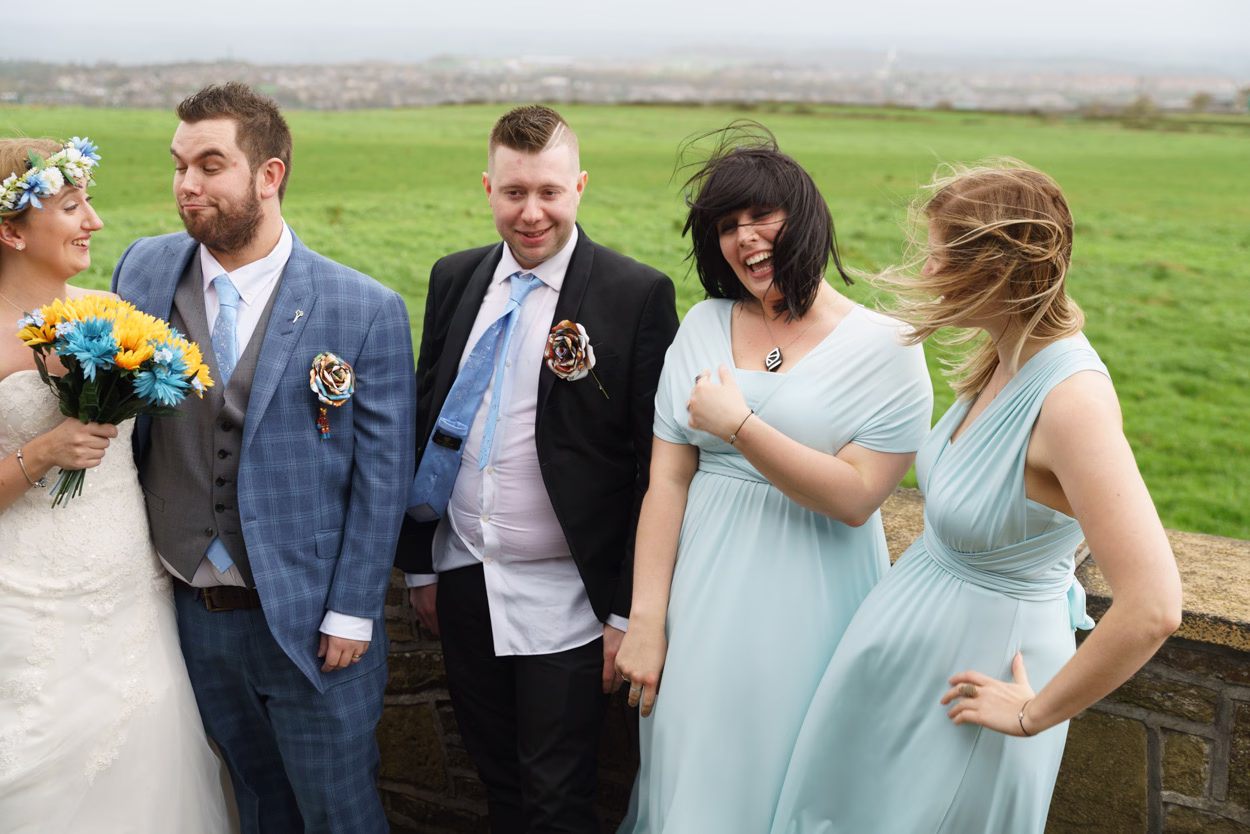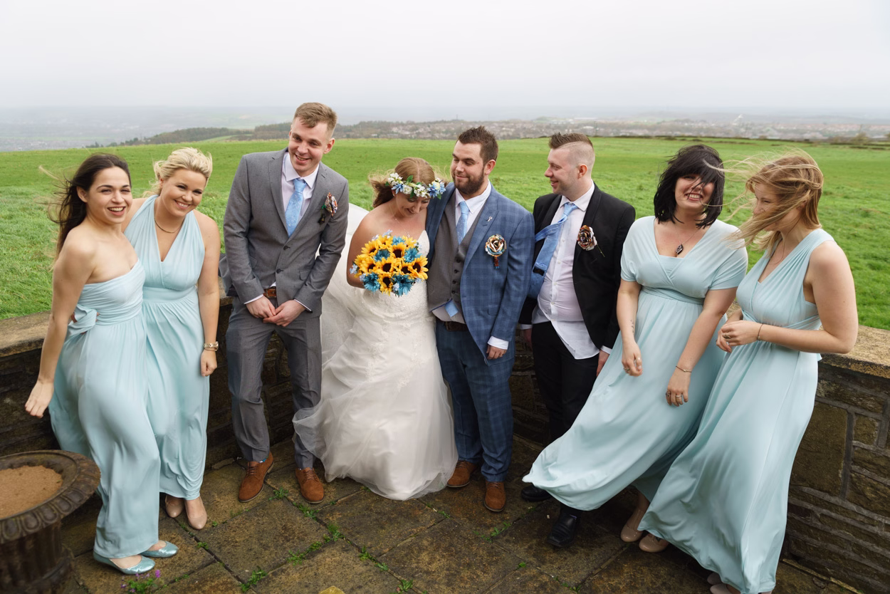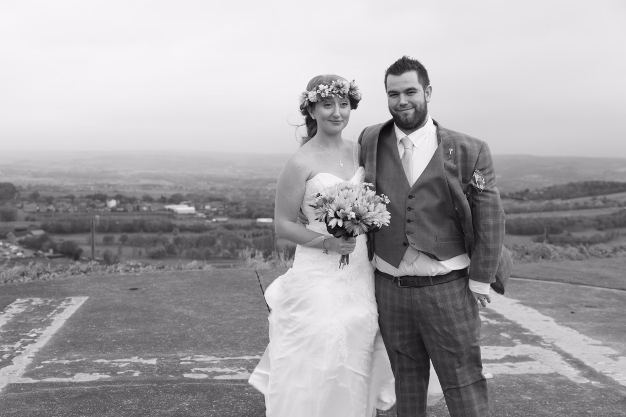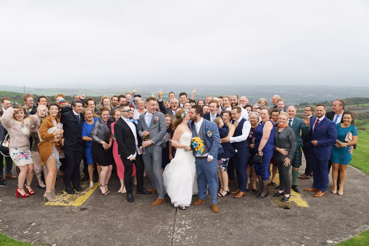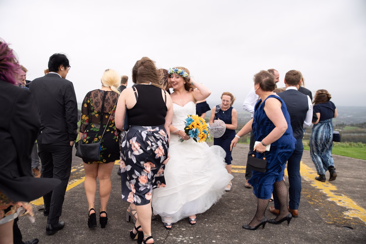 Julia and Scott were absolute stars on their October wedding at Pennine Manor Hotel in Huddersfield. The wind was wild, yet the couple—and all their guests—bravely ventured onto the helipad for the planned group photo. Hats off to everyone for embracing the gusts!