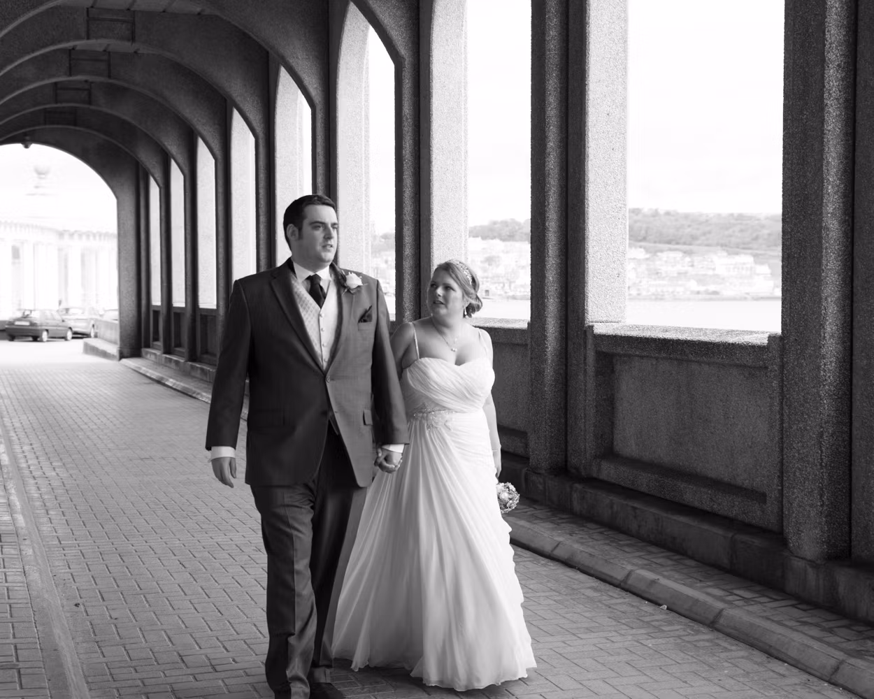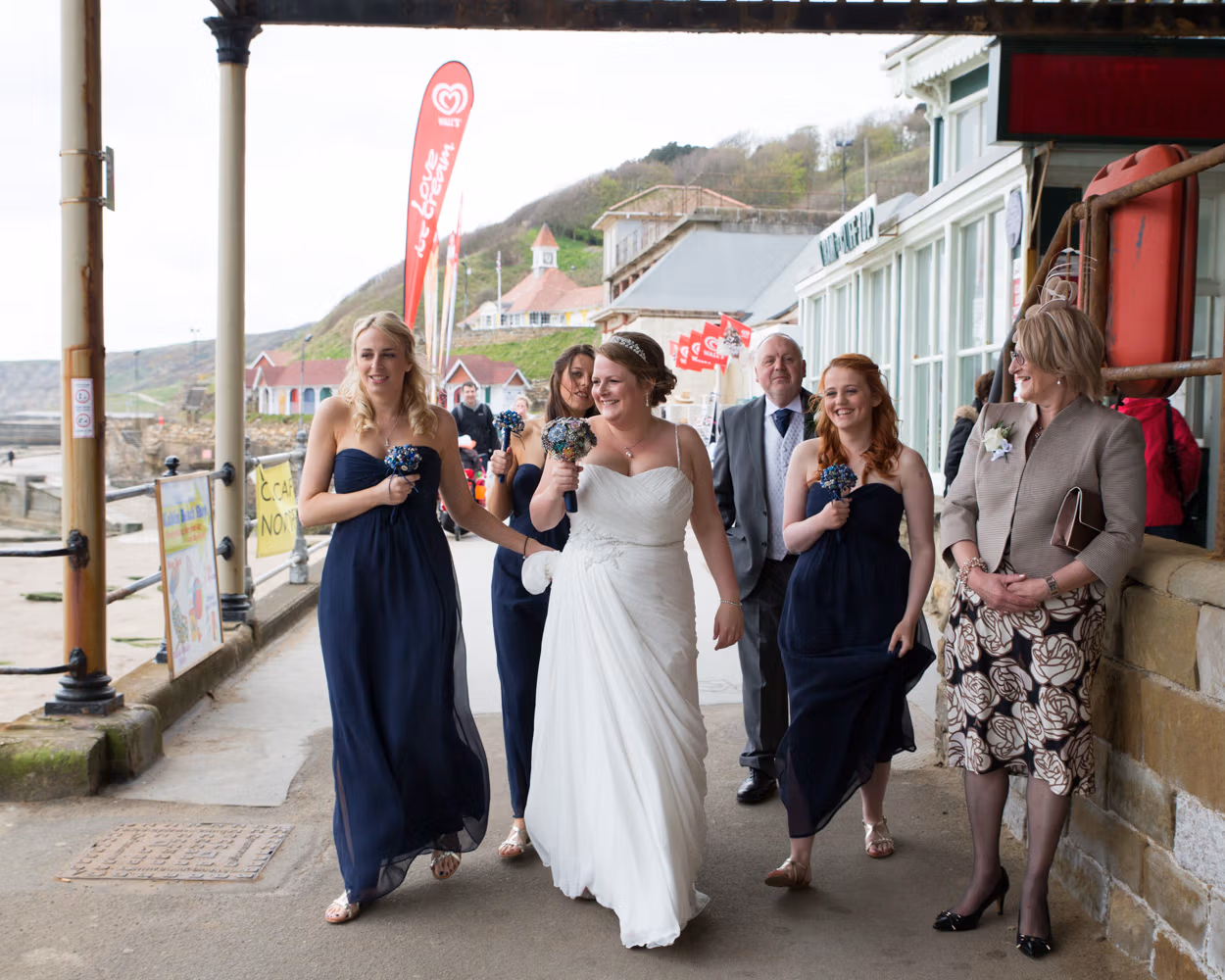 Lisa arrived with her bridesmaids and parents on the promenade, walking together toward Scarborough Spa as the wind lifted dresses and carried laughter along the seafront. They passed through the tunnel beneath the cliffs — that familiar Scarborough moment where the light drops briefly before opening out again.