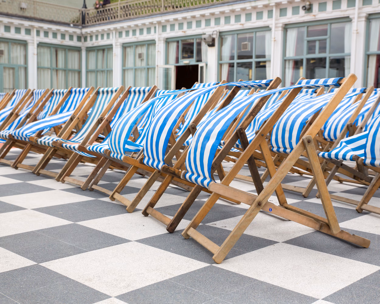 Outside, blue and white striped deckchairs shifted and fluttered in the breeze, the weather teasing but never quite committing. Guests gathered slowly, a few umbrellas appearing as light spits of rain drifted through.