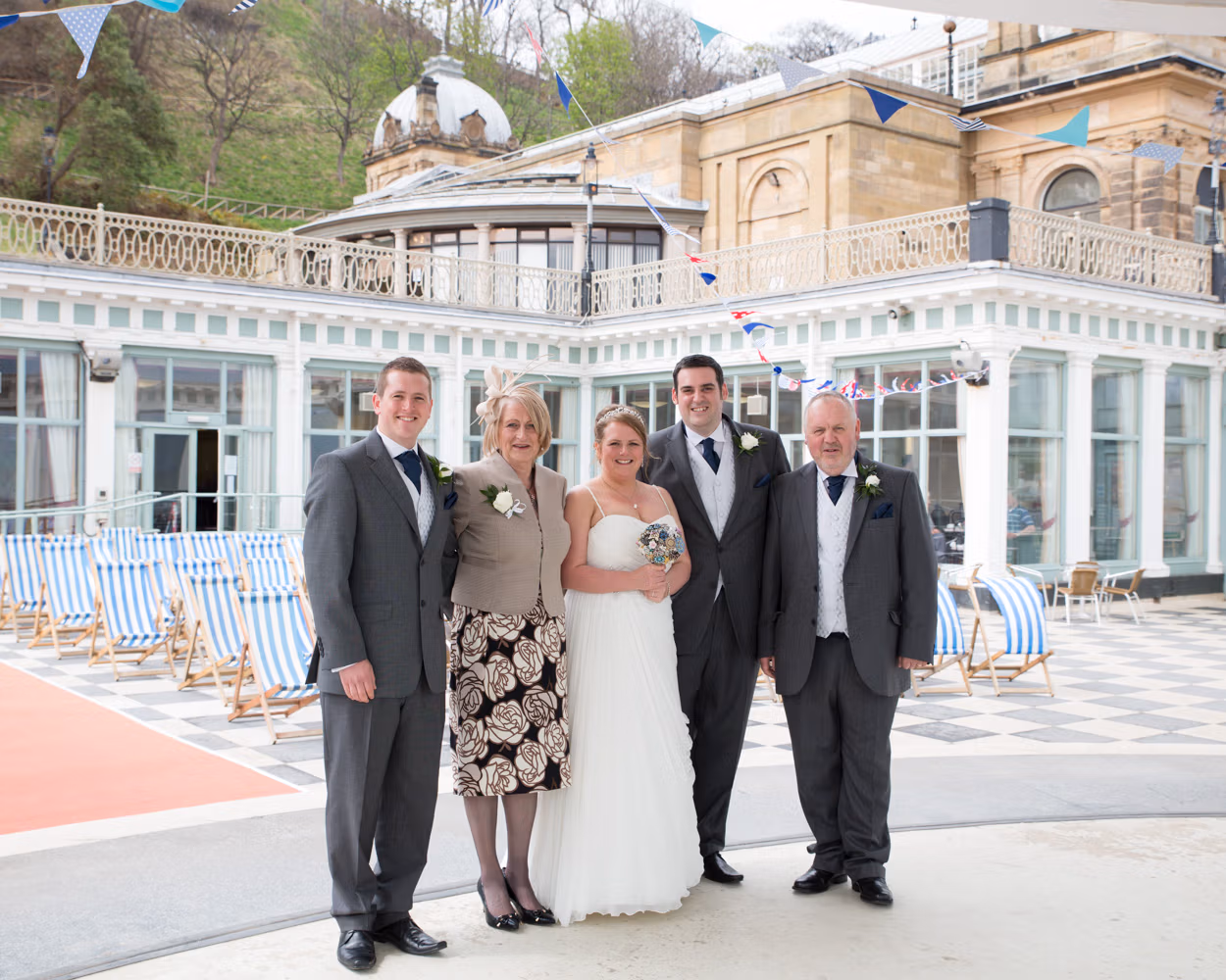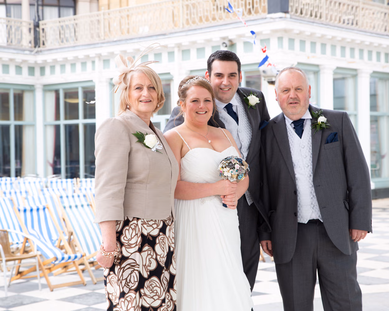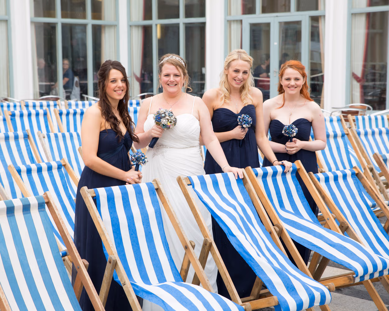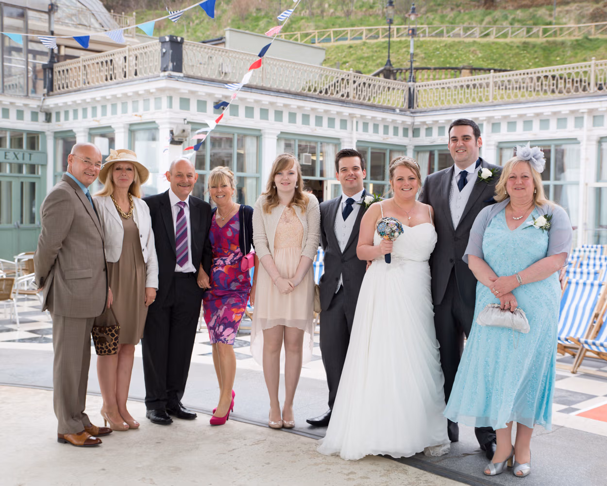 With the deckchairs and the Spa framing everything perfectly, the photos felt natural and unforced. Family gathered easily, laughter slipped in between frames, and the mood stayed playful — exactly right for a May wedding by the sea.