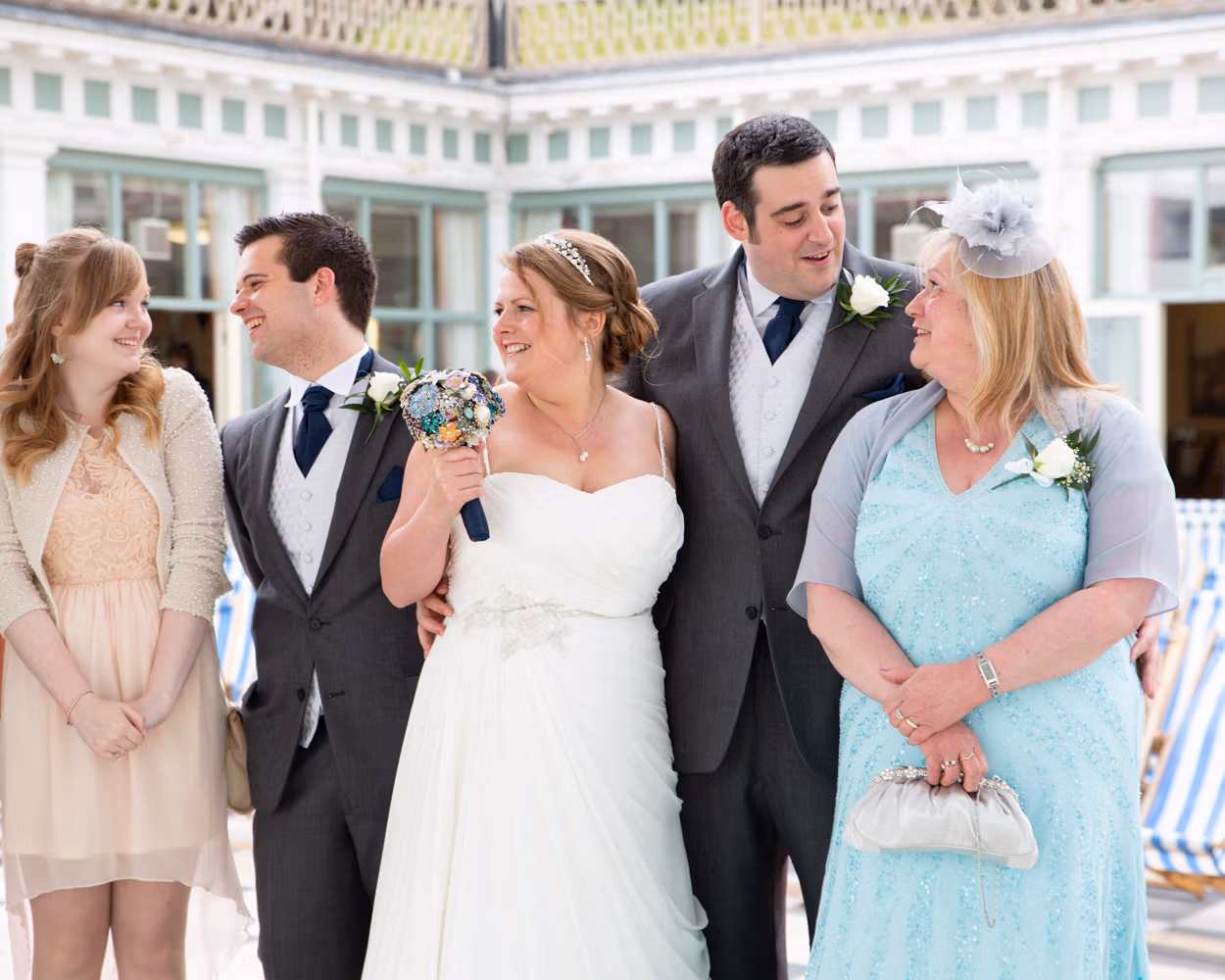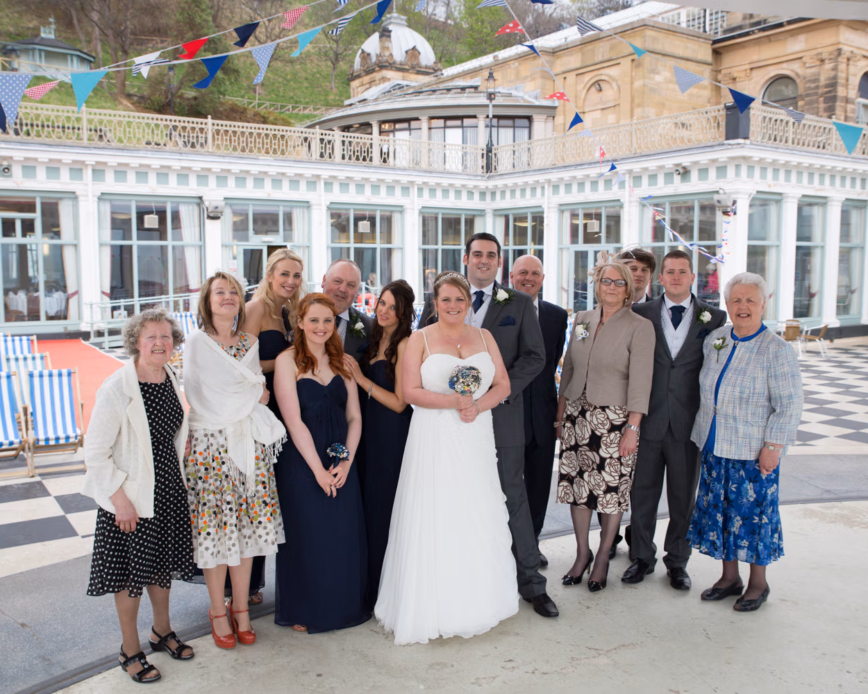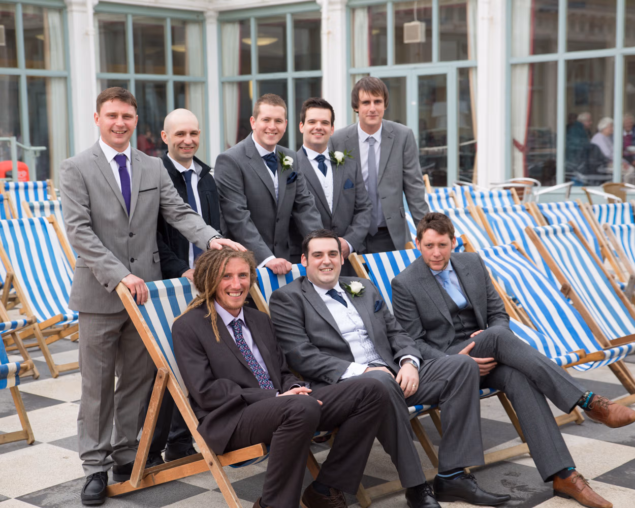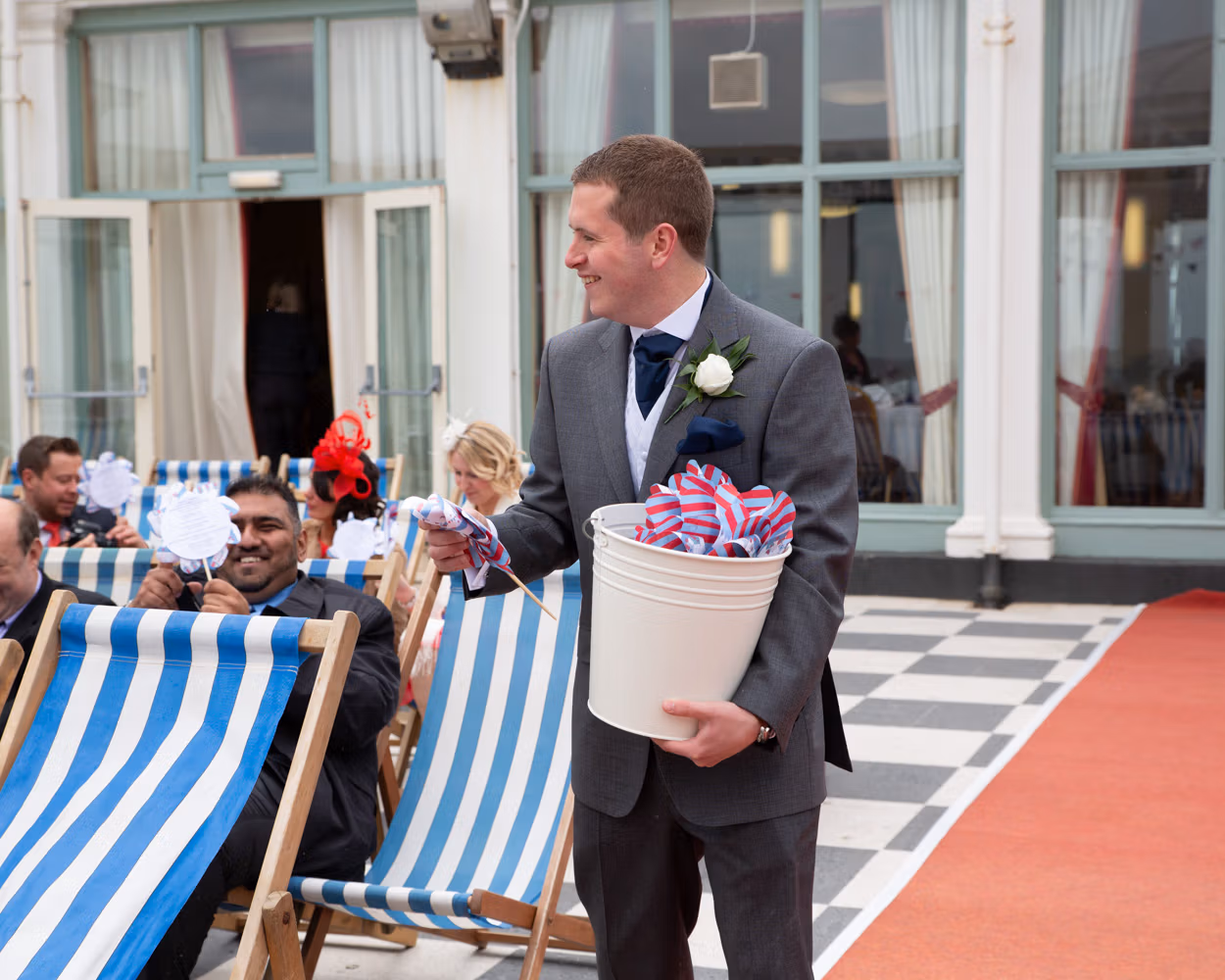 With the deckchairs and the Spa framing everything perfectly, the photos felt natural and unforced. Family gathered easily, laughter slipped in between frames, and the mood stayed playful — exactly right for a May wedding by the sea.