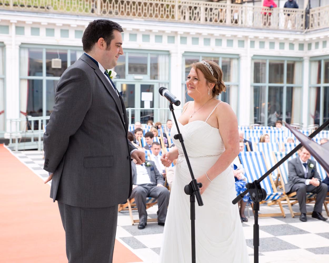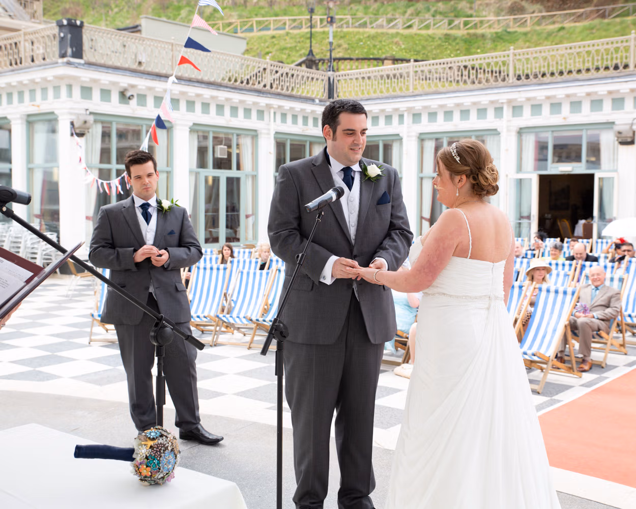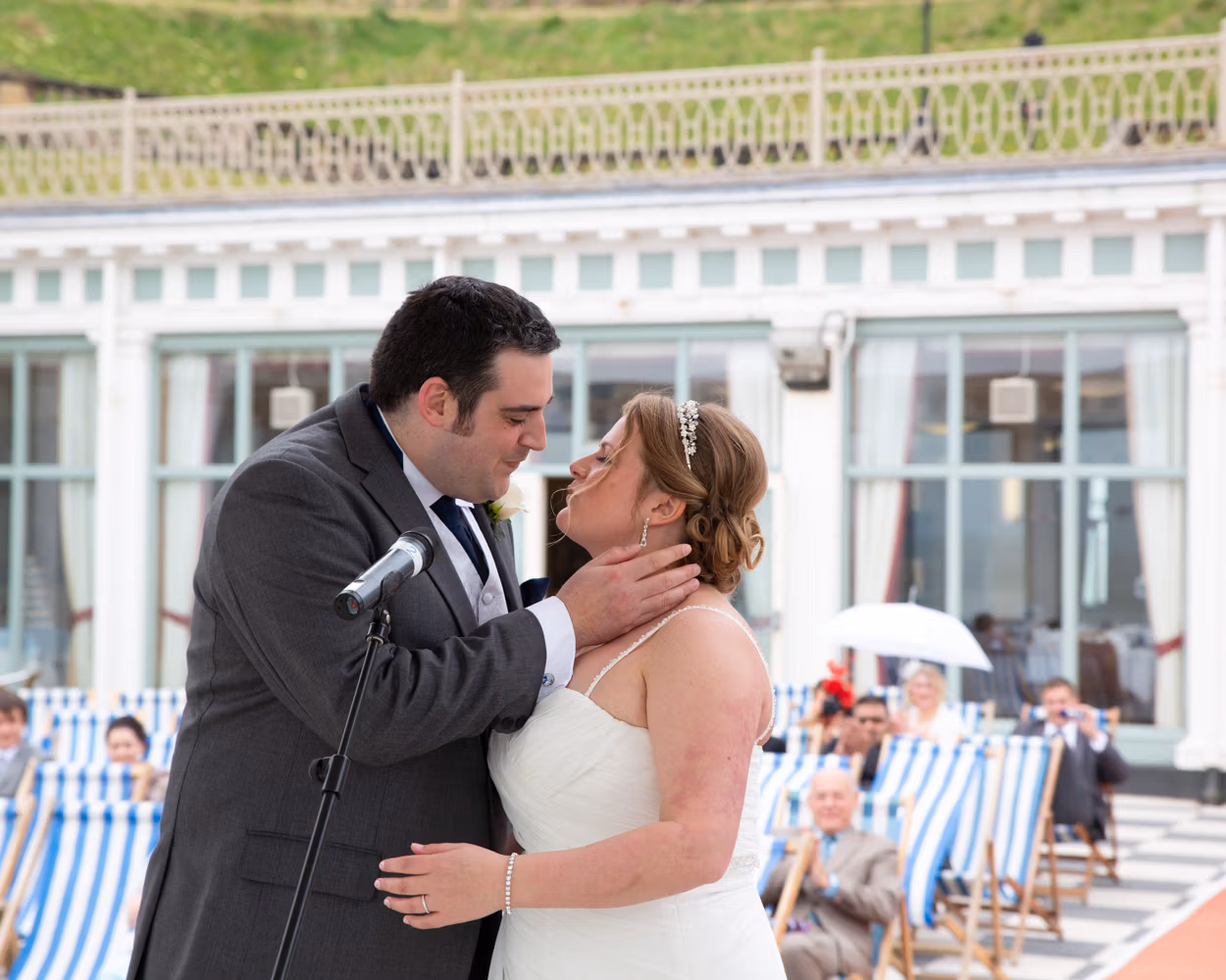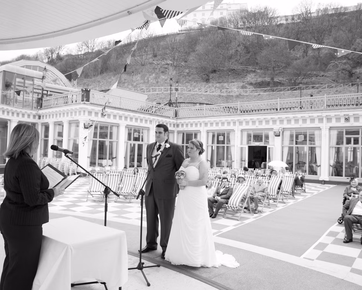 The ceremony took place outdoors, framed by the Victorian grandeur of Scarborough Spa and the steep hillside rising behind them. Guests sat in deckchairs, wrapped in sea air and anticipation, the setting feeling timeless and unmistakably seaside.
