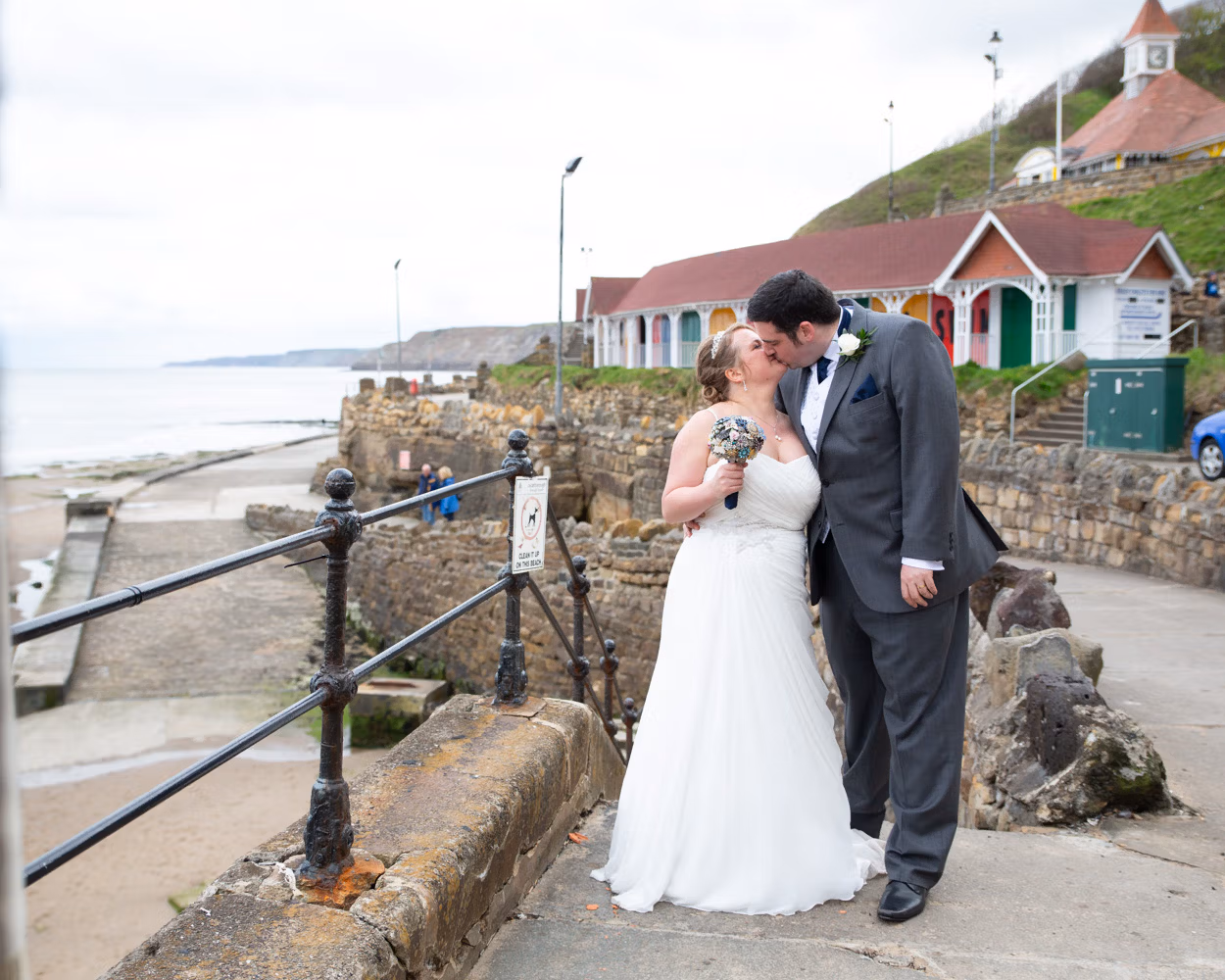 With no shortage of backdrops, we stepped straight outside and across the road for their couple portraits. Victorian railings and old lampposts lined the promenade, while the sandy beach and calm sea stretched out below. Moody skies rolled overhead, framing the coast perfectly.