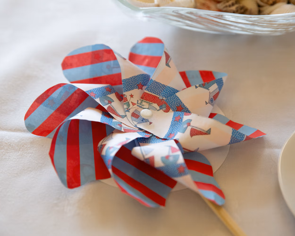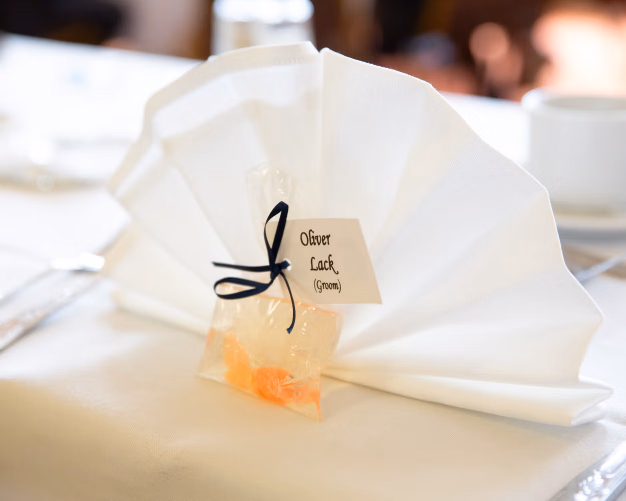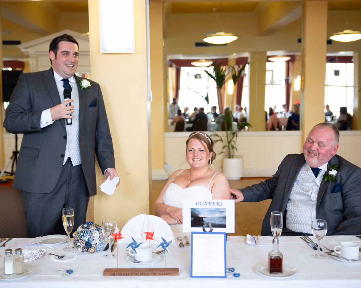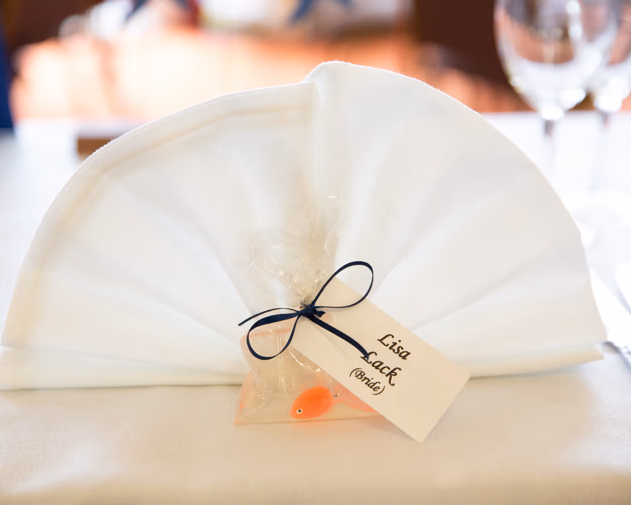 The room was full of small seaside details the moment guests arrived. Napkins folded into shells, faux goldfish floating gently in water as name tags, and candles nestled among real shells and windmills on the tables. Thoughtful, playful touches that felt completely in tune with the day.