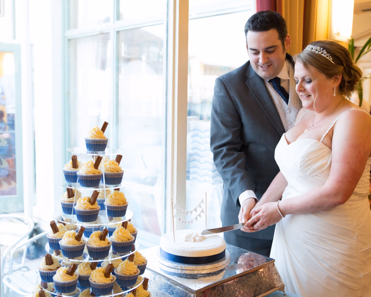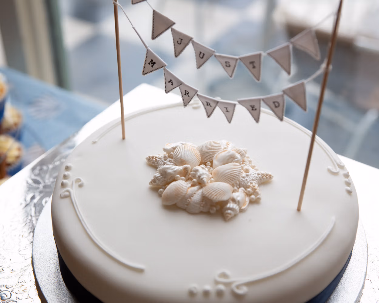 The wedding breakfast leaned fully into the seaside spirit. To begin, baguette with cheese and tomato salad was served around the tables, while nearby a tower of 99-flake–style cupcakes and a simple wedding cake sat waiting — finished with delicate shell details in the icing and photographed quietly before the room filled.