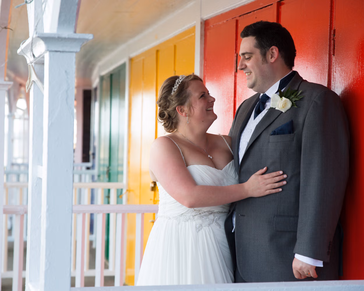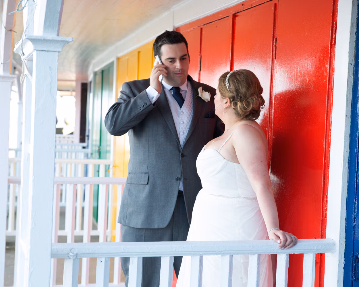 Later in the day, we stepped back outside for another short set of couple portraits — this time by the colourful beach cabins, along the promenade, and down toward the shoreline as the tide had fully come in.